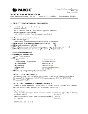 Nr karty : Wyroby z wełny kamiennej Strona 1 (5) Data: 01.12.2010 KARTA CHARAKTERYSTYKI (Karta charakterystyki zgodna z ISO 11014-1 i Dyrektywą UE 91/155 EEC) Poprzednia data: 19.06.2009 1. IDENTYFIKACJA WYROBU ORAZ FIRMY 1.1 Identyfikacja wyrobu lub substancji Nazwa handlowa Wełna kamienna PAROC ( produkowana w postaci granulatu) Numer rejestracyjny REACH 01-2119472313-44-0020 Paroc Polska sp. z o.o., Poland 1.2 Zastosowanie wyrobu/substancji 1.2.1 Stosowanie wyrobu Granulowana wełna kamienna głównie do izolacji budowlanych 1.2.2 Klasyfikacja działalności gospodarczej (NACE) 268 1.2.3 Kategoria stosowania (UC62) 32 1.2.4 Wyrób/substancja może być stosowany przez ogół społeczeństwa 1.2.5 Wyrób/substancja jest stosowany tylko przez ogół społeczeństwa tak - 1.3 Identyfikacja Producenta 1.3.1 Producent, importer, inny Paroc Polska sp. z o.o. 1.3.2 Dane kontaktowe: Adres ul. Gnieźnieńska 4 Kod pocztowy i miejscowość 62-240 Trzemeszno Numer telefonu +48 61 4682190 Numer faksu +48 61 4682304 Adres e-mail [email protected] NIP 526-18-72-546 1.3.3 Informacje o zagranicznych producentach 2. IDENTYFIKACJA ZAGROŻEŃ Włókna mineralne Paroc nie są klasyfikowane jako niebezpieczne dla zdrowia, zgodnie z Dyrektywą Unii Europejskiej 67/548/EEC, regulacją prawną (EC) No 1272/2008 i Dyrektywą 2009/2/EC. 3. SKŁAD ORAZ INFORMACJA O SKŁADNIKACH Wyroby z wełny kamiennej, uformowane w postaci luźnych strzępek lub granulatu, przeznaczone do izolacji budowlanych, termicznych i akustycznych. Wyrób zawiera: wełnę mineralną (obojętne, luźne, sztuczne włókna krzemianowe typu HT), spełniającą wymagania noty Q, 96 – 99 % lepiszcze organiczne (żywica fenolowo-formaldehydowa) 0 – 6% olej mineralny 0 – 0,4 % CAS/EC No: 650-016-00-2 Nr karty : Wyroby z wełny kamiennej Strona 2 (5) Data: 01.12.2010 KARTA CHARAKTERYSTYKI (Karta charakterystyki zgodna z ISO 11014-1 i Dyrektywą UE 91/155 EEC) Poprzednia data: 19.06.2009 4. PIERWSZA POMOC W przypadku podrażnienia skóry nie należy jej pocierać lub drapać. Opłukać pod bieżącą wodą, a następnie umyć słabym roztworem mydła. W przypadku podrażnienia oczu nie należy pocierać, jedynie przemyć pod bieżącą wodą. Gardło płukać pijąc wodę. Gdyby podrażnienie nie ustąpiło należy skontaktować się z lekarzem. 5. POSTĘPOWANIE W PRZYPADKU POŻARU Wyroby z wełny mineralnej (kamiennej) są klasyfikowane jako niepalne; nie stwarzają zagrożenia pożarowego. Jednakże materiał opakowań może się palić. 5.1 Odpowiednie środki gaśnicze: woda, piana, CO2, lub proszek 5.2 Nie ma specjalnych ograniczeń odnośnie użycia dowolnych środków gaśniczych 5.3 Produkty spalania: dwutlenek węgla, tlenek węgla, woda i gazy syntezowe 5.4 Środki indywidualne dla strażaków standardowe 6. POSTĘPOWANIE W PRZYPADKU NIEZAMIERZONEGO UWOLNIENIA DO ŚRODOWISKA Brak wymagań 7. OBCHODZENIE SIĘ Z WYROBEM I JEJ MAGAZYNOWANIE 7.1 Obchodzenie się z wyrobem - rozpakować na miejscu montażu, bezpośrednio przed użyciem - przy stosowaniu w pomieszczeniach niewentylowanych należy używać masek przeciwpylnych. - przy rozpakowaniu i wdmuchiwaniu używać odzieży ochronnej. Gdy wdmuchiwanie następuje ponad głową montażysty stosować okulary ochronne. Czyścić pomieszczenie odkurzaczem. Ręce obmyć wodą przed zasadniczym ich umyciem. - w miarę możliwości zapewnić dobrą wentylację 7.2 Magazynowanie - przechowywać w oryginalnym opakowaniu - chronić przed zniszczeniem i wpływami atmosferycznymi 8. KONTROLA NARAŻENIA I ŚRODKI OCHRONY OSOBISTEJ 8.1 Ochrona układu oddechowego Wg przepisów polskich (pkt. 15), jeśli poziom zapylenia przekracza limity, tzn. wartości NDS przekraczają 2 mg/m3 dla pyłu całkowitego i 1 wł/cm3 dla włókien respirabilnych należy stosować pół maseczki filtrujące. 8.2 Ochrona rąk Należy stosować odpowiednie rękawice, a przed ich nałożeniem starannie umyć i wysuszyć ręce, tak aby usunąć włókna. 8.3 Ochrona oczu Przy intensywnym pyleniu stosować okulary ochronne. 8.4 Ochrona skóry Nr karty : Wyroby z wełny kamiennej Strona 3 (5) Data: 01.12.2010 KARTA CHARAKTERYSTYKI (Karta charakterystyki zgodna z ISO 11014-1 i Dyrektywą UE 91/155 EEC) Poprzednia data: 19.06.2009 Aby przeciwdziałać ewentualnym podrażnieniom najlepiej nosić jednoczęściową luźną odzież ochronną z długimi rękawami i nogawkami. Zalecane jest również stosowanie okrycia głowy, szczególnie podczas prac montażowych ponad głową. Po zakończeniu wykonywania prac w silnie pylącym otoczeniu zaleca się kąpiel oraz zmianę odzieży 9. WŁAŚCIWOŚCI FIZYKOCHEMICZNE 9.1 Stan skupienia, barwa i zapach Ciało stałe, włókniste, brązowo-żółte, bez zapachu. 9.1.1 pH 7-8 (DIN 54275) 9.1.2 Temperatura / zakres topnienia W temperaturach powyżej 1000ºC włókno w wełnie kamiennej zaczyna mięknąć i topić się. Nie ma rzeczywistego punktu topnienia. 9.1.3 Temperatura rozkładu Lepiszcze ulega rozkładowi w temperaturze powyżej około 190ºC. 9.1.4 Temperatura zapłonu Nie dotyczy (wyrób niepalny) 9.1.5 Dopuszczalne wartości wybuchowości Nie dotyczy (wyrób niepalny) 9.1.5 Gęstość względna 20-100 kg/m3 9.1.6 Rozpuszczalność Wyroby są praktycznie nierozpuszczalne w wodzie i w roztworach organicznych. 10. TRWAŁOŚĆ I REAKTYWNOŚĆ Wyroby są chemicznie trwałe i nie wchodzą w reakcję. 10.1 Produkty termolizy Gdy wełna mineralna podgrzewana jest powyżej około 190ºC, lepiszcze zaczyna się rozkładać i można to rozpoznać po zapachu. Emisja występuje zwykle jedynie podczas pierwszych ogrzewań i trwa tylko przez chwilę. Zapewnić dobrą wentylację dopóki zapach jest wyczuwalny. Unikać przebywania w nieprzyjemnym dymie. W razie potrzeby używać środki ochrony osobistej zgodnie z punktem 8. 11. DANE TOKSYKOLOGICZNE 11.1 Ostra toksyczność Brak, jeśli włókna są wdychane, połykane lub w kontakcie ze skórą lub oczami podczas normalnego używania wyrob