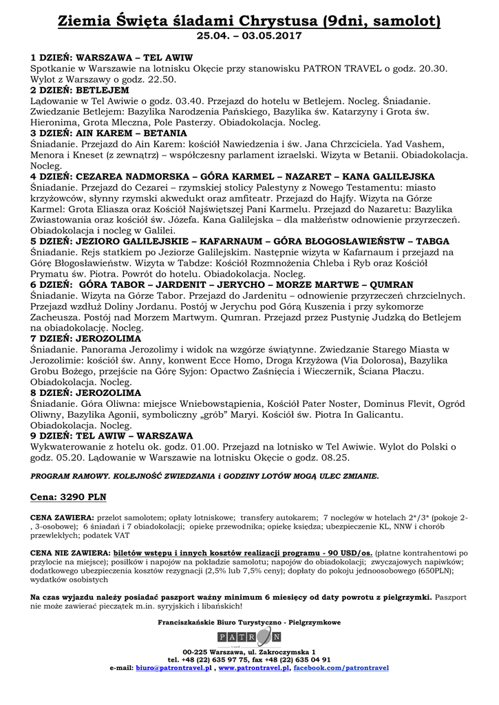 Ziemia Święta śladami Chrystusa (9dni, samolot) 25.04. – 03.05.2017 1 DZIEŃ: WARSZAWA – TEL AWIW Spotkanie w Warszawie na lotnisku Okęcie przy stanowisku PATRON TRAVEL o godz. 20.30. Wylot z Warszawy o godz. 22.50. 2 DZIEŃ: BETLEJEM Lądowanie w Tel Awiwie o godz. 03.40. Przejazd do hotelu w Betlejem. Nocleg. Śniadanie. Zwiedzanie Betlejem: Bazylika Narodzenia Pańskiego, Bazylika św. Katarzyny i Grota św. Hieronima, Grota Mleczna, Pole Pasterzy. Obiadokolacja. Nocleg. 3 DZIEŃ: AIN KAREM – BETANIA Śniadanie. Przejazd do Ain Karem: kościół Nawiedzenia i św. Jana Chrzciciela. Yad Vashem, Menora i Kneset (z zewnątrz) – współczesny parlament izraelski. Wizyta w Betanii. Obiadokolacja. Nocleg. 4 DZIEŃ: CEZAREA NADMORSKA – GÓRA KARMEL – NAZARET – KANA GALILEJSKA Śniadanie. Przejazd do Cezarei – rzymskiej stolicy Palestyny z Nowego Testamentu: miasto krzyżowców, słynny rzymski akwedukt oraz amfiteatr. Przejazd do Hajfy. Wizyta na Górze Karmel: Grota Eliasza oraz Kościół Najświętszej Pani Karmelu. Przejazd do Nazaretu: Bazylika Zwiastowania oraz kościół św. Józefa. Kana Galilejska – dla małżeństw odnowienie przyrzeczeń. Obiadokolacja i nocleg w Galilei. 5 DZIEŃ: JEZIORO GALILEJSKIE – KAFARNAUM – GÓRA BŁOGOSŁAWIEŃSTW – TABGA Śniadanie. Rejs statkiem po Jeziorze Galilejskim. Następnie wizyta w Kafarnaum i przejazd na Górę Błogosławieństw. Wizyta w Tabdze: Kościół Rozmnożenia Chleba i Ryb oraz Kościół Prymatu św. Piotra. Powrót do hotelu. Obiadokolacja. Nocleg. 6 DZIEŃ: GÓRA TABOR – JARDENIT – JERYCHO – MORZE MARTWE – QUMRAN Śniadanie. Wizyta na Górze Tabor. Przejazd do Jardenitu – odnowienie przyrzeczeń chrzcielnych. Przejazd wzdłuż Doliny Jordanu. Postój w Jerychu pod Górą Kuszenia i przy sykomorze Zacheusza. Postój nad Morzem Martwym. Qumran. Przejazd przez Pustynię Judzką do Betlejem na obiadokolację. Nocleg. 7 DZIEŃ: JEROZOLIMA Śniadanie. Panorama Jerozolimy i widok na wzgórze świątynne. Zwiedzanie Starego Miasta w Jerozolimie: kościół św. Anny, konwent Ecce Homo, Droga Krzyżowa (Via Dolorosa), Bazylika Grobu Bożego, przejście na Górę Syjon: Opactwo Zaśnięcia i Wieczernik, Ściana Płaczu. Obiadokolacja. Nocleg. 8 DZIEŃ: JEROZOLIMA Śniadanie. Góra Oliwna: miejsce Wniebowstąpienia, Kościół Pater Noster, Dominus Flevit, Ogród Oliwny, Bazylika Agonii, symboliczny „grób” Maryi. Kościół św. Piotra In Galicantu. Obiadokolacja. Nocleg. 9 DZIEŃ: TEL AWIW – WARSZAWA Wykwaterowanie z hotelu ok. godz. 01.00. Przejazd na lotnisko w Tel Awiwie. Wylot do Polski o godz. 05.20. Lądowanie w Warszawie na lotnisku Okęcie o godz. 08.25. PROGRAM RAMOWY. KOLEJNOŚĆ ZWIEDZANIA i GODZINY LOTÓW MOGĄ ULEC ZMIANIE. Cena: 3290 PLN CENA ZAWIERA: przelot samolotem; opłaty lotniskowe; transfery autokarem; 7 noclegów w hotelach 2*/3* (pokoje 2, 3-osobowe); 6 śniadań i 7 obiadokolacji; opiekę przewodnika; opiekę księdza; ubezpieczenie KL, NNW i chorób przewlekłych; podatek VAT CENA NIE ZAWIERA: biletów wstępu i innych kosztów realizacji programu - 90 USD/os. (płatne kontrahentowi po przylocie na miejsce); posiłków i napojów na pokładzie samolotu; napojów do obiadokolacji; zwyczajowych napiwków; dodatkowego ubezpieczenia kosztów rezygnacji (2,5% lub 7,5% ceny); dopłaty do pokoju jednoosobowego (650PLN); wydatków osobistych Na czas wyjazdu należy posiadać paszport ważny minimum 6 miesięcy od daty powrotu z pielgrzymki. Paszport nie może zawierać pieczątek m.in. syryjskich i libańskich! Franciszkańskie Biuro Turystyczno - Pielgrzymkowe 00-225 Warszawa, ul. Zakroczymska 1 tel. +48 (22) 635 97 75, fax +48 (22) 635 04 91 e-mail: [email protected] , www.patrontravel.pl, facebook.com/patrontravel