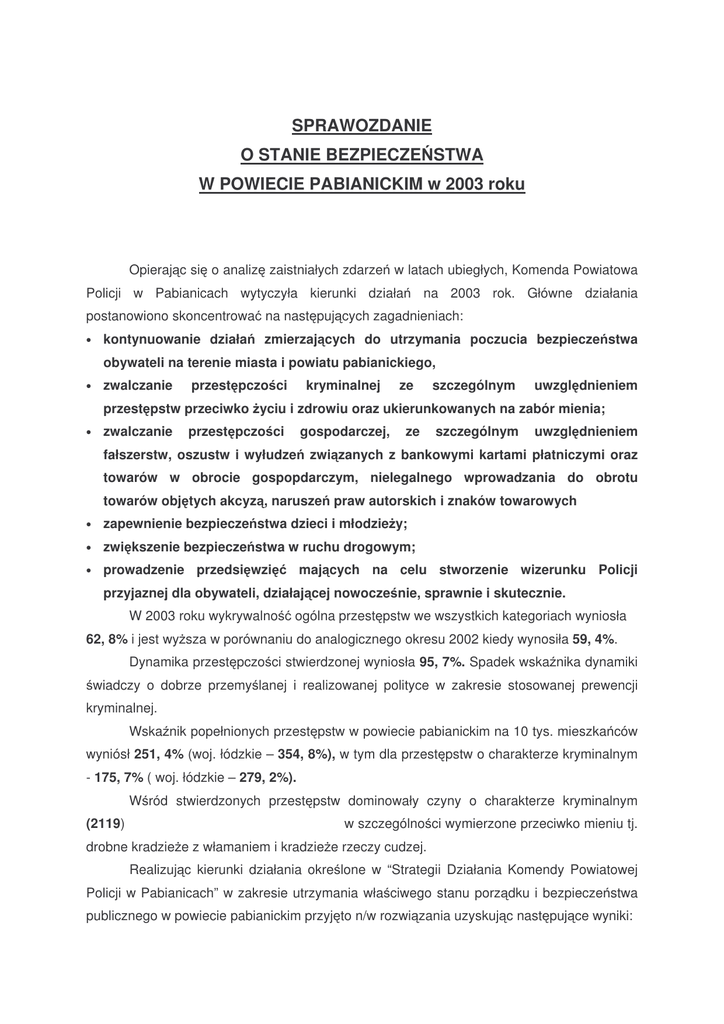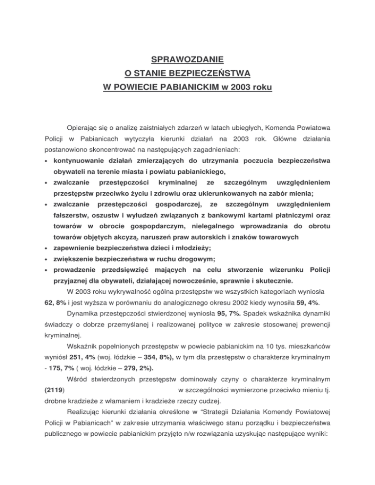 SPRAWOZDANIE O STANIE BEZPIECZE STWA W POWIECIE PABIANICKIM w 2003 roku Opieraj c si o analiz zaistniałych zdarze w latach ubiegłych, Komenda Powiatowa Policji w Pabianicach wytyczyła kierunki działa na 2003 rok. Główne działania postanowiono skoncentrowa na nast puj cych zagadnieniach: • kontynuowanie działa zmierzaj cych do utrzymania poczucia bezpiecze stwa obywateli na terenie miasta i powiatu pabianickiego, • zwalczanie przest pczo ci kryminalnej ze szczególnym uwzgl dnieniem przest pstw przeciwko yciu i zdrowiu oraz ukierunkowanych na zabór mienia; • zwalczanie przest pczo ci gospodarczej, fałszerstw, oszustw i wyłudze ze szczególnym uwzgl dnieniem zwi zanych z bankowymi kartami płatniczymi oraz towarów w obrocie gospopdarczym, nielegalnego wprowadzania do obrotu towarów obj tych akcyz , narusze praw autorskich i znaków towarowych • zapewnienie bezpiecze stwa dzieci i młodzie y; • zwi kszenie bezpiecze stwa w ruchu drogowym; • prowadzenie przedsi wzi maj cych na celu stworzenie wizerunku Policji przyjaznej dla obywateli, działaj cej nowocze nie, sprawnie i skutecznie. W 2003 roku wykrywalno ogólna przest pstw we wszystkich kategoriach wyniosła 62, 8% i jest wy sza w porównaniu do analogicznego okresu 2002 kiedy wynosiła 59, 4%. Dynamika przest pczo ci stwierdzonej wyniosła 95, 7%. Spadek wska nika dynamiki wiadczy o dobrze przemy lanej i realizowanej polityce w zakresie stosowanej prewencji kryminalnej. Wska nik popełnionych przest pstw w powiecie pabianickim na 10 tys. mieszka ców wyniósł 251, 4% (woj. łódzkie – 354, 8%), w tym dla przest pstw o charakterze kryminalnym - 175, 7% ( woj. łódzkie – 279, 2%). W ród stwierdzonych przest pstw dominowały czyny o charakterze kryminalnym (2119) w szczególno ci wymierzone przeciwko mieniu tj. drobne kradzie e z włamaniem i kradzie e rzeczy cudzej. Realizuj c kierunki działania okre lone w “Strategii Działania Komendy Powiatowej Policji w Pabianicach” w zakresie utrzymania wła ciwego stanu porz dku i bezpiecze stwa publicznego w powiecie pabianickim przyj to n/w rozwi zania uzyskuj c nast puj ce wyniki: I. Kontynuowanie działa zmierzaj cych do utrzymania poczucia bezpiecze stwa obywateli na terenie miasta i powiatu pabianickiego, a przede wszystkim w wyznaczonych strefach bezpiecze stwa Na pocz tku 2001 roku rozpocz to realizacj programu w ramach współpracy bilateralnej Polska – Holandia, obj tego patronatem Komendanta Głównego Policji, maj cego na celu ograniczenie włama do obiektów administrowanych przez spółdzielni mieszkaniow . Program pilota owy realizowany był do kwietnia 2003r. Realizacja tego programu dała dobre efekty w postaci spadku o 80% liczby włama do obiektów znajduj cych si w zasobach Pabianickiej Spółdzielni Mieszakniowej. Wiele jednostek policji w kraju korzysta ze zdobytych przez nas do wiadcze w zakresie ograniczania włama . Policjanci holenderscy wzoruj c si na naszych rozwi zaniach dotycz cych bezpiecze stwa dzieci oraz form kontaktu policji ze szkołami i nauczycielami stosuj je w swojej działalno ci zawodowej. Ró nimy si w kwestii podej cia do zapewnienia bezpiecze stwa dzieciom i młodzie y. Trzeba podkre li , i w naszych szkołach nie s budowane wysokie, szczelne ogrodzenia jak równie nie zachodzi potrzeba wprowadzenia systemu monitorowania szatni, korytarzy, sal lekcyjnych, adna te szkoła nie spotkała si ze stał opiek policjanta, tak jak ma to miejsce w niektórych krajach. Praca pabianickich policjantów nastawiona jest przede wszystkim na współprac ze szkołami, pedagogami szkolnymi, nauczycielami, dlatego te cz sto organizowane s pogramy prewencyjne spotkania z dzie mi i młodzie (pomimo braku pieni dzy , realizowane ró nego rodzaju na te przedsi wzi cia). Poziom bezpiecze stwa w szkołach jest zadawalaj cy i s dzimy, e młodzie nie znajdzie si takim poziomie deprawacji, aby my musieli podj stawiania wysokich ogrodze na rodki zapobiegawcze w postaci i rozbudowanego do przesady monitorowania szkół. ycie b dzie najlepszym egzaminatorem i poka e, która koncepcja jest słuszna. Dzi ki programowi utworzono szerok profilaktyczne, w których wiod c rol lokaln koalicj wł czaj c si w działania pełnili Starosta i Prezydent Miasta Pabianic. Nawi zane przy okazji realizacji programu wi zi społeczne mi dzy współdziałaj cymi podmiotami przyniosły efekt zarówno w rozwi zywaniu problemów lokalnych wspólnot, jak równie uzmysłowiły mieszka com, e do zapewnienia bezpiecze stwa w swoim najbli szym otoczeniu niezwykle wa ne jest osobiste zaanga owanie si w walk z przest pczo ci . Serdeczne podzi kowania za sponsorowanie naszych programów nale si ni ej wymienionym instytucjom: PZU, PSM Pabianice, Polfa, Pamso, PKO, Suwary, Ferrum, Gminna Spółdzielnia, Grawik. Wychodz c na przeciw powszechnym oczekiwaniom zwi zanym z konieczno ci poprawy obecnego stanu bezpiecze stwa, eliminacji przesłanek sprzyjaj cych aktywizacji działa przest pczych - w oparciu o dotychczasowe do wiadczenia oraz nadania dalszej współpracy charakteru planowego działnia, a przede wszystkim maksymalnego zaanga owania podmiotów maj cych wpływ na bezpiecze stwo, opracowano program pt. “Bezpiecze stwo w otwartych przestrzeniach”. Podstawy funkcjonowania tego programu stworzono w trakcie otwartej debaty na spotkaniu zorganizowanym przez kierownictwo KPP Pabianice z władzami samorz dowymi powiatu w dniu 06 marca 2003 roku. Prowadzona na bie co analiza stanu bezpiecze stwa na terenie powiatu pozwoliła na wła ciwe planowanie dyslokacji słu by i maksymalne wykorzystanie sił i rodków b d cych w dyspozycji KPP Pabianice kieruj c je w miejsca szczególnie zagro one Tak prowadzone działania prewencyjne pozwoliły osi gn pozytywne wyniki, wymienione wy ej. Dobitnym przykładem wła ciwego pełnienia słu by przez policjantów jest fakt, e w 2003 roku dokonano zatrzymania na gor cym uczynku 694 sprawców przest pstw. W ramach działa prewencyjnych policjanci p