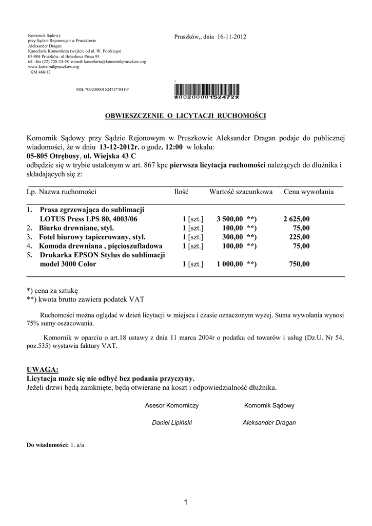 Komornik Sądowy przy Sądzie Rejonowym w Pruszkowie Aleksander Dragan Kancelaria Komornicza (wejście od ul. W. Polskiego) 05-804 Pruszków, ul.Bolesława Prusa 93 tel. /fax (22) 728-24-98 e-mail: [email protected] www.komornikpruszkow.org KM 466/12 Pruszków,, dnia 16-11-2012 #DL *0020000152472*/0419/ *0020000152472* OBWIESZCZENIE O LICYTACJI RUCHOMOŚCI Komornik Sądowy przy Sądzie Rejonowym w Pruszkowie Aleksander Dragan podaje do publicznej wiadomości, że w dniu 13-12-2012r. o godz. 12:00 w lokalu: 05-805 Otrębusy, ul. Wiejska 43 C odbędzie się w trybie ustalonym w art. 867 kpc pierwsza licytacja ruchomości należących do dłużnika i składających się z: ____________________________________________________________________________________ Lp. Nazwa ruchomości Ilość Wartość szacunkowa Cena wywołania _____________________________________________________________________________________ 1. Prasa zgrzewająca do sublimacji LOTUS Press LPS 80, 4003/06 1 [szt.] 3 500,00 **) 2 625,00 2. Biurko drewniane, styl. 1 [szt.] 100,00 **) 75,00 3. Fotel biurowy tapicerowany, styl. 1 [szt.] 300,00 **) 225,00 4. Komoda drewniana , pięcioszufladowa 1 [szt.] 100,00 **) 75,00 5. Drukarka EPSON Stylus do sublimacji model 3000 Color 1 [szt.] 1 000,00 **) 750,00 _____________________________________________________________________________________ *) cena za sztukę **) kwota brutto zawiera podatek VAT Ruchomości można oglądać w dzień licytacji w miejscu i czasie oznaczonym wyżej. Suma wywołania wynosi 75% sumy oszacowania. Komornik w oparciu o art.18 ustawy z dnia 11 marca 2004r o podatku od towarów i usług (Dz.U. Nr 54, poz.535) wystawia faktury VAT. UWAGA: Licytacja może się nie odbyć bez podania przyczyny. Jeżeli drzwi będą zamknięte, będą otwierane na koszt i odpowiedzialność dłużnika. Asesor Komorniczy Komornik Sądowy Daniel Lipiński Aleksander Dragan Do wiadomości: 1. a/a 1