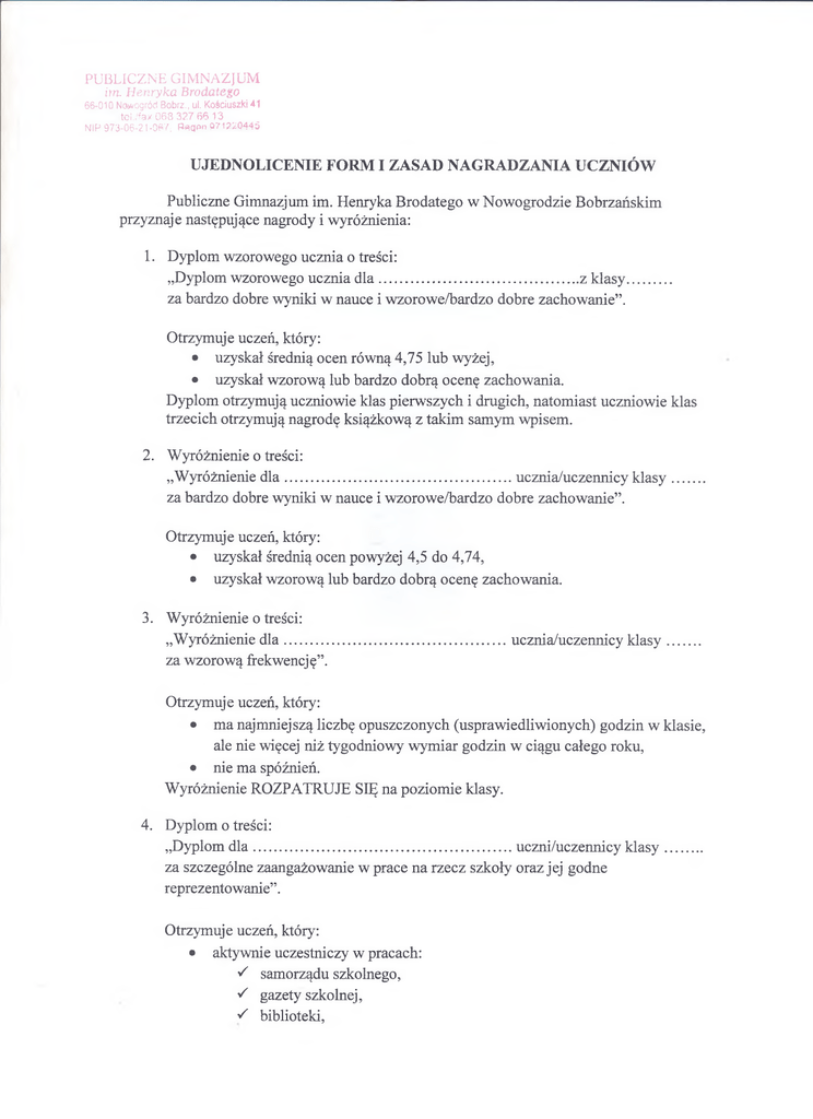 PUBLICZNE GIMNAZJUM im. Henryka Brodatego 66-010 Nowogród Bobrz., ul. Kościuszki 41 tei./fax 068 327 56 13 NIP 973-06-21-067; Regwi 971220445 UJEDNOLICENIE FORM I ZASAD NAGRADZANIA UCZNIÓW Publiczne Gimnazjum im. Henryka Brodatego w Nowogrodzie Bobrzańskim przyznaje następujące nagrody i wyróżnienia: 1. Dyplom wzorowego ucznia o treści: „Dyplom wzorowego ucznia d la ...................................................... z klasy............ za bardzo dobre wyniki w nauce i wzorowe/bardzo dobre zachowanie” . Otrzymuje uczeń, który: • uzyskał średnią ocen równą 4,75 lub wyżej, • uzyskał wzorową lub bardzo dobrą ocenę zachowania. Dyplom otrzymują uczniowie klas pierwszych i drugich, natomiast uczniowie klas trzecich otrzymują nagrodę książkową z takim samym wpisem. 2. Wyróżnienie o treści: „Wyróżnienie d l a ............................................................. ucznia/uczennicy k la sy .......... za bardzo dobre wyniki w nauce i wzorowe/bardzo dobre zachowanie”. Otrzymuje uczeń, który: • uzyskał średnią ocen powyżej 4,5 do 4,74, • uzyskał wzorową lub bardzo dobrą ocenę zachowania. 3. Wyróżnienie o treści: „Wyróżnienie d l a ............................................................ ucznia/uczennicy k la s y .......... za wzorową frekwencję”. Otrzymuje uczeń, który: • ma najmniejszą liczbę opuszczonych (usprawiedliwionych) godzin w klasie, ale nie więcej niż tygodniowy wymiar godzin w ciągu całego roku, • nie ma spóźnień. Wyróżnienie ROZPATRUJE SIĘ na poziomie klasy. 4. Dyplom o treści: „Dyplom d l a ...................................................................... uczni/uczennicy k la s y ........... za szczególne zaangażowanie w prace na rzecz szkoły oraz jej godne reprezentowanie”. Otrzymuje uczeń, który: • aktywnie uczestniczy w pracach: S samorządu szkolnego, S gazety szkolnej, ■/ biblioteki, świetlicy, chóru szkolnego, telewizji szkolnej i administrowaniu szkolną stroną internetową, kabaretu szkolnego, szkolnego koła „Caritas”, wolontariatu. • reprezentuje szkołę w: ■S poczcie sztandarowym, S poczcie flagowym, S konkursach przedmiotowych i olimpiadach (co najmniej na szczeblu rejonowym), • / akademiach i uroczystościach szkolnych i pozaszkolnych, •S międzynarodowej wymianie uczniów. Dyplom otrzymuje uczeń, który odznacza się szczególnym zaangażowaniem w wykonywaną pracę. S ■S S •S S S Dyplom i statuetka najlepszego absolwenta o treści: „Dyplom d la ............................................................................. uczni/uczennicy klasy za uzyskanie tytułu „Najlepszego Absolwenta” Publicznego Gimnazjum im. Henryka Brodatego w Nowogrodzie Bobrzańskim w roku szkolnym.......................... Otrzymuje uczeń, który: • uzyskał najwyższy wynik z egzaminów zewnętrznych, • uzyskał najwyższą średnią ocen w klasie trzeciej, • jest laureatem lub finalistą olimpiad i konkursów przedmiotowych, • angażuje się w życie społeczne szkoły. Uczeń powinien spełniać trzy spośród czterech wymienionych kryteriów. D Y R E K T O R GIMNA7TTIM mgr Zofia Nowicka