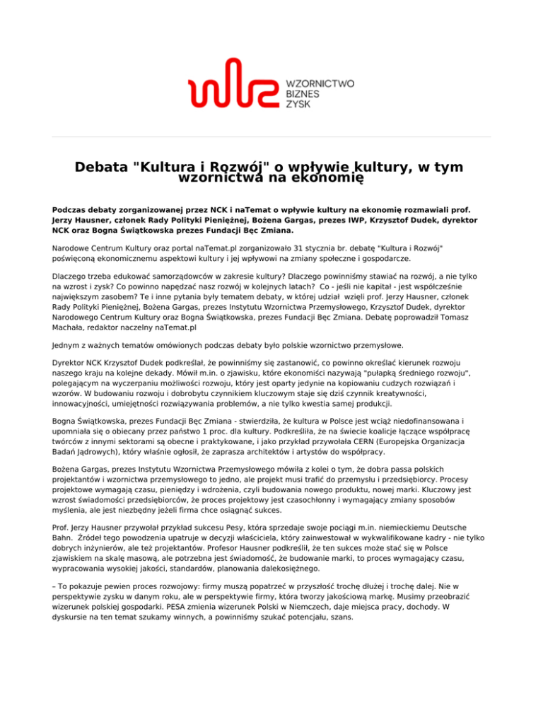 Debata "Kultura i Rozwój" o wpływie kultury, w tym wzornictwa na ekonomię Podczas debaty zorganizowanej przez NCK i naTemat o wpływie kultury na ekonomię rozmawiali prof. Jerzy Hausner, członek Rady Polityki Pieniężnej, Bożena Gargas, prezes IWP, Krzysztof Dudek, dyrektor NCK oraz Bogna Świątkowska prezes Fundacji Bęc Zmiana. Narodowe Centrum Kultury oraz portal naTemat.pl zorganizowało 31 stycznia br. debatę "Kultura i Rozwój" poświęconą ekonomicznemu aspektowi kultury i jej wpływowi na zmiany społeczne i gospodarcze. Dlaczego trzeba edukować samorządowców w zakresie kultury? Dlaczego powinniśmy stawiać na rozwój, a nie tylko na wzrost i zysk? Co powinno napędzać nasz rozwój w kolejnych latach? Co - jeśli nie kapitał - jest współcześnie największym zasobem? Te i inne pytania były tematem debaty, w której udział wzięli prof. Jerzy Hausner, członek Rady Polityki Pieniężnej, Bożena Gargas, prezes Instytutu Wzornictwa Przemysłowego, Krzysztof Dudek, dyrektor Narodowego Centrum Kultury oraz Bogna Świątkowska, prezes Fundacji Bęc Zmiana. Debatę poprowadził Tomasz Machała, redaktor naczelny naTemat.pl Jednym z ważnych tematów omówionych podczas debaty było polskie wzornictwo przemysłowe. Dyrektor NCK Krzysztof Dudek podkreślał, że powinniśmy się zastanowić, co powinno określać kierunek rozwoju naszego kraju na kolejne dekady. Mówił m.in. o zjawisku, które ekonomiści nazywają "pułapką średniego rozwoju", polegającym na wyczerpaniu możliwości rozwoju, który jest oparty jedynie na kopiowaniu cudzych rozwiązań i wzorów. W budowaniu rozwoju i dobrobytu czynnikiem kluczowym staje się dziś czynnik kreatywności, innowacyjności, umiejętności rozwiązywania problemów, a nie tylko kwestia samej produkcji. Bogna Świątkowska, prezes Fundacji Bęc Zmiana - stwierdziła, że kultura w Polsce jest wciąż niedofinansowana i upomniała się o obiecany przez państwo 1 proc. dla kultury. Podkreśliła, że na świecie koalicje łączące współpracę twórców z innymi sektorami są obecne i praktykowane, i jako przykład przywołała CERN (Europejska Organizacja Badań Jądrowych), który właśnie ogłosił, że zaprasza architektów i artystów do współpracy. Bożena Gargas, prezes Instytutu Wzornictwa Przemysłowego mówiła z kolei o tym, że dobra passa polskich projektantów i wzornictwa przemysłowego to jedno, ale projekt musi trafić do przemysłu i przedsiębiorcy. Procesy projektowe wymagają czasu, pieniędzy i wdrożenia, czyli budowania nowego produktu, nowej marki. Kluczowy jest wzrost świadomości przedsiębiorców, że proces projektowy jest czasochłonny i wymagający zmiany sposobów myślenia, ale jest niezbędny jeżeli firma chce osiągnąć sukces. Prof. Jerzy Hausner przywołał przykład sukcesu Pesy, która sprzedaje swoje pociągi m.in. niemieckiemu Deutsche Bahn. Źródeł tego powodzenia upatruje w decyzji właściciela, który zainwestował w wykwalifikowane kadry - nie tylko dobrych inżynierów, ale też projektantów. Profesor Hausner podkreślił, że ten sukces może stać się w Polsce zjawiskiem na skalę masową, ale potrzebna jest świadomość, że budowanie marki, to proces wymagający czasu, wypracowania wysokiej jakości, standardów, planowania dalekosiężnego. – To pokazuje pewien proces rozwojowy: firmy muszą popatrzeć w przyszłość trochę dłużej i trochę dalej. Nie w perspektywie zysku w danym roku, ale w perspektywie firmy, która tworzy jakościową markę. Musimy przeobrazić wizerunek polskiej gospodarki. PESA zmienia wizerunek Polski w Niemczech, daje miejsca pracy, dochody. W dyskursie na ten temat szukamy winnych, a powinniśmy szukać potencjału, szans. Rozmówcy zwracali uwagę, że przedsiębiorcy polscy są odważni, tylko warto znaleźć sposób komunikacji między nimi a ludźmi kultury i pokazać im, najlepiej na przykładach, jak kultura rozwija biznes. Całą debatę można obejrzeć na portalu naTemat fot. PESA