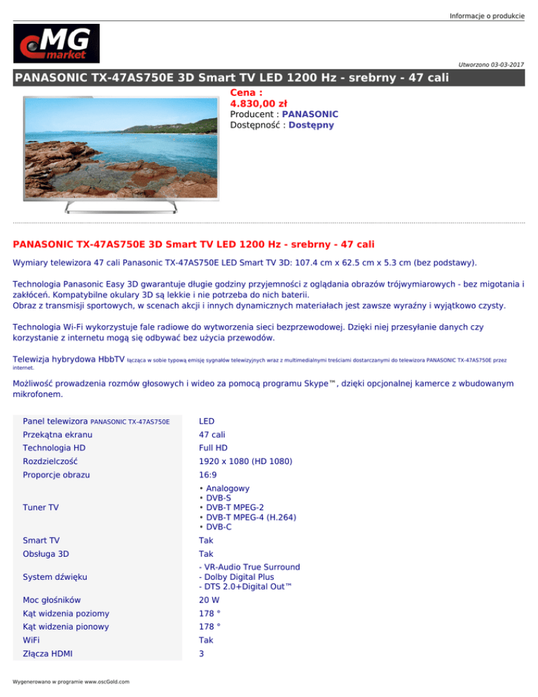 Informacje o produkcie Utworzono 03-03-2017 PANASONIC TX-47AS750E 3D Smart TV LED 1200 Hz - srebrny - 47 cali Cena : 4.830,00 zł Producent : PANASONIC Dostępność : Dostępny PANASONIC TX-47AS750E 3D Smart TV LED 1200 Hz - srebrny - 47 cali Wymiary telewizora 47 cali Panasonic TX-47AS750E LED Smart TV 3D: 107.4 cm x 62.5 cm x 5.3 cm (bez podstawy). Technologia Panasonic Easy 3D gwarantuje długie godziny przyjemności z oglądania obrazów trójwymiarowych - bez migotania i zakłóceń. Kompatybilne okulary 3D są lekkie i nie potrzeba do nich baterii. Obraz z transmisji sportowych, w scenach akcji i innych dynamicznych materiałach jest zawsze wyraźny i wyjątkowo czysty. Technologia Wi-Fi wykorzystuje fale radiowe do wytworzenia sieci bezprzewodowej. Dzięki niej przesyłanie danych czy korzystanie z internetu mogą się odbywać bez użycia przewodów. Telewizja hybrydowa HbbTV łącząca w sobie typową emisję sygnałów telewizyjnych wraz z multimedialnymi treściami dostarczanymi do telewizora PANASONIC TX-47AS750E przez internet. Możliwość prowadzenia rozmów głosowych i wideo za pomocą programu Skype™, dzięki opcjonalnej kamerce z wbudowanym mikrofonem. Panel telewizora PANASONIC TX-47AS750E LED Przekątna ekranu 47 cali Technologia HD Full HD Rozdzielczość 1920 x 1080 (HD 1080) Proporcje obrazu 16:9 Tuner TV • Analogowy • DVB-S • DVB-T MPEG-2 • DVB-T MPEG-4 (H.264) • DVB-C Smart TV Tak Obsługa 3D Tak System dźwięku - VR-Audio True Surround - Dolby Digital Plus - DTS 2.0+Digital Out™ Moc głośników 20 W Kąt widzenia poziomy 178 ° Kąt widzenia pionowy 178 ° WiFi Tak Złącza HDMI 3 Wygenerowano w programie www.oscGold.com Złącza Component 1 Złącza SCART Tak Złącza S-Video Nie Złącza VGA Nie Pozostałe złącza we/wy PANASONIC TX-47AS750E - USB 3.0 - USB 2.0 x 2 - CI+ x 2 - Słuchawkowe - Cyfrowe wyjście audio (optyczne) Standard VESA Brak danych Pobór mocy 131 W Wysokość 62.5 cm Wysokość z podstawą 67.1 cm Szerokość 107.4 cm Głębokość 5.3 cm Głębokość z podstawą 21.4 cm Waga 13.5 kg Waga z podstawą 14.5 kg Gwarancja telewizora LED PANASONIC TX-47AS750E - 24 miesiące.