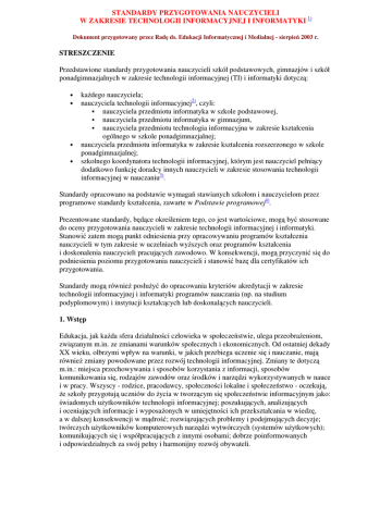 STANDARDY PRZYGOTOWANIA NAUCZYCIELI W ZAKRESIE TECHNOLOGII INFORMACYJNEJ I INFORMATYKI 1) Dokument przygotowany przez Rad ds. Edukacji Informatycznej i Medialnej - sierpie 2003 r. STRESZCZENIE Przedstawione standardy przygotowania nauczycieli szkół podstawowych, gimnazjów i szkół ponadgimnazjalnych w zakresie technologii informacyjnej (TI) i informatyki dotycz : • • • • ka dego nauczyciela; nauczyciela technologii informacyjnej2), czyli: nauczyciela przedmiotu informatyka w szkole podstawowej, nauczyciela przedmiotu informatyka w gimnazjum, nauczyciela przedmiotu technologia informacyjna w zakresie kształcenia ogólnego w szkole ponadgimnazjalnej; nauczyciela przedmiotu informatyka w zakresie kształcenia rozszerzonego w szkole ponadgimnazjalnej; szkolnego koordynatora technologii informacyjnej, którym jest nauczyciel pełni cy dodatkowo funkcj doradcy innych nauczycieli w zakresie stosowania technologii informacyjnej w nauczaniu3). Standardy opracowano na podstawie wymaga stawianych szkołom i nauczycielom przez programowe standardy kształcenia, zawarte w Podstawie programowej4). Prezentowane standardy, b d ce okre leniem tego, co jest warto ciowe, mog by stosowane do oceny przygotowania nauczycieli w zakresie technologii informacyjnej i informatyki. Stanowi zatem mog punkt odniesienia przy opracowywaniu programów kształcenia nauczycieli w tym zakresie w uczelniach wy szych oraz programów kształcenia i doskonalenia nauczycieli pracuj cych zawodowo. W konsekwencji, mog przyczyni si do podniesienia poziomu przygotowania nauczycieli i stanowi baz dla certyfikatów ich przygotowania. Standardy mog równie posłu y do opracowania kryteriów akredytacji w zakresie technologii informacyjnej i informatyki programów nauczania (np. na studium podyplomowym) i instytucji kształc cych lub doskonal cych nauczycieli. 1. Wst p Edukacja, jak ka da sfera działalno ci człowieka w społecze stwie, ulega przeobra eniom, zwi zanym m.in. ze zmianami warunków społecznych i ekonomicznych. Od ostatniej dekady XX wieku, olbrzymi wpływ na warunki, w jakich przebiega uczenie si i nauczanie, maj równie zmiany powodowane przez rozwój technologii informacyjnej. Zmiany te dotycz m.in.: miejsca przechowywania i sposobów korzystania z informacji, sposobów komunikowania si , rodzajów zawodów oraz rodków i narz dzi wykorzystywanych w nauce i w pracy. Wszyscy - rodzice, pracodawcy, społeczno ci lokalne i społecze stwo - oczekuj , e szkoły przygotuj uczniów do ycia w tworz cym si społecze stwie informacyjnym jako: wiadomych u ytkowników technologii informacyjnej; poszukuj cych, analizuj cych i oceniaj cych informacje i wyposa onych w umiej tno ci ich przekształcania w wiedz , a w dalszej konsekwencji w m dro ; rozwi zuj cych problemy i podejmuj cych decyzje; twórczych u ytkowników komputerowych narz dzi wytwórczych (systemów u ytkowych); komunikuj cych si i współpracuj cych z innymi osobami; dobrze poinformowanych i odpowiedzialnych za swój pełny i harmonijny rozwój obywateli. Technologia informacyjna5) W Podstawie programowej, w ród ogólnych zada szkoły, czyli odnosz cych si do wszystkich etapów edukacyjnych (tj. od pierwszej klasy w szkole podstawowej do ostatniej klasy w szkole ponadgimnazjalnej) oraz do wszystkich przedmiotów, znajduje si zapis: Nauczyciele stwarzaj uczniom warunki do nabywania nast puj cych umiej tno ci: poszukiwania, porz dkowania i wykorzystywania informacji z ró nych ródeł oraz efektywnego posługiwania si technologi informacyjn i komunikacyjn . To zadanie jest realizowane poprzez: A. Umo liwienie wszystkim uczniom poznania podstaw technologii informacyjnej słu temu wydzielone zaj cia informatyczne (przedmiot informatyka w szkole podstawowej i gimnazjum oraz technologia informacyjna w szkole ponadgimnazjalnej). B. Uwzgl dnienie technologii informacyjnej w programach ró nych przedmiotów i zintegrowanie jej z tymi przedmiotami oraz pakietami edukacyjnymi (np. podr cznikami). C. Wykorzystywanie technologii informacyjnej jako pomocy w poznawaniu i w nauczaniu innych dziedzin w tych sytuacjach, gdy jest to celowe i korzystne. Mo liwo ci technologii informacyjnej mo na ogólnie scharakteryzowa umiej tno ciami efektywnego stosowania rodków i narz dzi technologii informacyjnej oraz ródeł informacji do analizy, przetwarzania i prezentowania informacji, a tak e modelowania, pomiaru i sterowania urz dzeniami i wydarzeniami. Dotyczy to: • • • stosowania ródeł informacji oraz rodków, narz dzi i metod TI w rozwi zywaniu problemów; stosowania ródeł informacji, rodków i narz dzi TI, takich jak systemy komputerowe i pakiety oprogramowania, do wspomagania uczenia si ; dostrzegania i rozumienia wpływu TI na postawy ludzi, ich ycie zawodowe i funkcjonowanie społecze stwa. Uczniowie, na kolejnych etapach edukacyjnych, powinni pogł bia wiedz i rozwija umiej tno ci w nast puj cych obszarach technologii informacyjnej: • • • • • posługiwanie si rodkami (urz dzeniami) tej technologii; wpływ technologii informacyjnej na ycie obywateli i społecze stw - aspekty humanistyczne, etyczno-prawne i społeczne; stosowanie narz dzi TI, czyli wszelkiego rodzaju oprogramowania, zwłaszcza umo liwiaj cego prac twórcz ; komunikowanie si i poszukiwanie informacji; stosowanie technologii informacyjnej do bada , rozwi zywania problemów i podejmowania decyzji. W Podstawie programowej, która stanowi standard kształcenia ogólnego, doceniono znaczenie technologii informacyjnej dla wszystkich dziedzin nauczania (przedmiotów). W szkole podstawowej (w klasach IV - VI), na lekcjach informatyki uczniowie poznaj podstawy posługiwania si komputerem, w gimnazjum - kontynuuj nauk w ramach tego samego przedmiotu, który dodatkowo ma kształci podstawowe kompetencje zwi zane z rozwi zywaniem problemów w postaci algorytmicznej. W szkole ponadgimnazjalnej: wszyscy uczniowie pogł biaj swoj wiedz i umiej tno ci informatyczne na wydzielonych zaj ciach z technolog
