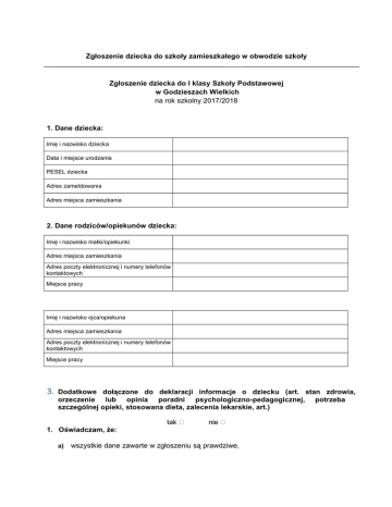Zgłoszenie dziecka do szkoły zamieszkałego w obwodzie szkoły Zgłoszenie dziecka do I klasy Szkoły Podstawowej w Godzieszach Wielkich na rok szkolny 2017/2018 1. Dane dziecka: Imię i nazwisko dziecka Data i miejsce urodzenia PESEL dziecka Adres zameldowania Adres miejsca zamieszkania 2. Dane rodziców/opiekunów dziecka: Imię i nazwisko matki/opiekunki Adres miejsca zamieszkania Adres poczty elektronicznej i numery telefonów kontaktowych Miejsce pracy Imię i nazwisko ojca/opiekuna Adres miejsca zamieszkania Adres poczty elektronicznej i numery telefonów kontaktowych Miejsce pracy 3. Dodatkowe dołączone do deklaracji informacje o dziecku (art. stan zdrowia, orzeczenie lub opinia poradni psychologiczno-pedagogicznej, szczególnej opieki, stosowana dieta, zalecenia lekarskie, art.) tak nie 1. Oświadczam, że: a) wszystkie dane zawarte w zgłoszeniu są prawdziwe, potrzeba niezwłocznie powiadomię dyrektora szkoły o zmianie danych zawartych w zgłoszeniu, c) wyrażam zgodę na przetwarzanie danych osobowych zawartych we wniosku dla celów związanych z rekrutacją do szkoły zgodnie z ustawą z dnia 29 sierpnia 1997 roku o ochronie danych osobowych (tekst jednolity Dz. U. z 2002 r. Nr 101, poz. 926 z późniejszymi zmianami), b) ...................., dnia ............................ ........................................................... (czytelny podpis rodzica/opiekuna) 4. Przyjęcie zgłoszenia przez dyrektora szkoły Data: ................................ ........................................................... (podpis dyrektora szkoły) Wniosek o przyjęcie dziecka do szkoły spoza obwodu Wniosek o przyjęcie dziecka do Szkoły Podstawowej w Godzieszach Wielkich na rok szkolny 2017/2018 Wypełniony wniosek należy złożyć w terminie do 30 marca 2017 br. do godz. 15.00 w sekretariacie szkoły lub przedszkola Data złożenia wniosku:…………………………………… Sposób dostarczenia wniosku: ………………………. DANE OSOBOWE DZIECKA PESEL Imię Nazwisko Data urodzenia Miejsce urodzenia ADRES ZAMIESZKANIA DZIECKA Województwo Powiat Gmina Miejscowość Ulica Poczta Nr domu/ nr mieszkania Kod pocztowy DODATKOWE INFORMACJE O DZIECKU Dziecko posiada orzeczenie o potrzebie kształcenia specjalnego (należy zakreślić odpowiedź) Nr orzeczenia Poradnia, która podała orzeczenie o potrzebie kształcenia specjalnego Typ orzeczenia (rodzaj niepełnosprawności) Dodatkowe informacje o dziecku TAK NIE DANE OSOBOWE MATKI/OPIEKUNKI PRAWNEJ Opiekun (właściwe zakreślić) Rodzic Opiekun prawny Imię Nie udzieli informacji Nie żyje Nieznany Rodzic mieszka za granicą Nie żyje Nieznany Rodzic mieszka za granicą Drugie imię Nazwisko ADRES ZAMIESZKANIA MATKI/OPIEKUNKI PRAWNEJ Województwo Powiat Gmina Miejscowość Ulica Poczta Nr domu/ nr mieszkania Kod pocztowy DANE KONTAKTOWE MATKI/OPIEKUNKI PRAWNEJ Telefon dom/komórka Adres e-mail DANE OSOBOWE OJCA/OPIEKUNA PRAWNEGO Opiekun (właściwe zakreślić) Imię Rodzic Opiekun prawny Nie udzieli informacji Drugie imię Nazwisko ADRES ZAMIESZKANIA OJCA/OPIEKUNA PRAWNEGO Województwo Powiat Gmina Miejscowość Ulica Poczta Nr domu/ nr mieszkania Kod pocztowy DANE KONTAKTOWE OJCA/OPIEKUNA PRAWNEGO Telefon dom/komórka Adres e-mail KRYTERIA PRZYJĘĆ (przy spełnionych kryteriach proszę postawić znak „x”) Kryteria wynikające ze statutu szkoły/ustalane przez gminę lub dyrektora w uzgodnieniu z organem prowadzącym Rodzeństwo kandydata spełnia obowiązek szkolny / roczne przygotowanie przedszkolne w szkole podstawowej , w której kandydat ubiega się o przyjęcie- 5 pkt 1. 2. 3. Dziecko uczęszczało do Przedszkola w Zespole Szkół - 6 pkt Rodzice lub jeden z rodziców kandydata pracuje w miejscowości należącej do obwodu danej szkoły podstawowej– 3 pkt W obwodzie szkoły podstawowej zamieszkują krewni kandydata wspierający rodziców/opiekunów prawnych w zapewnieniu mu należytej opieki- 2pkt 4. Uwagi. Przewodniczący Komisji Rekrutacyjnej może prosić o przedłożenie dokumentów potwierdzających spełnianie kryteriów kwalifikacyjnych zaznaczonych we wniosku. W przypadku nieprzedłożenia w terminie wskazanym przez Przewodniczącego dokumentów potwierdzających spełnienie kryteriów przyjmuje się, że dziecko nie spełnia danego kryterium. W przypadku braku potwierdzenia wyrażam zgodę na wykreślenie dziecka z listy zakwalifikowanych do przyjęcia do szkoły. Oświadczam, że podane powyżej dane są zgodne ze stanem faktycznym. ……………………………………………… Podpis matki lub opiekunki prawnej ………………………………………. podpis ojca lub opiekuna prawnego Specyfikacja załączników do wniosku: Kolejny numer załącznik a Rodzaj załącznika Forma załącznika1 Uwagi 1. 2. 3. 4. 5. Do wniosku dołączono łącznie ......... załączników OŚWIADCZENIA DOTYCZĄCE TREŚCI ZGŁOSZENIA I OCHRONY DANYCH OSOBOWYCH 1 Formy załączników: oryginał, notarialnie poświadczona kopia, urzędowo poświadczona kopia, kopia poświadczona za zgodność z oryginałem przez rodzica/ opiekuna, oświadczenie Podstawą prawną danych osobowych dziecka, jego rodziców lub opiekunów prawnych w celu rekrutacji dziecka do szkoły jest art. 23 ust. 1 pkt 1 i art. 27 ust.2 pkt 1 ustawy o ochronie danych osobowych (t.j. Dz. U. z 2002 r. nr poz. 926 z późniejszymi zmianami), zgodnie z którymi przetwarzanie jest dopuszczalne, jeżeli osoba, której dane dotyczą, wyrazi na to zgodę. Ponadto zgodnie z art. 23 ust. 1 pkt 2 ustawy przetwarzanie danych jest dopuszczalne, gdy jest to niezbędne do zrealizowania uprawnienie lub spełnienie obowiązku wynikającego z przepisu prawa, natomiast na podstawie art. 27 ust. 2 pkt 2 ustawy przetwarzanie danych, o których mowa w art. 27 ust. 1, jest dopuszczalne, jeżeli przepis szczególny innej ustawy zezwala na przetwarzanie takich danych bez zgody osoby, której dane dotyczą i stwarza pełne gwarancje ich ochrony. Przepisem