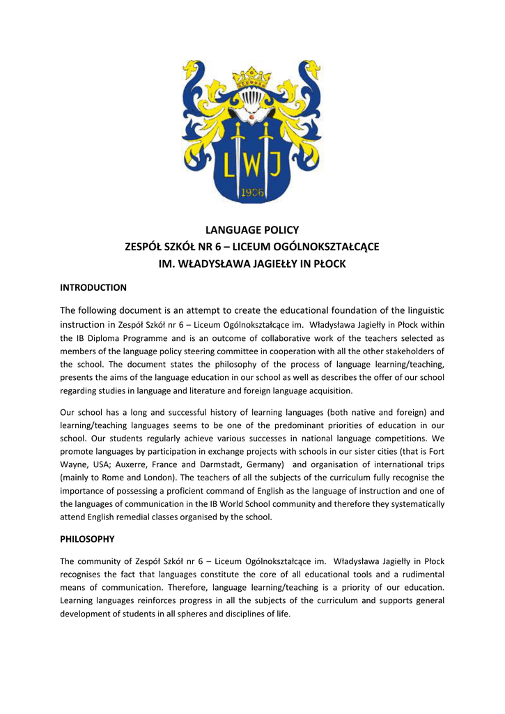 LANGUAGE POLICY ZESPÓŁ SZKÓŁ NR 6 – LICEUM OGÓLNOKSZTAŁCĄCE IM. WŁADYSŁAWA JAGIEŁŁY IN PŁOCK INTRODUCTION The following document is an attempt to create the educational foundation of the linguistic instruction in Zespół Szkół nr 6 – Liceum Ogólnokształcące im. Władysława Jagiełły in Płock within the IB Diploma Programme and is an outcome of collaborative work of the teachers selected as members of the language policy steering committee in cooperation with all the other stakeholders of the school. The document states the philosophy of the process of language learning/teaching, presents the aims of the language education in our school as well as describes the offer of our school regarding studies in language and literature and foreign language acquisition. Our school has a long and successful history of learning languages (both native and foreign) and learning/teaching languages seems to be one of the predominant priorities of education in our school. Our students regularly achieve various successes in national language competitions. We promote languages by participation in exchange projects with schools in our sister cities (that is Fort Wayne, USA; Auxerre, France and Darmstadt, Germany) and organisation of international trips (mainly to Rome and London). The teachers of all the subjects of the curriculum fully recognise the importance of possessing a proficient command of English as the language of instruction and one of the languages of communication in the IB World School community and therefore they systematically attend English remedial classes organised by the school. PHILOSOPHY The community of Zespół Szkół nr 6 – Liceum Ogólnokształcące im. Władysława Jagiełły in Płock recognises the fact that languages constitute the core of all educational tools and a rudimental means of communication. Therefore, language learning/teaching is a priority of our education. Learning languages reinforces progress in all the subjects of the curriculum and supports general development of students in all spheres and disciplines of life. We understand that language acquisition is a lifelong process and is a crucial element of students’ intellectual and emotional development. The linguistic education is expected to promote international mindedness, reinforce the learner profile attributes and allow our students to become successful and efficient members of the IB World schools community. All teachers must recognise and cater for students’ linguistic needs. As the language of instruction is not students and teachers’ native language, teachers’ role must be to develop their own linguistic competence to become role models for their students. AIMS Through linguistic education in our school, we aim to:       develop our students’ interest in culture (especially literature) of their native country as well as other countries whose languages are or are not taught in our school, reinforce students’ oral and written communication skills through different channels, promote international mindedness, openness and tolerance, encourage students to improve their language skills in order to comprehend other people and their complex personalities and various cultures and different perspectives, educate competent, creative, independent and proficient language users able to cope with various linguistic tasks, awaken students’ awareness of the significance of linguistic competence for all the subjects of the curriculum. LANGUAGE OFFER IN ZESPÓŁ SZKÓŁ NR 6 – LICEUM OGÓLNOKSZTAŁCĄCE WŁADYSŁAWA JAGIEŁŁY IN PŁOCK IM. 1. LANGUAGE A: POLISH Polish is presently the mother tongue of all the students of Zespół Szkół nr 6 – Liceum Ogólnokształcące im. Władysława Jagiełły in Płock, so it has been selected as Language A. The main purpose of the language education in this sphere will not only be the linguistic development of students, but first and foremost critical reflection of students on their reading in a given cultural context. Students are expected to acquire the appreciation of culture and literature and improve their ability to take advantage of literary texts to build their own outlooks upon the world and life and know how to express them. Students can choose the Standard Level or the Higher Level of Language A. In the case of non-native speakers of Polish at school, Zespół Szkół nr 6 – Liceum Ogólnokształcące im. Władysława Jagiełły in Płock commits to support such students individually on their way to acquire a proficient command of Polish. Similarly, such students will be supported in their self-taught native language if it is different from the languages offered by our school. 2. LANGUAGE B: ENGLISH English becomes the language of instruction, therefore all lessons in all the offered subjects (with the exception of Polish (Language A) and foreign languages) will be conducted entirely in English. The school offers the Higher Level and the Standard Level of English. However, we presume that at the beginning of their education in our school, IB DP students represent the command of proficiency of English at the B2 level in the Common European Framework of Reference for Languages and that is why the majority of students are expected to choose the Higher Level. The main objective of the English course is to develop students’ linguistic capabilities and not only prepare them for the final exam in Language B, but allow them to master the language as a significant tool to gain knowledge and abilities in all the subjects of the curriculum. 3. LANGUAGE B ab initio: FRENCH, GERMAN, ITALIAN IB DP students are given an opportunity to choose one of three ab initio languages currently available in Zespół Szkół nr 6 – Liceum Ogólnokształcące im. Władysława Jagiełły in Płock, namely: French, German and English. In the case of students whose command of French, German or Italian is sufficient enough to start their IB DP education 