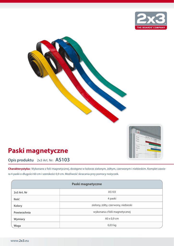 Paski magnetyczne Opis produktu 2x3 Art. Nr: AS103 Charakterystyka: Wykonane z folii magnetycznej, dostępne w kolorze zielonym, żółtym, czerwonym i niebieskim. Komplet zawiera 4 paski o długości 60 cm i szerokości 0,9 cm. Możliwość skracania przy pomocy nożyczek. Paski magnetyczne 2x3 Art. Nr AS103 Ilość 4 paski Kolory Powierzchnia Wymiary Waga www.2x3.eu zielony, żółty, czerwony, niebieski wykonana z folii magnetycznej 60 x 0,9 cm 0,03 kg