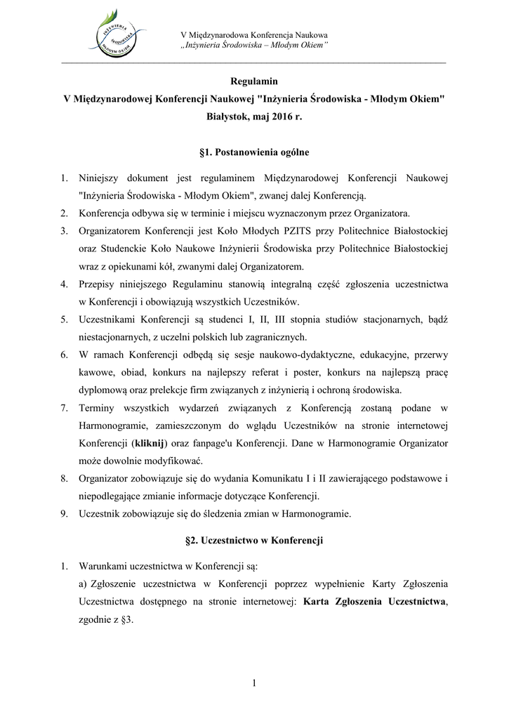 V Międzynarodowa Konferencja Naukowa „Inżynieria Środowiska – Młodym Okiem” ___________________________________________________________________________ Regulamin V Międzynarodowej Konferencji Naukowej "Inżynieria Środowiska - Młodym Okiem" Białystok, maj 2016 r. §1. Postanowienia ogólne 1. Niniejszy dokument jest regulaminem Międzynarodowej Konferencji Naukowej "Inżynieria Środowiska - Młodym Okiem", zwanej dalej Konferencją. 2. Konferencja odbywa się w terminie i miejscu wyznaczonym przez Organizatora. 3. Organizatorem Konferencji jest Koło Młodych PZITS przy Politechnice Białostockiej oraz Studenckie Koło Naukowe Inżynierii Środowiska przy Politechnice Białostockiej wraz z opiekunami kół, zwanymi dalej Organizatorem. 4. Przepisy niniejszego Regulaminu stanowią integralną część zgłoszenia uczestnictwa w Konferencji i obowiązują wszystkich Uczestników. 5. Uczestnikami Konferencji są studenci I, II, III stopnia studiów stacjonarnych, bądź niestacjonarnych, z uczelni polskich lub zagranicznych. 6. W ramach Konferencji odbędą się sesje naukowo-dydaktyczne, edukacyjne, przerwy kawowe, obiad, konkurs na najlepszy referat i poster, konkurs na najlepszą pracę dyplomową oraz prelekcje firm związanych z inżynierią i ochroną środowiska. 7. Terminy wszystkich wydarzeń związanych z Konferencją zostaną podane w Harmonogramie, zamieszczonym do wglądu Uczestników na stronie internetowej Konferencji (kliknij) oraz fanpage'u Konferencji. Dane w Harmonogramie Organizator może dowolnie modyfikować. 8. Organizator zobowiązuje się do wydania Komunikatu I i II zawierającego podstawowe i niepodlegające zmianie informacje dotyczące Konferencji. 9. Uczestnik zobowiązuje się do śledzenia zmian w Harmonogramie. §2. Uczestnictwo w Konferencji 1. Warunkami uczestnictwa w Konferencji są: a) Zgłoszenie uczestnictwa w Konferencji poprzez wypełnienie Karty Zgłoszenia Uczestnictwa dostępnego na stronie internetowej: Karta Zgłoszenia Uczestnictwa, zgodnie z §3. 1 V Międzynarodowa Konferencja Naukowa „Inżynieria Środowiska – Młodym Okiem” ___________________________________________________________________________ b) Uiszczenie opłaty konferencyjnej w wysokości i terminie podanych przez Organizatora. 2. Opłatę za udział w Konferencji należy przesłać na konto i dane wskazane przez Organizatora w Regulaminie lub Komunikacie: Polskiego Zrzeszenia Inżynierów i Techników Sanitarnych Oddział w Białymstoku nr konta: 67109025870000000120575021 W tytule należy napisać – Konferencja Naukowa_Imię_Nazwisko 3. Organizator wystawia fakturę tytułem dokonanych wpłat na życzenie wyrażone Uczestnika w Karcie Zgłoszenia Uczestnictwa. 4. Organizator wystawia fakturę na dane podane przez Uczestnika w Karcie Zgłoszenia Uczestnictwa. 5. Każdy Uczestnik biorący czynny udział w Konferencji otrzyma certyfikat uczestnictwa w Konferencji. 6. Koszt udziału w Konferencji, pobytu i przejazdu uczestnik pokrywa we własnym zakresie. 7. Termin nadsyłania zgłoszenia uczestnictwa za pośrednictwem Karty Zgłoszeniowej Uczestnictwa upływa w dniu wskazanym przez Organizatora w Harmonogramie znajdującym się w komunikacie. 8. Nieprzestrzeganie terminów wyznaczonych przez Organizatora może skutkować nieopublikowaniem artykułu w monografii. §3. Regulamin wypełnienia Karty Zgłoszeniowej Uczestnictwa 1. Karta Zgłoszeniowa Uczestnictwa dostępna jest na stronie internetowej: Karta Zgłoszeniowa Uczestnictwa (https://docs.google.com/forms/d/1kpie3UIlwT_tUQ2ZpGKwZxj9H313OVYpd4mOBicHsh E/viewform?c=0&w=1) 2. Kartę Zgłoszenia Uczestnictwa wypełnia: a) każdy Uczestnik biorący czynny udział w Konferencji, b) każdy ze współautorów będący również czynnym Uczestnikiem konferencji: 2 V Międzynarodowa Konferencja Naukowa „Inżynieria Środowiska – Młodym Okiem” ___________________________________________________________________________ uzupełnić należy oddzielną Kartę Zgłoszenia Uczestnictwa z podaniem tego samego tytułu wystąpienia, c) opiekun naukowy biorący udział w Konferencji. 3. Osoby będące współautorami i nieuczestniczące w Konferencji nie wypełniają Karty Zgłoszenia Uczestnictwa. 4. Dane podane w Karcie Zgłoszenia Uczestnictwa Organizator uznaje za ostateczne po przesłaniu Karty Zgłoszeniowej Uczestnictwa przez Uczestnika. 5. Kartę Zgłoszenia Uczestnictwa należy wypełniać używając pełnych nazw, bez użycia skrótów. §4. Rezygnacja z udziału w Konferencji 1. Uczestnik może zrezygnować z uczestnictwa w Konferencji. Rezygnacja Uczestnika z udziału w Konferencji powinna być dokonana w formie pisemnej wysłanej: a) Pocztą Polską na adres: Koło Młodych PZITS przy Politechnice Białostockiej ul. Wiejska 45E, 15-351 Białystok b) na adres e-mail [email protected]: 2. jako zeskanowany ręcznie podpisany dokument dokument .pdf z elektronicznym podpisem W przypadku rezygnacji Uczestnika z udziału w Konferencji opłata konferencyjna nie podlega zwrotowi. §5. Opłaty 1. Wysokości opłat za uczestnictwo w Konferencji są zamieszczone na stronie internetowej Konferencji oraz w Komunikacie wydanym przez Organizatora. 2. Brak uregulowania należności za udział w Konferencji w terminie podanym przez Organizatora na stronie internetowej Konferencji, fanpage Konferencji, Komunikacie wydanym przez Organizatora, upoważnia Organizatora do anulowania zgłoszenia uczestnictwa, bez ponoszenia z tego tytułu jakiejkolwiek odpowiedzialności odszkodowawczej. 3 V Międzynarodowa Konferencja Naukowa „Inżynieria Środowiska – Młodym Okiem” ___________________________________________________________________________ §6. Reklamacje 1. Wszelkie reklamacje Uczestników Konferencji wobec Organizatora powinny być zgłaszane w formie pisemnej listem poleconym za potwierdzeniem odbioru na adres siedziby Organizatora. 2. Reklamacje Uczestników Konferencji mogą być zgłaszane nie później niż w term