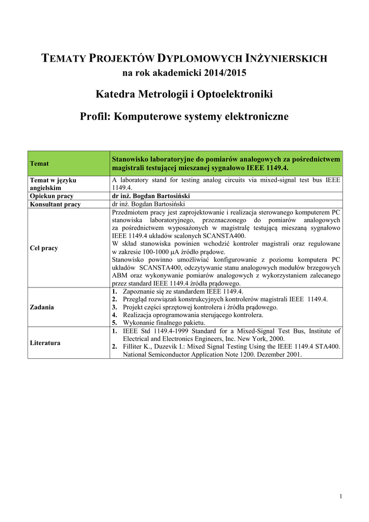 TEMATY PROJEKTÓW DYPLOMOWYCH INŻYNIERSKICH na rok akademicki 2014/2015 Katedra Metrologii i Optoelektroniki Profil: Komputerowe systemy elektroniczne Temat Temat w języku angielskim Opiekun pracy Konsultant pracy Cel pracy Zadania Literatura Stanowisko laboratoryjne do pomiarów analogowych za pośrednictwem magistrali testującej mieszanej sygnałowo IEEE 1149.4. A laboratory stand for testing analog circuits via mixed-signal test bus IEEE 1149.4. dr inż. Bogdan Bartosiński dr inż. Bogdan Bartosiński Przedmiotem pracy jest zaprojektowanie i realizacja sterowanego komputerem PC stanowiska laboratoryjnego, przeznaczonego do pomiarów analogowych za pośrednictwem wyposażonych w magistralę testującą mieszaną sygnałowo IEEE 1149.4 układów scalonych SCANSTA400. W skład stanowiska powinien wchodzić kontroler magistrali oraz regulowane w zakresie 100-1000 A źródło prądowe. Stanowisko powinno umożliwiać konfigurowanie z poziomu komputera PC układów SCANSTA400, odczytywanie stanu analogowych modułów brzegowych ABM oraz wykonywanie pomiarów analogowych z wykorzystaniem zalecanego przez standard IEEE 1149.4 źródła prądowego. 1. Zapoznanie się ze standardem IEEE 1149.4. 2. Przegląd rozwiązań konstrukcyjnych kontrolerów magistrali IEEE 1149.4. 3. Projekt części sprzętowej kontrolera i źródła prądowego. 4. Realizacja oprogramowania sterującego kontrolera. 5. Wykonanie finalnego pakietu. 1. IEEE Std 1149.4-1999 Standard for a Mixed-Signal Test Bus, Institute of Electrical and Electronics Engineers, Inc. New York, 2000. 2. Filliter K., Duzevik I.: Mixed Signal Testing Using the IEEE 1149.4 STA400. National Semiconductor Application Note 1200. Dezember 2001. 1 Temat Oprogramowanie demonstracyjne dla zestawu mikrokontrolera rodziny AVR XMEGA firmy Atmel laboratoryjnego Temat w języku angielskim Demonstration software for a laboratory kit of an AVR XMEGA family microcontroller of Atmel Opiekun pracy dr hab. inż. Zbigniew Czaja Konsultant pracy dr hab. inż. Zbigniew Czaja Cel pracy Celem pracy jest napisanie oprogramowania demonstrującego pracę urządzeń peryferyjnych mikrokontrolera z rodziny AVR XMEGA, np. takich jak: 16-bitowe liczniki, 12-bitowy przetwornik A/C, 12-bitowy przetwornik C/A i komparatory analogowe. Zadania 1. 2. 3. 4. Literatura 1. Dokumentacja producenta na http://www.atmel.com. 2. Czaja Z., Burek K.: Stanowisko laboratoryjne ATXmega32A4 firmy Atmel, 2013. Temat Oprogramowanie demonstracyjne dla zestawu mikrokontrolera PIC18F4550 firmy Microchip Temat w języku angielskim Demonstration software for a laboratory kit of a PIC18F4550 microcontroller of Microchip Opiekun pracy dr hab. inż. Zbigniew Czaja Konsultant pracy dr hab. inż. Zbigniew Czaja Cel pracy Celem pracy jest napisanie oprogramowania demonstrującego pracę urządzeń peryferyjnych mikrokontrolera PIC18F4550, np. takich jak: 16-bitowe liczniki, 10-bitowy przetwornik A/C, interfejsy USART i USB. Zadania 1. Koncepcja oprogramowania sterującego stanowiskiem laboratoryjnym. 2. Napisanie programu w asemblerze na mikrokontroler. 3. Napisanie programu sterującego interfejsem USB w języku C MPLAB XC8 na mikrokontroler. 4. Przetestowanie i uruchomienie oprogramowania. Literatura 1. Dokumentacja producenta na http://www.microchip.com. 2. Propox, "EVBeasyPIC. Instrukcja użytkownika", REV 2, 2013. Koncepcja oprogramowania sterującego stanowiskiem laboratoryjnym. Napisanie programu w asemblerze na mikrokontroler. Napisanie programu w języku C na mikrokontroler. Przetestowanie i uruchomienie oprogramowania. dla mikrokontrolera laboratoryjnego 2 Temat Temat w języku angielskim Opiekun pracy Konsultant pracy Cel pracy Zadania Literatura Temat Temat w języku angielskim Opiekun pracy Konsultant pracy Cel pracy Zadania Literatura Układ ochrony akumulatora The battery protection circuit dr inż. Stanisław Galla Wykonanie uniwersalnego układu ochrony akumulatorów ołowiowych o pojemnościach od 2 Ah do 50 Ah przed zbyt głębokim rozładowaniem. 1. Studia literaturowe nad typami akumulatorów. 2. Wybór elementów układu metodyki sterowania, (klucza MOSFET). 3. Wykonanie prototypu układu, montaż, testy funkcjonalne. 4. Wykonanie układ docelowego. 1. Thaler A., Watzenig D.: Automotive Battery Technology, Springer, 2014. 2. D. Pavlov: Lead-Acid Batteries: Science and Technology, Elsevier, 2011. 3. http://www.vishay.com/mosfets/ 4. http://www.st.com/web/catalog/ Układ zasilania światłowodowego z wykorzystaniem diod mocy LED The power supply system using a fiber optic power LED diodes dr inż. Stanisław Galla Wykonanie układu konwertującego światło na napięcie, prąd z transmisją przez światłowód z wykorzystaniem jako źródła LED-owych diod mocy. 1. Studia literaturowe nad dostępnymi diodami mocy LED. 2. Wybór elementów układu konwersji z wykorzystaniem generacji odwrotnej na diodach LED (wybór diod). 3. Wykonanie prototypu układu, montaż, testy funkcjonalne. 4. Wykonanie układ docelowego. 1. Winder S.: Power Supplies for LED Driving, Elsevier, 2008. 2. D. Pavlov: Lead-Acid Batteries: Science and Technology, Elsevier, 2011. 3. http://www.cree.com 4. http://www.st.com/ 3 Temat Temat w języku angielskim Opiekun pracy Konsultant pracy Cel pracy Zadania Literatura Temat Temat w języku angielskim Opiekun pracy Konsultant pracy Cel pracy Zadania Literatura Moduł wzorcowego pomiaru temperatury do kamer termowizyjnych The reference temperature measurement system for thermal cameras dr inż. Stanisław Galla Wykonanie układu będącego wzorcem temperatury dla kamery termowizyjnej. Wymaga wykonania układu zadającego oraz układu pomiaru temperatury. 1. Studia literaturowe nad stosowanymi rozwiązaniami układów wzorcowych. 2. Projekt układu oraz jego obudowy. 3. Wykonanie prototypu układu, montaż, testy funkcjonalne. 1. Więcek B., De Mey G.: Termowizja w podczerwieni. Podstawy i zastosowania, Wydawnictwo PAK, 2011. 2. Minkina W.: Wybrane problemy współczesn