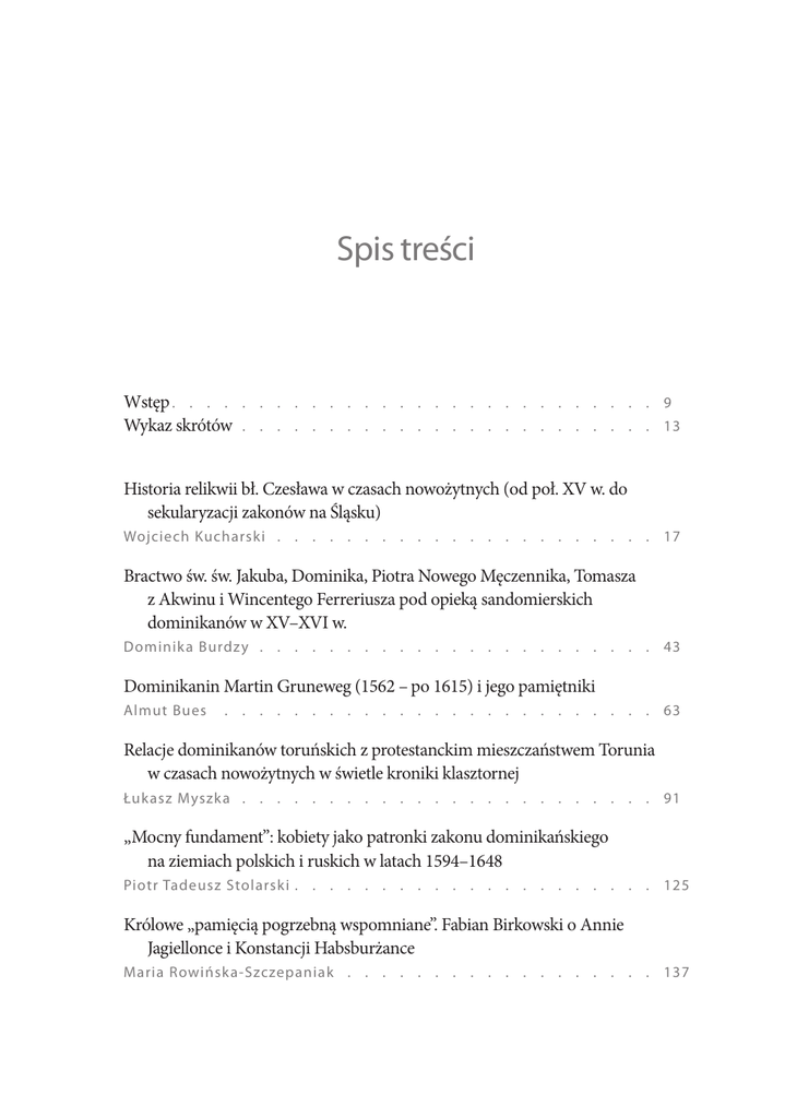 Spis treści Wstęp . . . . . . . . . . . . . . . . . . . . . . . . . . . . 9 Wykaz skrótów . . . . . . . . . . . . . . . . . . . . . . . . 13 Historia relikwii bł. Czesława w czasach nowożytnych (od poł. XV w. do sekularyzacji zakonów na Śląsku) Wojciech Kucharski . . . . . . . . . . . . . . . . . . . . . . 17 Bractwo św. św. Jakuba, Dominika, Piotra Nowego Męczennika, Tomasza z Akwinu i Wincentego Ferreriusza pod opieką sandomierskich dominikanów w XV–XVI w. Dominika Burdz y . . . . . . . . . . . . . . . . . . . . . . . 43 Dominikanin Martin Gruneweg (1562 – po 1615) i jego pamiętniki Almut Bues . . . . . . . . . . . . . . . . . . . . . . . . . . 63 Relacje dominikanów toruńskich z protestanckim mieszczaństwem Torunia w czasach nowożytnych w świetle kroniki klasztornej Łukasz Myszka . . . . . . . . . . . . . . . . . . . . . . . . 91 „Mocny fundament”: kobiety jako patronki zakonu dominikańskiego na ziemiach polskich i ruskich w latach 1594–1648 Piotr Tadeusz Stolarski . . . . . . . . . . . . . . . . . . . . . 125 Królowe „pamięcią pogrzebną wspomniane”. Fabian Birkowski o Annie Jagiellonce i Konstancji Habsburżance Maria Rowińska-Szczepaniak . . . . . . . . . . . . . . . . . . 137 6 Dominikanie na ziemiach polskich w epoce nowożytnej Dominikański dworek koło kościoła św. Idziego w Krakowie i jego dzierżawcy w latach 1595–1672 Tomasz Gałuszka OP . . . . . . . . . . . . . . . . . . . . . . 153 Rusini w zakonie dominikańskim (koniec XVI–1. połowa XVII wieku) Tetiana Shevchenko . . . . . . . . . . . . . . . . . . . . . . 169 Wierzytelności dominikanów lwowskich u Żydów z terenu Rusi Czerwonej w 2. połowie XVII i w XVIII wieku Stefan Gąsiorowski . . . . . . . . . . . . . . . . . . . . . . 193 Klasztory dominikańskie na Wołyniu a miejscowe społeczeństwo: analiza wzajemnych relacji w XVII–XVIII w. Natalija Sinkewycz . . . . . . . . . . . . . . . . . . . . . . . 215 Kościół i klasztor oo. dominikanów w Brodach w świetle osiemnastowiecznych inwentarzy Anna Markiewicz . . . . . . . . . . . . . . . . . . . . . . . 227 Fundacje dominikańskie Radziwiłłów nieświeskich w XVIII wieku Karolina Stojek-Sawicka . . . . . . . . . . . . . . . . . . . . 257 Kilka uwag o pewnym osiemnastowiecznym obrazie z kościoła dominikanów w Lachowcach Andrzej Betlej . . . . . . . . . . . . . . . . . . . . . . . . . 271 Metafizyka w pejzażu. Obraz świata w kazaniach dominikańskich z 1. połowy XVIII wieku Tomasz Gałwiaczek . . . . . . . . . . . . . . . . . . . . . . 285 Dominikańskie sanktuaria maryjne na ziemiach ruskich i ich rola w kształtowaniu kultury prowincjonalnej podczas wielkich uroczystości w XVIII w. Tomasz Dywan . . . . . . . . . . . . . . . . . . . . . . . . 327 Działalność typograficzna dominikanów łuckich w latach 1787–1831 Halina Rusińska-Gier tych . . . . . . . . . . . . . . . . . . . . 349 Słynące łaskami obrazy Matki Boskiej z Dzieciątkiem w kościołach dominikańskich zachodniej części dawnego województwa trockiego Joanna Tomalska . . . . . . . . . . . . . . . . . . . . . . . 369 Spis treści 7 Rzut treflowy w architekturze dominikanów w Polsce – przegląd problematyki Kinga Blaschke . . . . . . . . . . . . . . . . . . . . . . . . 393 Podkamień i Lublin – dekoracje sztukatorskie warsztatu Falconiego w kościołach dominikańskich Michał Kurzej . . . . . . . . . . . . . . . . . . . . . . . . . 427 Źródła do historii klasztoru dominikanów w Koniuchach w powiecie wołkowyskim Henadzi Siemiańczuk . . . . . . . . . . . . . . . . . . . . . . 457 Inwentarz folwarku Piaski z 1755 roku. Przyczynek do dziejów gospodarczych sieradzkich dominikanów w XVIII wieku Grzegorz Wierzchowski . . . . . . . . . . . . . . . . . . . . . 469 Zaplecze gospodarcze klasztorów dominikańskich w diecezji kamienieckiej w świetle akt wizytacji z 1823 roku Marek Miławicki OP . . . . . . . . . . . . . . . . . . . . . . 485 „Byłbym najniespokojniejszym, gdybym ufności nie pokładał w nieprzebranej Najwyższej Opatrzności” – rekonstrukcja biografii Faustyna Ciecierskiego Joanna Brodniewicz . . . . . . . . . . . . . . . . . . . . . . 519 Indeks osób . . . . . . . . . . . . . . . . . . . . . . . . . . . . . 563 Indeks nazw geograficznych . . . . . . . . . . . . . . . . . . . . . . 595