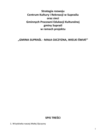 Strategia rozwoju Centrum Kultury i Rekreacji w Supraślu oraz sieci Gminnych Pracowni Edukacji Kulturalnej gminy Supraśl w ramach projektu „GMINA SUPRAŚL - MAŁA OJCZYZNA, WIELKI ŚWIAT” SPIS TREŚCI 1. Wizytówka naszej Małej Ojczyzny 1 2. Wizja Domu Kultury i jego roli w środowisku lokalnym 3. Misja naszego Domu Kultury 4. Analiza SWOT 5. Kierunki rozwoju naszego domu Kultury 6. Cele strategiczne 7. Jak tworzyliśmy to opracowanie? 1.Wizytówka Gminy Supraśl 2 Historia, zabytki W ostatnim roku XV-tego stulecia, do uroczyska Suchy Hrud w dawnej Puszczy Błudowskiej przybyli prawosławni mnisi. Tak rozpoczęła się historia Supraśla. Rozpoczęto budowę zespołu klasztornego, pierwotnie – prawosławnego, następnie –unickich bazylianów. Przez trzysta lat stanowił on fundament rozwoju miejscowości, zarówno gospodarczego, jak i kulturowego. Jego budowle, a zwłaszcza obronna cerkiew p.w Zwiastowania NMP dominowały w supraskim krajobrazie. W końcu XVII wieku powstała Oficyna Supraska, której staraniem drukowano alfabetem łacińskim i cyrylicą liturgiczne księgi jak również świeckie. Tu pierwszy raz wydano „ Pieśni nabożne” Franciszka Karpińskiego, polskie tłumaczenia „Podróży Guliwera” Jonathana Swifta i „Cyda” Piotra Corneille’a. Upadek Rzeczpospolitej Obojga Narodów, rządy zaborców najpierw pruskich, następnie – rosyjskich przerwały rozwój miasta. W latach trzydziestych XIX wieku, do Supraśla zjechali Wilhelm Zachert i Adolf Buchholtz – potentaci przemysłu włókienniczego ze Zgierza i Łodzi, jednocześnie przenosząc tu swoje zakłady. Powstały liczne warsztaty, manufaktury, fabryki Jansena, Alta, Aunerta, Cytrona. Wykorzystując obfitość otaczającej miasto puszczy rozwinął się również przemysł drzewny. W II Rzeczpospolitej szybko odrobiono wojenne straty. Ponownie Supraśl stał się dużym ośrodkiem przemysłowym. Również zauważono i zaczęto wykorzystywać walory uzdrowiskowe, wypoczynkowe, turystyczne miasta położonego w centrum Puszczy Knyszyńskiej. Okres II wojny światowej, okupacja sowiecka i nazistowska ponownie zahamowały rozwój Supraśla. Całkowicie zniszczono wszystkie zakłady włókiennicze. Represje okupantów spowodowały znaczne straty wśród mieszkańców, szczególnie wśród ludności żydowskiej. Ograbiono i zdewastowano zespół klasztorny i kościół ewangelicki. W lipcu 1944 r. wycofujące się wojska hitlerowskie wysadziły cerkiew Zwiastowania NMP. W latach 1984 – 2004 odbudowano gotycko – bizantyńską cerkiew obronną p.w. Zwiastowania NMP. Jej kopuły powróciły w supraski krajobraz. W 2007 r. w Pałacu Archimandrytów rozpoczęło działalność Muzeum Ikon. W jego ekspozycjach znajduje się ok. 300 eksponatów sztuki kościoła wschodniego, w tym fragmenty XVI - wiecznych fresków zdobiących pierwotnie cerkiew Zwiastowania NMP. W Supraślu znajduje się ponad 100 obiektów zabytkowych, z których aż 33 znajdują się w rejestrze zabytków. M.in.: Męski Klasztor Prawosławny p.w. Zwiastowania Najświętszej Marii Panny i Św. Jana Teologa. Założony przez prawosławnych mnichów w 1 500 r. z fundacji Aleksandra Chodkiewicza. W XVIII w znajdowała się tu drukarnia i biblioteka ojców bazylianów. W refektarzu i kaplicy mieści się obecnie muzeum. Brama – dzwonnica z 1752 r zamykająca dziedziniec klasztorny od strony zachodniej. Katakumby znajdują się obok klasztoru Stara poczta – XVIII w budynek dawnej poczty i karczmy Domy tkaczy z połowy XIX w przy ul. 3 Maja Pałac Buchholtzów wybudowany w latach 1892 – 1903, w którym mieści się obecnie Liceum Plastyczne im. A.Grottgera. Kościół katolicki pod wezwaniem Św. Trójcy przy ul. Piłsudskiego wybudowany w latach 1861 – 1863 Kościół poewangelicki z 1885 r przy ul. Piłsudskiego Budynek polskiej szkoły powszechnej zbudowany na początku XX w przez baronową Józefinę Zachert, obecny ratusz miejski 3 Kaplica drewniano-murowana z XIX w na cmentarzu parafialnym Kaplica grobowa Buchholtzów z 1904 r na cmentarzu parafialnym Mauzoleum Zachertów z 1885 r na cmentarzu parafialnym. Położenie Gmina Supraśl położona jest w północno-wschodniej Polsce, na terenie Wysoczyzny Białostockiej. Zajmuje powierzchnię 188 km2 . Blisko 70% powierzchni zajmują lasy Puszczy Knyszyńskiej. Najcenniejsze fragmenty przyrody są chronione w rezerwatach Parku Krajobrazowego Puszczy Knyszyńskiej, największego parku krajobrazowego w Polsce i zarazem największego obszaru chronionego o powierzchni około 150.000 ha. Przez teren gminy prowadzą ważne drogi krajowe: nr 66 Białystok – Bobrowniki (granica państwa) i nr 676 wiodąca do unikatowego szlaku Tatarskiego do Kruszynian. Rzeka Supraśl nie tylko urozmaica krajobraz i stwarza warunki do rozwoju turystyki kwalifikowanej, lecz stanowi także rezerwuar wody pitnej dla aglomeracji białostockiej. Miasto i gmina Supraśl jest jedną z kilku jednostek samorządu terytorialnego, wchodzącego w skład powiatu białostockiego, należącego do województwa podlaskiego. Do gminy, oprócz miasta Supraśl, należy siedemnaście sołectw: Ogrodniczki, Karakule, Ciasne, Grabówka, Zaścianki, Sobolewo, Sowlany, Henrykowo, Cieliczanka, Surażkowo, Sokołda, Woronicze, Łaźnie i Jałówka. Miasto Supraśl jest siedzibą gminy, liczy 4.524 mieszkańców, położone jest 15 km od Białegostoku, a od Warszawy dzieli je 200 km. Od 8 stycznia 2002 r. na mocy decyzji Ministra Zdrowia– Dz. U. Nr 1 z 2002 roku, Supraśl jest uzdrowiskiem, co plasuje tę miejscowość pośród 42 innych kurortów w Polsce. Położenie Supraśla w centrum Puszczy Knyszyńskiej, posiadanie statusu uzdrowiska, predysponuje miejscowość do odgrywania roli kulturotwórczej. Supraśl to miejsce szczególne – bliskie i odległe jednocześnie. Liczy jedynie 4,5 tysiąca mieszkańców, natomiast niespotykane gdzie indziej skupisko potencjału kulturalnego i społecznego w postaci: 3 szkół, w tym je