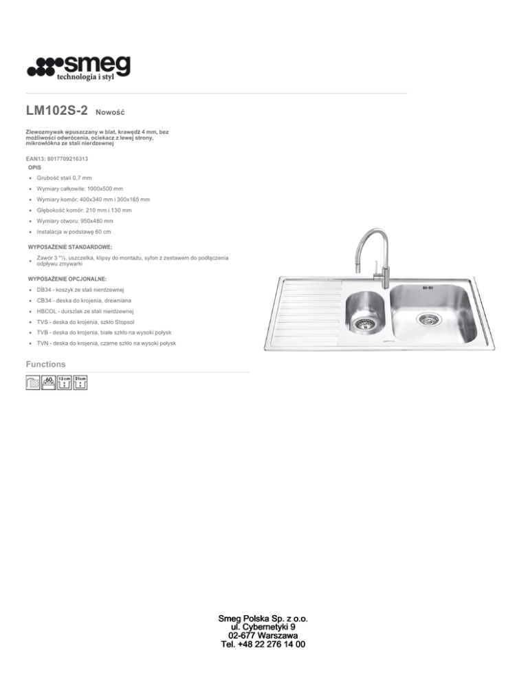 LM102S-2 Nowość Zlewozmywak wpuszczany w blat, krawędź 4 mm, bez możliwości odwrócenia, ociekacz z lewej strony, mikrowłókna ze stali nierdzewnej EAN13: 8017709216313 OPIS Grubość stali 0,7 mm Wymiary całkowite: 1000x500 mm Wymiary komór: 400x340 mm i 300x165 mm Głębokość komór: 210 mm i 130 mm Wymiary otworu: 950x480 mm Instalacja w podstawę 60 cm WYPOSAŻENIE STANDARDOWE: Zawór 3 "½, uszczelka, klipsy do montażu, syfon z zestawem do podłączenia odpływu zmywarki WYPOSAŻENIE OPCJONALNE: DB34 - koszyk ze stali nierdzewnej CB34 - deska do krojenia, drewniana HBCOL - durszlak ze stali nierdzewnej TVS - deska do krojenia, szkło Stopsol TVB - deska do krojenia, białe szkło na wysoki połysk TVN - deska do krojenia, czarne szkło na wysoki połysk Functions Smeg Polska Sp. z o.o. ul. Cybernetyki 9 02-677 Warszawa Tel. +48 22 276 14 00 LM102S-2 iLOŚĆ KOMÓR: 1.5 mikrowłókna ze stali nierdzewnej 100 cm zlewozmywaki ze stali nierdzewnej wpuszczane w blat INSTALACJA PRZY KRAWĘDZI: Instalacja z zachowaniem krawędzi 8 mm. 60 CM PODSTAWA: Szerokość szafki/ podstawy wymagana do instalacji - 60 cm GŁEBOKOŚĆ KOMORY: Głębokość komory zależy od modelu i waha się od 13 do 24 cm GŁEBOKOŚĆ KOMORY: Głębokość komory zależy od modelu i waha się od 16 do 24 cm Smeg Polska Sp. z o.o. ul. Cybernetyki 9 02-677 Warszawa Tel. +48 22 276 14 00 LM102S-2 iLOŚĆ KOMÓR: 1.5 mikrowłókna ze stali nierdzewnej 100 cm zlewozmywaki ze stali nierdzewnej wpuszczane w blat Smeg Polska Sp. z o.o. ul. Cybernetyki 9 02-677 Warszawa Tel. +48 22 276 14 00