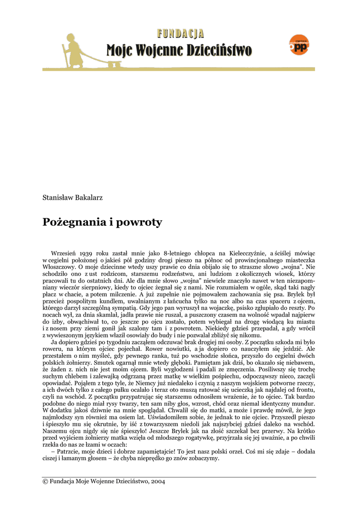 Stanisław Bakalarz Pożegnania i powroty Wrzesień 1939 roku zastał mnie jako 8-letniego chłopca na Kielecczyźnie, a ściślej mówiąc w cegielni położonej o jakieś pół godziny drogi pieszo na północ od prowincjonalnego miasteczka Włoszczowy. O moje dziecinne wtedy uszy prawie co dnia obijało się to straszne słowo „wojna”. Nie schodziło ono z ust rodzicom, starszemu rodzeństwu, ani ludziom z okolicznych wiosek, którzy pracowali tu do ostatnich dni. Ale dla mnie słowo „wojna” niewiele znaczyło nawet w ten niezapomniany wieczór sierpniowy, kiedy to ojciec żegnał się z nami. Nie rozumiałem w ogóle, skąd taki nagły płacz w chacie, a potem milczenie. A już zupełnie nie pojmowałem zachowania się psa. Brylek był przecież pospolitym kundlem, uwalnianym z łańcucha tylko na noc albo na czas spaceru z ojcem, którego darzył szczególną sympatią. Gdy jego pan wyruszył na wojaczkę, psisko zgłupiało do reszty. Po nocach wył, za dnia skamlał, jadła prawie nie ruszał, a puszczony czasem na wolność wpadał najpierw do izby, obwąchiwał to, co jeszcze po ojcu zostało, potem wybiegał na drogę wiodącą ku miastu i z nosem przy ziemi gonił jak szalony tam i z powrotem. Niekiedy gdzieś przepadał, a gdy wrócił z wywieszonym językiem właził osowiały do budy i nie pozwalał zbliżyć się nikomu. Ja dopiero gdzieś po tygodniu zacząłem odczuwać brak drogiej mi osoby. Z początku szkoda mi było roweru, na którym ojciec pojechał. Rower nowiutki, a ja dopiero co nauczyłem się jeździć. Ale przestałem o nim myśleć, gdy pewnego ranka, tuż po wschodzie słońca, przyszło do cegielni dwóch polskich żołnierzy. Smutek ogarnął mnie wtedy głęboki. Pamiętam jak dziś, bo okazało się niebawem, że żaden z. nich nie jest moim ojcem. Byli wygłodzeni i padali ze zmęczenia. Posiliwszy się trochę suchym chlebem i zalewajką odgrzaną przez matkę w wielkim pośpiechu, odpocząwszy nieco, zaczęli opowiadać. Pojąłem z tego tyle, że Niemcy już niedaleko i czynią z naszym wojskiem potworne rzeczy, a ich dwóch tylko z całego pułku ocalało i teraz oto muszą ratować się ucieczką jak najdalej od frontu, czyli na wschód. Z początku przypatrując się starszemu odnosiłem wrażenie, że to ojciec. Tak bardzo podobne do niego miał rysy twarzy, ten sam niby głos, wzrost, chód oraz niemal identyczny mundur. W dodatku jakoś dziwnie na mnie spoglądał. Chwalił się do matki, a może i prawdę mówił, że jego najmłodszy syn również ma osiem lat. Uświadomiłem sobie, że jednak to nie ojciec. Przyszedł pieszo i śpieszyło mu się okrutnie, by iść z towarzyszem niedoli jak najszybciej gdzieś daleko na wschód. Naszemu ojcu nigdy się nie śpieszyło! Jeszcze Brylek jak na złość szczekał bez przerwy. Na krótko przed wyjściem żołnierzy matka wzięła od młodszego rogatywkę, przyjrzała się jej uważnie, a po chwili rzekła do nas ze łzami w oczach: – Patrzcie, moje dzieci i dobrze zapamiętajcie! To jest nasz polski orzeł. Coś mi się zdaje – dodała ciszej i łamanym głosem – że chyba nieprędko go znów zobaczymy. © Fundacja Moje Wojenne Dzieciństwo, 2004 Stanisław Bakalarz, Pożegnania i powroty 2 Staliśmy później w progu i odprowadzaliśmy swoich gości w mundurach smutnym wzrokiem aż do miejsca, gdzie kończyła się droga, a zaczynał sosnowy lasek opromieniony blaskiem wrześniowego słońca. Około południa napływać zaczęli ludzie jak gdyby z całego miasta i ze wszystkich okolic. Szli pojedynczo, w grupkach i z rodzinami. Każdy coś niósł w ręku i dźwigał na plecach jakiś tobół, albo pchał wózek przed sobą załadowany po brzegi. Chociaż w cegielni zawsze było do kogo zagadać, to teraz robiło się po prostu rojno, gwarno i trochę za ciasno. Najgłośniej dawały znać o sobie Żydówki z małymi dziećmi. Przybysze pozajmowali szopy, rozsiedli się w stodółce i w narzędziowni, niektórzy pokładli się nawet w rowach i zagłębieniach, tak że tylko głowy ich wystawały. Wolna do niedawna jedna z izb zdawała się pękać w szwach. Lada moment pokazać się miał także sam właściciel cegielni pan Szymon Gołuchowski, nazywany przez wszystkich „Dziedzicem”. Lubiłem liczne towarzystwo, ale tego dnia było go trochę w nadmiarze. Jednakże gdy zebrała się gromadka dzieci i urządziła sobie gonitwę po całej cegielni, przyłączyłem się natychmiast. Nikt z dorosłych nie zwracał na nas większej uwagi, toteż i zabawy przeciągały się póty, póki się nie znudziły. W samą porę wykryliśmy dziurę w płocie. Brama wprawdzie też stała otworem, ale tutaj przejście – choć wąskie – miało posmak małej przygody. Poza tym widok szeroko rozciągających się pól i łąk zalanych słońcem kusił okrutnie, a niezbyt odległy las wciąż wabił zapachem sosnowego igliwia niesionym przez lekki wiatr. Ruszyliśmy więc naprzód. Zagony z kartoflami, zarosła trawą miedza, spłowiałe ściernisko i znów miedza. Dalej droga, a na niej mnóstwo ludzi. Wszyscy ciągną do cegielni jak do oazy na pustyni. Wtem od strony miasta nadlatują dwa samoloty. Pierwszy zniża lot i wkrótce ukazuje się nad nami niczym olbrzymie czarne ptaszysko. Głośno warczy, dziwnie klekocze, robi gwałtownie zakręt i znika w słonecznej kurzawie. Porwał mnie nagle śmiech nie do opanowania, bo zobaczyłem, jak ci, co podążali drogą, pokładli się teraz, jakby ich drzemka napadła. Szczególnie zaś bawiło mnie to, że gdy w górze rozlegał się klekot, na polu i drodze robiło się tak, jakby ktoś nieustannie biegł i co krok wbijał coś twardego z całej siły i pogwizdywał z uciechy. Pękałem prawie ze śmiechu, a tymczasem z tyłu zbliżał się następny samolot, taki sam czarny, ogromny i lecący zupełnie nisko. Znów ogłuszający warkot, ruchomy cień na ziemi i jeszcze głośniejszy klekot nad naszymi głowami, jeszcze raz zakręt, uniesieni