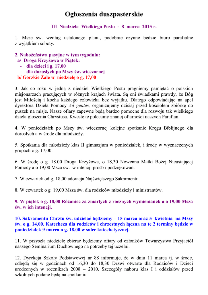 Ogłoszenia duszpasterskie III Niedziela Wielkiego Postu - 8 marca 2015 r. 1. Msze św. według ustalonego planu, podobnie czynne będzie biuro parafialne z wyjątkiem soboty. 2. Nabożeństwa pasyjne w tym tygodniu: a/ Droga Krzyżowa w Piątek: - dla dzieci i g. 17,00 - dla dorosłych po Mszy św. wieczornej b/ Gorzkie Żale w niedzielę o g. 17,00 3. Jak co roku w jedną z niedziel Wielkiego Postu pragniemy pamiętać o polskich misjonarzach pracujących w różnych krajach świata. Są oni świadkami prawdy, że Bóg jest Miłością i kocha każdego człowieka bez wyjątku. Dlatego odpowiadając na apel dyrektora Dzieła Pomocy Ad gentes, organizujemy dzisiaj przed kościołem zbiórkę do puszek na misje. Nasze ofiary zapewne będą bardzo pomocne dla rozwoju tak wielkiego dzieła głoszenia Chrystusa. Kwestę tę polecamy znanej ofiarności naszych Parafian. 4. W poniedziałek po Mszy św. wieczornej kolejne spotkanie Kręgu Biblijnego dla dorosłych a w środę dla młodzieży. 5. Spotkania dla młodzieży klas II gimnazjum w poniedziałek, i środę w wyznaczonych grupach o g. 17,00. 6. W środę o g. 18.00 Droga Krzyżowa, o 18,30 Nowenna Matki Bożej Nieustającej Pomocy a o 19,00 Msza św. w intencji próśb i podziękowań. 7. W czwartek od g. 18,00 adoracja Najświętszego Sakramentu. 8. W czwartek o g. 19,00 Msza św. dla rodziców młodzieży i ministrantów. 9. W piątek o g. 18,00 Różaniec za zmarłych z rocznych wymienianek a o 19,00 Msza św. w ich intencji. 10. Sakramentu Chrztu św. udzielać będziemy – 15 marca oraz 5 kwietnia na Mszy św. o g. 14,00. Katecheza dla rodziców i chrzestnych łączna na te 2 terminy będzie w poniedziałek 9 marca o g. 18,00 w salce katechetycznej. 11. W przyszłą niedzielę zbierać będziemy ofiary od członków Towarzystwa Przyjaciół naszego Seminarium Duchownego na potrzeby tej uczelni. 12. Dyrekcja Szkoły Podstawowej nr 88 informuje, że w dniu 11 marca tj. w środę, odbędą się w godzinach od 16,30 do 18,30 Drzwi otwarte dla Rodziców i Dzieci urodzonych w rocznikach 2008 – 2010. Szczegóły naboru klas I i oddziałów przed szkolnych podane będą na spotkaniu. 13. Zachęcamy do dokonywania odpisu 1% podatku dla Caritas Poznańska. Pomoc w odliczaniu będzie udzielana we wtorki i środy podczas dyżuru biura parafialnego oraz w przyszłą niedzielę przed południem, w czasie zbierania składek od członków Towarzystwa Przyjaciół naszego Seminarium Duchownego. Prosimy przynieść otrzymany z ZUS-u PIT 40. Mały gest a wielka pomoc dla potrzebujących. 14. Zachęcamy do nabywania kolejnego nowego numeru Przewodnika Katolickiego, w którym m. in. Kim jest papież Franciszek? Dwa lata papieskiej posługi: sytuacja na froncie ukraińsko – rosyjskim oraz kajakiem przez Atlantyk – rozmowa z Podróżnikiem Roku – Aleksandrem Dobą. 15. Wielki Post chcemy przeżywać po chrześcijańsku, po katolicku. Może nawet rozpoczynając go czynimy dobre, stosowne postanowienia. Jakże często niewiele potrzeba, aby powagę tego czasu pokuty i modlitwy zakłócić; imieniny, urodziny, czy też celowo nawet w tym czasie zorganizowana, szczególnie dla dzieci i młodzieży, impreza rozrywkowa staje się do tego okazją. Przecież to wszystko jakże jest obce naszej rodzimej tradycji i pobożności. Zechciejmy ją uszanować w sposób świadomy i w pełni odpowiedzialny. Ta odpowiedzialność spoczywa przede wszystkim na rodzicach i nauczycielach.