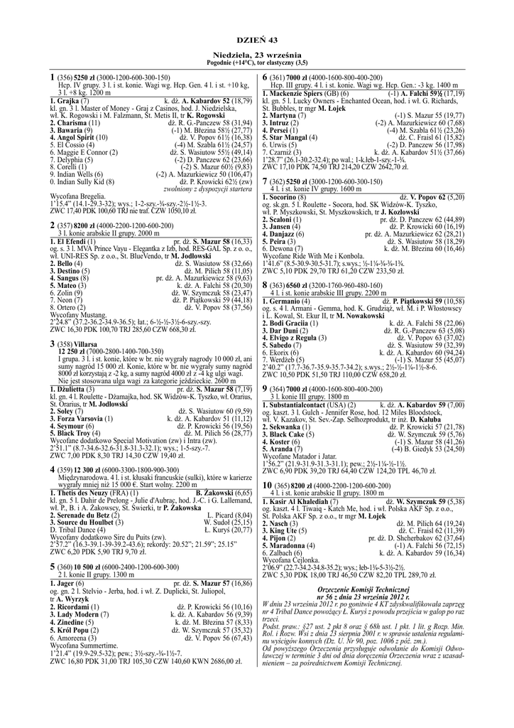 DZIEŃ 43 Niedziela, 23 września Pogodnie (+14°C), tor elastyczny (3,5) 1 (356) 5250 zł (3000-1200-600-300-150) Hcp. IV grupy. 3 l. i st. konie. Wagi wg. Hcp. Gen. 4 l. i st. +10 kg, 3 l. +8 kg. 1200 m 1. Grajka (7) k. dż. A. Kabardov 52 (18,79) kl. gn. 3 l. Master of Money - Graj z Casinos, hod. J. Niedzielska, wł. K. Rogowski i M. Falzmann, St. Metis II, tr K. Rogowski 2. Charisma (11) dż. R. G.-Panczew 58 (31,94) 3. Bawaria (9) (-1) M. Březina 58½ (27,77) 4. Angol Spirit (10) dż. V. Popov 61½ (16,38) 5. El Cossio (4) (-4) M. Szabla 61½ (24,57) 6. Maggie E Connor (2) dż. S. Wasiutow 55½ (49,14) 7. Delyphia (5) (-2) D. Panczew 62 (23,66) 8. Corelli (1) (-2) S. Mazur 60½ (9,83) 9. Indian Wells (6) (-2) A. Mazurkiewicz 50 (106,47) 0. Indian Sully Kid (8) dż. P. Krowicki 62½ (zw) zwolniony z dyspozycji startera Wycofana Bregelia. 1’15.4” (14.1-29.3-32); wys.; 1-2-szy.-¾-szy.-2½-1½-3. ZWC 17,40 PDK 100,60 TRJ nie traf. CZW 1050,10 zł. 2 (357) 8200 zł (4000-2200-1200-600-200) 3 l. konie arabskie II grupy. 2000 m 1. El Efendi (1) pr. dż. S. Mazur 58 (16,33) og. s. 3 l. MVA Prince Vayu - Elegantka z Izb, hod. RES-GAL Sp. z o. o., wł. UNI-RES Sp. z o.o., St. BlueVendo, tr M. Jodłowski 2. Bello (4) dż. S. Wasiutow 58 (32,66) 3. Destino (5) dż. M. Pilich 58 (11,05) 4. Sangus (8) pr. dż. A. Mazurkiewicz 58 (9,63) 5. Mateo (3) k. dż. A. Falchi 58 (20,30) 6. Zolin (9) dż. W. Szymczuk 58 (23,47) 7. Neon (7) dż. P. Piątkowski 59 (44,18) 8. Ortero (2) dż. V. Popov 58 (37,56) Wycofany Mustang. 2’24.8” (37.2-36.2-34.9-36.5); łat.; 6-½-½-3½-6-szy.-szy. ZWC 16,30 PDK 100,70 TRJ 285,60 CZW 668,30 zł. 3 (358) Villarsa 12 250 zł (7000-2800-1400-700-350) I grupa. 3 l. i st. konie, które w br. nie wygrały nagrody 10 000 zł, ani sumy nagród 15 000 zł. Konie, które w br. nie wygrały sumy nagród 8000 zł korzystają z -2 kg, a sumy nagród 4000 zł z -4 kg ulgi wagi. Nie jest stosowana ulga wagi za kategorie jeździeckie. 2600 m 1. Dżulietta (3) pr. dż. S. Mazur 58 (7,19) kl. gn. 4 l. Roulette - Dżamajka, hod. SK Widzów-K. Tyszko, wł. Orarius, St. Orarius, tr M. Jodłowski 2. Soley (7) dż. S. Wasiutow 60 (9,59) 3. Forza Varsovia (1) k. dż. A. Kabardov 51 (11,12) 4. Seymour (6) dż. P. Krowicki 56 (19,56) 5. Black Troy (4) dż. M. Pilich 56 (28,77) Wycofane dodatkowo Special Motivation (zw) i Intra (zw). 2’51.1” (8.7-34.6-32.6-31.8-31.3-32.1); wys.; 1-5-szy.-7. ZWC 7,00 PDK 8,30 TRJ 14,30 CZW 19,40 zł. 4 (359) 12 300 zł (6000-3300-1800-900-300) Międzynarodowa. 4 l. i st. kłusaki francuskie (sulki), które w karierze wygrały mniej niż 15 000 €. Start wolny. 2200 m 1. Thetis des Neuzy (FRA) (1) B. Żakowski (6,65) kl. gn. 5 l. Dahir de Prelong - Julie d'Aubrac, hod. J.-C. i G. Lallemand, wł. P., B. i A. Żakowscy, St. Świerki, tr P. Żakowska 2. Serenade du Betz (2) L. Picard (8,04) 3. Source du Houlbet (3) W. Sudoł (25,15) D. Tribal Dance (4) Ł. Kuryś (20,77) Wycofany dodatkowo Sire du Puits (zw). 2’57.2” (16.3-39.1-39-39.2-43.6); rekordy: 20.52”; 21.59”; 25.15” ZWC 6,20 PDK 5,90 TRJ 9,70 zł. 5 (360) 10 500 zł (6000-2400-1200-600-300) 2 l. konie II grupy. 1300 m 1. Jager (6) pr. dż. S. Mazur 57 (16,86) og. gn. 2 l. Stelvio - Jerba, hod. i wł. Z. Duplicki, St. Juliopol, tr A. Wyrzyk 2. Ricordami (1) dż. P. Krowicki 56 (10,16) 3. Lady Modern (7) k. dż. A. Kabardov 56 (9,39) 4. Zinedine (5) k. dż. M. Březina 57 (8,33) 5. Król Popu (2) dż. W. Szymczuk 57 (35,32) 6. Amoreena (3) dż. V. Popov 56 (67,43) Wycofana Summertime. 1’21.4” (19.9-29.5-32); pew.; 3½-szy.-¾-1½-7. ZWC 16,80 PDK 31,00 TRJ 105,30 CZW 140,60 KWN 2686,00 zł. 6 (361) 7000 zł (4000-1600-800-400-200) Hcp. III grupy. 4 l. i st. konie. Wagi wg. Hcp. Gen.: -3 kg. 1400 m 1. Mackenzie Spiers (GB) (6) (-1) A. Falchi 59½ (17,19) kl. gn. 5 l. Lucky Owners - Enchanted Ocean, hod. i wł. G. Richards, St. Bubbles, tr mgr M. Łojek 2. Martyna (7) (-1) S. Mazur 55 (19,77) 3. Intruz (2) (-2) A. Mazurkiewicz 60 (7,68) 4. Persei (1) (-4) M. Szabla 61½ (23,26) 5. Star Mangal (4) dż. C. Fraisl 61 (15,82) 6. Urwis (5) (-2) D. Panczew 56 (17,98) 7. Czarniż (3) k. dż. A. Kabardov 51½ (37,66) 1’28.7” (26.1-30.2-32.4); po wal.; 1-k.łeb-1-szy.-1-¾. ZWC 17,10 PDK 74,50 TRJ 214,20 CZW 2642,70 zł. 7 (362) 5250 zł (3000-1200-600-300-150) 4 l. i st. konie IV grupy. 1600 m 1. Socorino (8) dż. V. Popov 62 (5,20) og. sk.gn. 5 l. Roulette - Socora, hod. SK Widzów-K. Tyszko, wł. P. Myszkowski, St. Myszkowskich, tr J. Kozłowski 2. Scaloni (1) pr. dż. D. Panczew 62 (44,89) 3. Jansen (4) dż. P. Krowicki 60 (16,19) 4. Danjazz (6) pr. dż. A. Mazurkiewicz 62 (28,21) 5. Peira (3) dż. S. Wasiutow 58 (18,29) 6. Dewona (7) k. dż. M. Březina 60 (16,46) Wycofane Ride With Me i Konbola. 1’41.6” (8.5-30.9-30.5-31.7); s.wys.; ½-1¼-¾-¾-1¾. ZWC 5,10 PDK 29,70 TRJ 61,20 CZW 233,50 zł. 8 (363) 6560 zł (3200-1760-960-480-160) 4 l. i st. konie arabskie III grupy. 2200 m 1. Germanio (4) dż. P. Piątkowski 59 (10,58) og. s. 4 l. Armani - Gemma, hod. K. Grudziąż, wł. M. i P. Włostowscy i L. Kowal, St. Ekur II, tr M. Nowakowski 2. Bodi Graciia (1) k. dż. A. Falchi 58 (22,06) 3. Dar Duni (2) dż. R. G.-Panczew 63 (5,08) 4. Elvigo z Reguła (3) dż. V. Popov 63 (37,02) 5. Sabedo (7) dż. S. Wasiutow 59 (32,39) 6. Ekorix (6) k. dż. A. Kabardov 60 (94,24) 7. Werdżeb (5) (-1) S. Mazur 55 (45,07) 2’40.2” (17.7-36.7-35.9-35.7-34.2); s.wys.; 2½-½-1¼-1½-8-6. ZWC 10,50 PDK 51,50 TRJ 110,00 CZW 658,20 zł. 9 (364) 7000 zł (4000-1600-800-400-200) 3 l. konie III grupy. 1800 m 1. Substantialcontact (USA) (2) k. dż. A. Kabardov 59 (7,00) og. kaszt. 3 l. Gulch - Jennifer Rose, hod. 12 Miles Bloodstock, wł. V. Kazakov, St. Sev.-Zap. Selhozprodukt, tr inż. D. Kałuba 2. Sekwanka (1) dż. P. Krowicki 57 (21,78) 3. Black Cake (5) dż. W. Szymczuk 59 (5,76) 4. Koster (6) (-1) S. Mazur 58 (41,26) 5. Aranda (7) (-4) B. Giedyk 53 (24,50) Wycofane Matador i Jatar. 1’56.2” (21