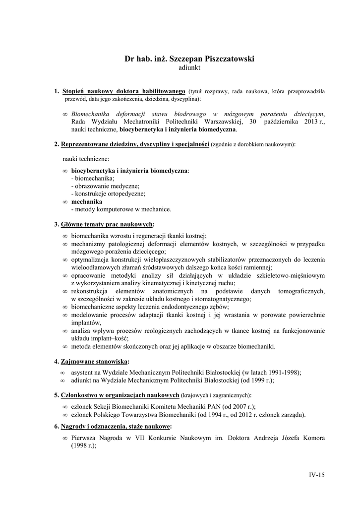Dr hab. inż. Szczepan Piszczatowski adiunkt 1. Stopień naukowy doktora habilitowanego (tytuł rozprawy, rada naukowa, która przeprowadziła przewód, data jego zakończenia, dziedzina, dyscyplina): • Biomechanika deformacji stawu biodrowego w mózgowym porażeniu dziecięcym, Rada Wydziału Mechatroniki Politechniki Warszawskiej, 30 października 2013 r., nauki techniczne, biocybernetyka i inżynieria biomedyczna. 2. Reprezentowane dziedziny, dyscypliny i specjalności (zgodnie z dorobkiem naukowym): nauki techniczne: • biocybernetyka i inżynieria biomedyczna: - biomechanika; - obrazowanie medyczne; - konstrukcje ortopedyczne; • mechanika - metody komputerowe w mechanice. 3. Główne tematy prac naukowych: • biomechanika wzrostu i regeneracji tkanki kostnej; • mechanizmy patologicznej deformacji elementów kostnych, w szczególności w przypadku mózgowego porażenia dziecięcego; • optymalizacja konstrukcji wielopłaszczyznowych stabilizatorów przeznaczonych do leczenia wieloodłamowych złamań śródstawowych dalszego końca kości ramiennej; • opracowanie metodyki analizy sił działających w układzie szkieletowo-mięśniowym z wykorzystaniem analizy kinematycznej i kinetycznej ruchu; • rekonstrukcja elementów anatomicznych na podstawie danych tomograficznych, w szczególności w zakresie układu kostnego i stomatognatycznego; • biomechaniczne aspekty leczenia endodontycznego zębów; • modelowanie procesów adaptacji tkanki kostnej i jej wrastania w porowate powierzchnie implantów, • analiza wpływu procesów reologicznych zachodzących w tkance kostnej na funkcjonowanie układu implant–kość; • metoda elementów skończonych oraz jej aplikacje w obszarze biomechaniki. 4. Zajmowane stanowiska: • • asystent na Wydziale Mechanicznym Politechniki Białostockiej (w latach 1991-1998); adiunkt na Wydziale Mechanicznym Politechniki Białostockiej (od 1999 r.); 5. Członkostwo w organizacjach naukowych (krajowych i zagranicznych): • członek Sekcji Biomechaniki Komitetu Mechaniki PAN (od 2007 r.); • członek Polskiego Towarzystwa Biomechaniki (od 1994 r., od 2012 r. członek zarządu). 6. Nagrody i odznaczenia, staże naukowe: • Pierwsza Nagroda w VII Konkursie Naukowym im. Doktora Andrzeja Józefa Komora (1998 r.); IV-15 • Wyróżnienie w konkursie na pracę roku 2006 czasopisma Ortopedia, Traumatologia, Rehabilitacja; • Medal Komisji Edukacji Narodowej (2012 r.); • nagrody indywidualne i zespołowe Rektora Politechniki Białostockiej (w latach: 1999, 2004, 2005, 2008, 2009, 2010, 2011, 2012, 2013). 7. Osiągnięcia w kształceniu kadry naukowej: • opiekun naukowy 1 doktoranta na Wydziale Mechanicznym PB; 8. Organizacja konferencji, redakcja czasopism, recenzje: • przewodniczący Komitetu Organizacyjnego International Conference of the Polish Society of Biomechanics BIOMECHANICS 2012, Białystok, 2012; • członek Komitetu Organizacyjnego cyklicznego Sympozjum Inżynieria Ortopedyczna i Protetyczna w latach 1998-2001; • członek Komitetu Naukowego International Conference of the Polish Society of Biomechanics BIOMECHANICS 2014, Łódź, 2014; • redakcja materiałów konferencyjnych Book of abstract International Conference of the Polish Society of Biomechanics BIOMECHANICS 2012, • recenzowanie prac w czasopismach, m.in.: Journal of Biomechanics, Acta of Bioengineering and Biomechanics. 9. Projekty badawcze: • kierownik 1 projektu badawczego MNiSW realizowanego w Politechnice Białostockiej: Nr N518 043 32/3352 pt. Prognozowanie przebiegu procesów adaptacji funkcjonalnej tkanki kostnej będących skutkiem podejmowanych działań terapeutycznych (2007-2010) – grant habilitacyjny; • główny wykonawca w 1 projekcie badawczym Komitetu Badań Naukowych; • kierownik wykonawczy projektu Program dostosowania kwalifikacji pracowników restrukturyzowanych przedsiębiorstw do standardów firm stosujących nowoczesne metody produkcji w województwie podlaskim finansowanego ze środków Europejskiego Funduszu Społecznego (2006-2007); • kierownik 4 projektów badawczych „własnych”. 10. Publikacje (w sumie 76): • monografie opublikowane przez ośrodki uczelniane – 1; • rozdziały w monografiach opublikowanych przez renomowane wydawnictwa lub instytucje naukowe – 4; • artykuły w czasopismach z Thomson Scientific Master Journal List z IF (tzw. lista filadelfijska) – 5; • artykuły w innych czasopismach z listy ministerialnej – 10; • materiały konferencyjne publikowane w czasopismach z listy filadelfijskiej – 8, • publikowane referaty na międzynarodowych konferencjach – 21; • publikowane referaty na konferencjach krajowych – 15; • patenty i wzory użytkowe – 2; • cytowania wg Web of Science (bez autocytowań) – 31; • indeks Hirscha wg Web of Science – H=2. IV-16 11. Ważniejsze prace (maks. 10 pozycji): 1. Piszczatowski S. (2012), Biomechanika deformacji stawu biodrowego w mózgowym porażeniu dziecięcym, monografia, Oficyna Wydawnicza Politechniki Białostockiej, Białystok 2. Piszczatowski S., Werner A. (2004), Projektowanie trzpieni endoprotez stawu biodrowego, w Biocybernetyka i inżynieria biomedyczna 2000, t.5: Biomechanika i inżynieria rehabilitacji (red. Będziński R., Kędzior K., Kiwerski J., Morecki A., Skalski K., Wall A., Wit A.), Akademicka Oficyna Wydawnicza EXIT, Warszawa, 957-970. 3. Piszczatowski S. (2012), Geometrical aspects of growth plate modelling using Carter’s and Stokes’s approaches, Acta Bioeng Biomech 14, 93-106, 4. Piszczatowski S. (2011), Material aspects of growth plate modelling using Carter’s and Stokes’s approaches, Acta Bioeng Biomech 13, 3-14, 5. Piszczatowski S. (2008), Analysis of the stress and strain in the children’s hip joint in the case of adductors spasticity due to cerebral palsy, Acta Bioeng Biomech 10, 51-56, 6. Werner A., Skalski K., Piszczatowski S., Lechniak Z., Święszkowski W. (1998), Reverse engineering of free form surf