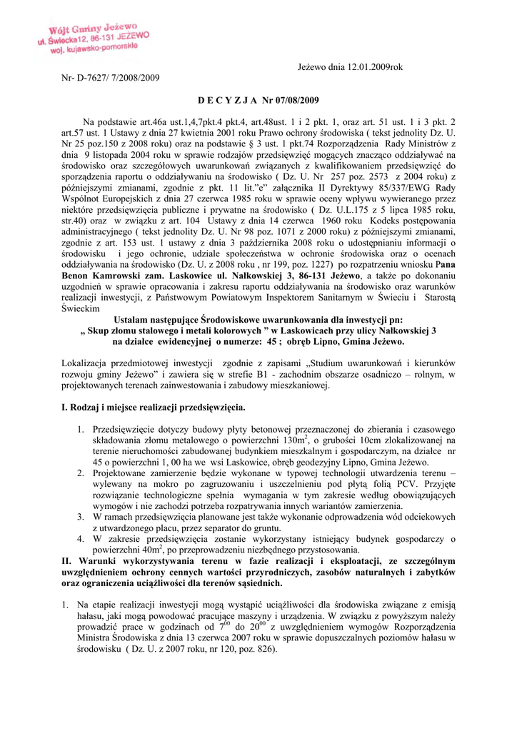 JeŜewo dnia 12.01.2009rok Nr- D-7627/ 7/2008/2009 D E C Y Z J A Nr 07/08/2009 Na podstawie art.46a ust.1,4,7pkt.4 pkt.4, art.48ust. 1 i 2 pkt. 1, oraz art. 51 ust. 1 i 3 pkt. 2 art.57 ust. 1 Ustawy z dnia 27 kwietnia 2001 roku Prawo ochrony środowiska ( tekst jednolity Dz. U. Nr 25 poz.150 z 2008 roku) oraz na podstawie § 3 ust. 1 pkt.74 Rozporządzenia Rady Ministrów z dnia 9 listopada 2004 roku w sprawie rodzajów przedsięwzięć mogących znacząco oddziaływać na środowisko oraz szczegółowych uwarunkowań związanych z kwalifikowaniem przedsięwzięć do sporządzenia raportu o oddziaływaniu na środowisko ( Dz. U. Nr 257 poz. 2573 z 2004 roku) z późniejszymi zmianami, zgodnie z pkt. 11 lit.”e” załącznika II Dyrektywy 85/337/EWG Rady Wspólnot Europejskich z dnia 27 czerwca 1985 roku w sprawie oceny wpływu wywieranego przez niektóre przedsięwzięcia publiczne i prywatne na środowisko ( Dz. U.L.175 z 5 lipca 1985 roku, str.40) oraz w związku z art. 104 Ustawy z dnia 14 czerwca 1960 roku Kodeks postępowania administracyjnego ( tekst jednolity Dz. U. Nr 98 poz. 1071 z 2000 roku) z późniejszymi zmianami, zgodnie z art. 153 ust. 1 ustawy z dnia 3 października 2008 roku o udostępnianiu informacji o środowisku i jego ochronie, udziale społeczeństwa w ochronie środowiska oraz o ocenach oddziaływania na środowisko (Dz. U. z 2008 roku , nr 199, poz. 1227) po rozpatrzeniu wniosku Pana Benon Kamrowski zam. Laskowice ul. Nałkowskiej 3, 86-131 JeŜewo, a takŜe po dokonaniu uzgodnień w sprawie opracowania i zakresu raportu oddziaływania na środowisko oraz warunków realizacji inwestycji, z Państwowym Powiatowym Inspektorem Sanitarnym w Świeciu i Starostą Świeckim Ustalam następujące Środowiskowe uwarunkowania dla inwestycji pn: „ Skup złomu stalowego i metali kolorowych ” w Laskowicach przy ulicy Nałkowskiej 3 na działce ewidencyjnej o numerze: 45 ; obręb Lipno, Gmina JeŜewo. Lokalizacja przedmiotowej inwestycji zgodnie z zapisami „Studium uwarunkowań i kierunków rozwoju gminy JeŜewo” i zawiera się w strefie B1 - zachodnim obszarze osadniczo – rolnym, w projektowanych terenach zainwestowania i zabudowy mieszkaniowej. I. Rodzaj i miejsce realizacji przedsięwzięcia. 1. Przedsięwzięcie dotyczy budowy płyty betonowej przeznaczonej do zbierania i czasowego składowania złomu metalowego o powierzchni 130m2, o grubości 10cm zlokalizowanej na terenie nieruchomości zabudowanej budynkiem mieszkalnym i gospodarczym, na działce nr 45 o powierzchni 1, 00 ha we wsi Laskowice, obręb geodezyjny Lipno, Gmina JeŜewo. 2. Projektowane zamierzenie będzie wykonane w typowej technologii utwardzenia terenu – wylewany na mokro po zagruzowaniu i uszczelnieniu pod płytą folią PCV. Przyjęte rozwiązanie technologiczne spełnia wymagania w tym zakresie według obowiązujących wymogów i nie zachodzi potrzeba rozpatrywania innych wariantów zamierzenia. 3. W ramach przedsięwzięcia planowane jest takŜe wykonanie odprowadzenia wód odciekowych z utwardzonego placu, przez separator do gruntu. 4. W zakresie przedsięwzięcia zostanie wykorzystany istniejący budynek gospodarczy o powierzchni 40m2, po przeprowadzeniu niezbędnego przystosowania. II. Warunki wykorzystywania terenu w fazie realizacji i eksploatacji, ze szczególnym uwzględnieniem ochrony cennych wartości przyrodniczych, zasobów naturalnych i zabytków oraz ograniczenia uciąŜliwości dla terenów sąsiednich. 1. Na etapie realizacji inwestycji mogą wystąpić uciąŜliwości dla środowiska związane z emisją hałasu, jaki mogą powodować pracujące maszyny i urządzenia. W związku z powyŜszym naleŜy prowadzić prace w godzinach od 700 do 2000 z uwzględnieniem wymogów Rozporządzenia Ministra Środowiska z dnia 13 czerwca 2007 roku w sprawie dopuszczalnych poziomów hałasu w środowisku ( Dz. U. z 2007 roku, nr 120, poz. 826). -22. Teren inwestycji obejmuje część wyŜej wymienionej działki na terenie zabudowanym budynkami mieszkalnymi i mieszkalno-usługowymi, w części objętej zamierzeniem – grunty naleŜą do części zabudowanej nieruchomości, na której dotychczas prowadzona była działalność tego samego rodzaju – skup złomu metalowego. 3. Prace budowlane roślinności trwałej. prowadzić w taki sposób aby ograniczyć w miarę moŜliwości straty w 4. UciąŜliwości związane z realizacja przedsięwzięcia naleŜy ograniczyć do granic działki ewidencyjnej obejmującej inwestycję, w obrębie terenu objętego projektem zagospodarowania działki. 5. Rodzaj stosowanej technologii polega na: - zastosowaniu do wykonania sprawdzonej technologii – utwardzenia części działki płytą betonową, pod która naleŜy wykonać uszczelnienie gruntu folią PCV zgodnie z normami w tym zakresie zabezpieczającą wody gruntowe przed przenikaniem odcieków z terenu utwardzonego, - ponadto odcieki z placu utwardzonego naleŜy zbierać do studzienki – separatora i po podczyszczeniu odprowadzać do ziemi na działce inwestora, - pojemność studzienki zbiorczej do podczyszczenia ścieków naleŜy obliczyć w celu właściwego przetrzymania odcieków ( minimum 4 godziny), - zbieraniu rozdrobnionego złomu w kontenerach metalowych, 6. Na etapie wykonania oraz eksploatacji powstające ścieki naleŜy odprowadzić do gruntu, po przetrzymaniu i podczyszczeniu w separatorze ścieków. 7. Etap eksploatacji inwestycji polegać będzie na uŜytkowaniu wybudowanego utwardzonego placu składowego nie powodującego negatywnego oddziaływania na środowisko. 8. W trakcie eksploatacji naleŜy spełnić warunki dotyczące monitoringu wprowadzania ścieków do wód lub do ziemi, zgodnie z normami określonymi w Rozporządzeniu Ministra Środowiska z dnia 8 lipca 2004 roku, w sprawie warunków jakie naleŜy spełnić przy wprowadzaniu ścieków do wód lub do ziemi, oraz w sprawie substancji szczególnie szkodliwych dla środowiska wodnego ( Dz. U. Nr 168, poz. 1763 z 2004 r.) 