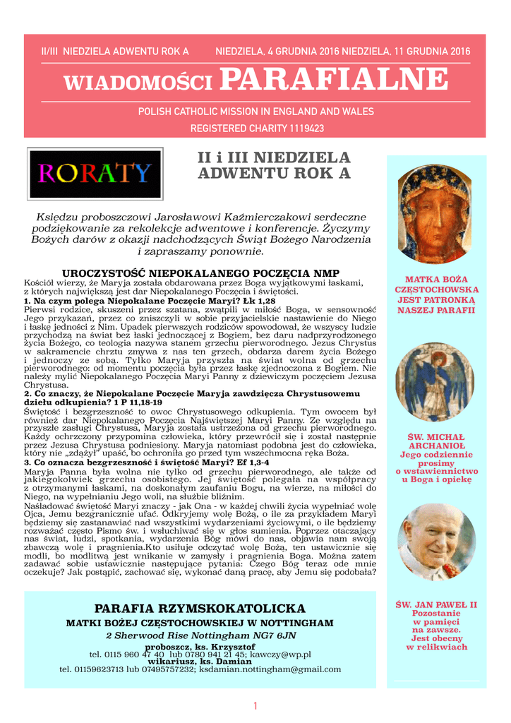 II/III NIEDZIELA ADWENTU ROK A NIEDZIELA, 4 GRUDNIA 2016 NIEDZIELA, 11 GRUDNIA 2016 WIADOMOŚCI PARAFIALNE POLISH CATHOLIC MISSION IN ENGLAND AND WALES REGISTERED CHARITY 1119423 II i III NIEDZIELA ADWENTU ROK A Księdzu proboszczowi Jarosławowi Kaźmierczakowi serdeczne podziękowanie za rekolekcje adwentowe i konferencje. Życzymy Bożych darów z okazji nadchodzących Świąt Bożego Narodzenia i zapraszamy ponownie. UROCZYSTOŚĆ NIEPOKALANEGO POCZĘCIA NMP Kościół wierzy, że Maryja została obdarowana przez Boga wyjątkowymi łaskami, z których największą jest dar Niepokalanego Poczęcia i świętości. 1. Na czym polega Niepokalane Poczęcie Maryi? Łk 1,28 Pierwsi rodzice, skuszeni przez szatana, zwątpili w miłość Boga, w sensowność Jego przykazań, przez co zniszczyli w sobie przyjacielskie nastawienie do Niego i łaskę jedności z Nim. Upadek pierwszych rodziców spowodował, że wszyscy ludzie przychodzą na świat bez łaski jednoczącej z Bogiem, bez daru nadprzyrodzonego życia Bożego, co teologia nazywa stanem grzechu pierworodnego. Jezus Chrystus w sakramencie chrztu zmywa z nas ten grzech, obdarza darem życia Bożego i jednoczy ze sobą. Tylko Maryja przyszła na świat wolna od grzechu pierworodnego: od momentu poczęcia była przez łaskę zjednoczona z Bogiem. Nie należy mylić Niepokalanego Poczęcia Maryi Panny z dziewiczym poczęciem Jezusa Chrystusa. 2. Co znaczy, że Niepokalane Poczęcie Maryja zawdzięcza Chrystusowemu dziełu odkupienia? 1 P 11,18-19 Świętość i bezgrzeszność to owoc Chrystusowego odkupienia. Tym owocem był również dar Niepokalanego Poczęcia Najświętszej Maryi Panny. Ze względu na przyszłe zasługi Chrystusa, Maryja została ustrzeżona od grzechu pierworodnego. Każdy ochrzczony przypomina człowieka, który przewrócił się i został następnie przez Jezusa Chrystusa podniesiony. Maryja natomiast podobna jest do człowieka, który nie „zdążył” upaść, bo ochroniła go przed tym wszechmocna ręka Boża. 3. Co oznacza bezgrzeszność i świętość Maryi? Ef 1,3-4 Maryja Panna była wolna nie tylko od grzechu pierworodnego, ale także od jakiegokolwiek grzechu osobistego. Jej świętość polegała na współpracy z otrzymanymi łaskami, na doskonałym zaufaniu Bogu, na wierze, na miłości do Niego, na wypełnianiu Jego woli, na służbie bliźnim. Naśladować świętość Maryi znaczy - jak Ona - w każdej chwili życia wypełniać wolę Ojca, Jemu bezgranicznie ufać. Odkryjemy wolę Bożą, o ile za przykładem Maryi będziemy się zastanawiać nad wszystkimi wydarzeniami życiowymi, o ile będziemy rozważać często Pismo św. i wsłuchiwać się w głos sumienia. Poprzez otaczający nas świat, ludzi, spotkania, wydarzenia Bóg mówi do nas, objawia nam swoją zbawczą wolę i pragnienia.Kto usiłuje odczytać wolę Bożą, ten ustawicznie się modli, bo modlitwą jest wnikanie w zamysły i pragnienia Boga. Można zatem zadawać sobie ustawicznie następujące pytania: Czego Bóg teraz ode mnie oczekuje? Jak postąpić, zachować się, wykonać daną pracę, aby Jemu się podobała? MATKA BOŻA CZĘSTOCHOWSKA JEST PATRONKĄ NASZEJ PARAFII PARAFIA RZYMSKOKATOLICKA ŚW. JAN PAWEŁ II Pozostanie w pamięci na zawsze. Jest obecny w relikwiach MATKI BOŻEJ CZĘSTOCHOWSKIEJ W NOTTINGHAM 2 Sherwood Rise Nottingham NG7 6JN proboszcz, ks. Krzysztof tel. 0115 960 47 40 lub 0780 941 21 45; [email protected] wikariusz, ks. Damian tel. 01159623713 lub 07495757232; [email protected] 1 ŚW. MICHAŁ ARCHANIOŁ Jego codziennie prosimy o wstawiennictwo u Boga i opiekę INTENCJA MSZALNE Co mógłby mi powiedzieć Bóg, gdy przygotowuję się do rozmowy z niemiłą osobą, gdy muszę wykonać nieprzyjemną pracę itp.? 4. Co znaczy, że Maryja ukazuje nam wielkość zbawczej działalności Ojca, Syna i Ducha Świętego? Trójosobowy Bóg zbawia człowieka i pragnie jego współpracy w swoim zbawczych dziele. Na przykładzie Maryi widzimy, czego może dokonać Bóg w człowieku, który z Nim współdziała. Matka Najświętsza poddała się zbawczemu oddziaływaniu Boga Ojca, Syna i Ducha Świętego. Rozważmy wpływ trzech osób Trójcy Świętej na Maryję. Przedwieczny Ojciec wzywa ludzi do współdziałania z Nim w zbawianiu świata. Zgodnie z Jego planem, Maryja miała być Matką Jezusa Chrystusa, Jego Syna, który przyniósł nam wieczne zbawienie, na co wyraziła swoją zgodę. Bogurodzica osiągnęła niezwykłą wielkość, gdyż nie sprzeciwiła się woli Boga Ojca. (opr. ks. Michał Kaszowski) INTENCJE MSZY ŚWIĘTYCH 3 grudnia, sobota 07.30 W intencji dzieci uczestniczących w roratach 14.00 W intencji Stanisławy i dzieci o Boże błogosławieństwo Boże i dary Ducha Świętego 17.00 W intencji Margaretek - intencja dziękczynna kapłanów 4 grudnia - II NIEDZIELA ADWENTU 09.30 +Ewa Kucułyma w 8 (r.ś) - intencja cioci z rodziną 11.00 O Boże błogosławieństwo i opiekę Matki Bożej dla Marysi z okazji urodzin 12.30 Dziękczynna za dar życia i chrztu świętego Lily oraz z prośbą o Boże błogosławieństwo i potrzebne łaski 19.00 + Maria - intencja babci z rodziną 5 grudnia poniedziałek 07.30 Za Dusze w czyśćcu cierpiące 10.00 +Jadwiga Baranowska - intencja siostry 6 grudnia, wtorek 07.30 Za Dusze w czyśćcu cierpiące 10.00 (koronka do Bożego Miłosierdzia) +Józefa i Tadeusz Lurc 7 grudnia, środa 07.30 Za Dusze w czyśćcu cierpiące 10.00 +Fabian Świderski w rocz. śmierci intencja żony i dzieci 8 grudnia, czwartek Uroczystość Niepokalanego Poczęcia NMP 07.30 W intencji Moniki o szczęśliwe rozwiązanie i Boże błogosławieństwo 10.00 W intencji Żywej Róży o Boże błogosławieństwo 11.00 - 12.00 GODZINA ŚWIĘTA 19.00 +Seweryna Macholak (k) w 2 rocznicę śmierci 9 grudnia, piątek 07.30 W intencji Księdza Proboszcza 10.00 +Fabian Świderski - intencja żony i dzieci 19.00 +Leonidas Kliszewicz w 7 (r.ś) - intencja córki Ali, syna Wiesia i wnuków 10 grudnia, sobota 07
