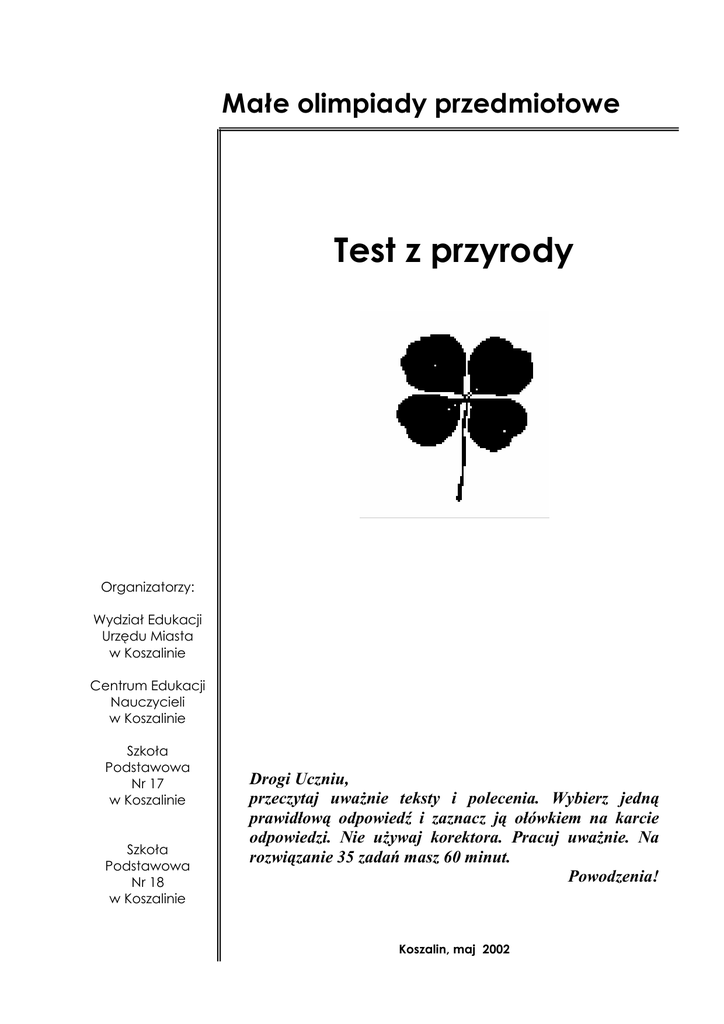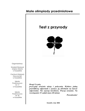 Małe olimpiady przedmiotowe Test z przyrody Organizatorzy: Wydział Edukacji Urzędu Miasta w Koszalinie Centrum Edukacji Nauczycieli w Koszalinie Szkoła Podstawowa Nr 17 w Koszalinie Szkoła Podstawowa Nr 18 w Koszalinie Drogi Uczniu, przeczytaj uwaŜnie teksty i polecenia. Wybierz jedną prawidłową odpowiedź i zaznacz ją ołówkiem na karcie odpowiedzi. Nie uŜywaj korektora. Pracuj uwaŜnie. Na rozwiązanie 35 zadań masz 60 minut. Powodzenia! Koszalin, maj 2002 1. Jasia znalazła nieznane sobie stworzonko, które posiadało: głowę, tułów, odwłok, trzy pary odnóŜy, dwie pary skrzydeł. Jest to z pewnością: A – skorupiak B – pajęczak C – owad D – stonoga 2.Sposób rozmnaŜania zwany pączkowaniem spotykamy u: A – myszy, koralowca, fiołka B – koralowca, stułbi, droŜdŜy C – droŜdŜy, chełbi, salamandry D – kukułki, koralowca, chełbi 3.Symbioza to takie współŜycie dwóch organizmów, w którym oba odnoszą w trakcie tego związku korzyści. WskaŜ, gdzie nie występuje symbioza: A – porost C – bakterie brodawkowekoniczyna D – kocica- kociątko B – ukwiał- rak pustelnik 4.Komórki parzydełkowe występują: A – u jamochłonów B – u płazińców C – u gadów D – w roślinach 5.Pajęczaki, które wywołują lub przenoszą choroby u ludzi to: A - kleszcze, świerzbowiec B - komar widliszek, giez C - tasiemiec, owsik D - pijawka, włosień 6.Łososie wędrują na tarło: A – z rzek do mórz B – z morza w górę rzek C – ze strumieni do duŜych rzek D – z rzek do jezior 7.Jaja płazów to: A – ikra B – mlecz C – zarodniki D – skrzek 2 8.WskaŜ grupy kręgowców stosujących echolokację: A – koty i gryzonie B – wieloryby i koty C – delfiny i nietoperze D – słonie i krokodyle 9.Wszystkie ssaki, bez wyjątku: C – Ŝyją wyłącznie na lądzie D – młode karmią wydzieliną gruczołów mlekowych A – posiadają doskonały wzrok B – mają całe ciało pokryte sierścią 10.Najmniejszym Parkiem narodowym w Polsce jest: A – Tatrzański Park Narodowy B – Ojcowski Park Narodowy C - Woliński Park narodowy D - Słowiński Park narodowy 11.Głównym produktem procesu fotosyntezy jest: A – chlorofil B – insulina C – glukoza D – tlen 12.Podstawowa funkcja kwiatu to: A – ozdobna B – rozmnaŜania C – oddychania D – lecznicza 13.Z podanych cech magnetyzmu zaznacz fałszywą: A – Ziemia wytwarza pole magnetyczne, co moŜemy sprawdzić kompasem B – jednoimienne bieguny magnesu odpychają się, róŜnoimienne przyciągają C – jednoimienne bieguny magnesu przyciągają się, róŜnoimienne odpychają D – magnes przyciąga przedmioty z Ŝelaza 14.Z podanych cech dźwięku zaznacz prawdziwą: A – źródłem dźwięku są drgające przedmioty B – dźwięk rozchodzi się z większą prędkością niŜ światło C – fale dźwiękowe rozchodzą się w próŜni D – dźwięk nie rozchodzi się w wodzie 3 15.Adaś sprawdzał właściwości magnesu, do magnesu nie „przykleiła” się: A - szpilka B - pineska C - metalowa spinka do włosów D - zapałka 16.Nie znajdziemy szyszki pod: C – jodłą D – modrzewiem A – sosną B – świerkiem 17.Brak witaminy D powoduje: A – przeziębienie B – krótkowzroczność C – krzywicę D – anemię 18.OwadoŜerna roślina rosnąca na torfowiskach to: A – tygrysówka B – rosiczka C – lwia paszcza D – mikołajek nadmorski 19.Formą wypoczynku czynnego nie jest: A – bieganie B – pływanie C – jazda na rowerze D - czytanie ksiąŜek 20.Chorobą zakaźną jest: C – niestrawność D – cukrzyca A – złamanie nogi B – ospa wietrzna 21.NajwyŜszy szczyt Polski Rysy ma wysokość 2499m n.p.m a najniŜej połoŜone miejsce Raczki Elbląskie 1,8 m p.p.m. Które wyraŜenie arytmetyczne pozwoli obliczyć róŜnicę wysokości? A -2499 + 1,8 B 2499 – (-1,8) C 2499 + (-1,8) D 2499 – 1,8 22.WskaŜ nieprawidłowe przyporządkowanie krajobrazu z miejscem występowania: A – krajobraz tundry- północna Kanada, Norwegia B – krajobraz lasów równikowych- Nizina Amazonki, Kotlina Kongo C – krajobraz wysokogórski- Alpy, Himalaje D – krajobraz stepowy- Syberia, Sahara 4 jego 23.Przeczytaj tekst i rozpoznaj kogo dotyczy: „śeglując na zachód, zamierzał odkryć nową drogę do Indii. Dotarłszy 11 października 1492r. do nieznanego lądu sądził, Ŝe przybył do Azji” A - Marko Polo B - Ferdynanda Magellana C - Jamesa Cooka D - Krzysztofa Kolumba 24.Na podstawie opisu rozpoznaj typ krajobrazu: Jest to obszar bezleśny. Lato krótkie i chłodne trwające niespełna trzy miesiące, zima długa i mroźna. Występują jedynie mchy i porosty, w szczególności chrobotki: A – preria B – sawanna C – tundra D – tajga 25.Zaznacz szereg, w którym znajdują się wyłącznie osady atmosferyczne A – szron, rosa, gołoledź B – szadź, mŜawka, rosa C – gołoledź, śnieg, grad D – deszcz, szron, szadź. 26.Temperaturę powietrza mierzymy w jednostkach: A – hektopaskalach B – stopniach Celsjusza C – skali Beauforta D – centymetrach 27.Które z wymienionych elementów kojarzą się z rzeką: C-klif, wodospad, grzbiet oceaniczny D - mielizna, plaŜa, szelf A-meander, szelf, rów oceaniczny B - koryto, nurt, starorzecze 28.Które zdanie jest prawdziwe: A - wiatr jest pionowym ruchem powietrza B - barometr to przyrząd do pomiaru prędkości wiatru C - w górach wraz ze wzrostem wysokości spada temperatura powietrza D - w górach wraz ze wzrostem wysokości wzrasta temperatura powietrza 5 Legenda: schronisko Mapa poziomicowa przedstawia ukształtowanie terenu. 29.Który punkt jest najwyŜszy? A–A B–B C–C D–D 30.Na jakiej wysokości leŜy schronisko? A – 500 m n.p.m B – 400 m n.p.m C – 300 m n.p.m D – 200 m n.p.m 31.Jaką wysokość musi pokonać turysta wyruszający ze schroniska do punktu A A – 345 m B – 150 m C – 270 m D – 245 m 32.Mapa przedstawia obszar: A – wyŜynny B – górski C – niz