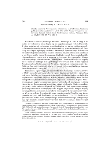 [801] Recenzje i omówienia 111 http://dx.doi.org/10.15762/ZH.2015.58 Monika Jusupović, Prowincjonalna elita litewska w XVIII wieku. Działalność polityczna rodziny Zabiełłów w latach 1733–1795, Polskie Towarzystwo Historyczne, Instytut Historii PAN, Wydawnictwo Neriton, Warszawa 2014, ss. 488, ISBN 978–83–7543–318–0. Badania nad szlachtą Wielkiego Księstwa Litewskiego z XVIII w. mają to do siebie, że większość z nich skupia się na najpotężniejszych rodach litewskich. O wiele mniej uwagi poświęcono przedstawicielom czy całym rodzinom szlachty litewskiej nienależącym do kręgu magnaterii czy grona najważniejszych działaczy związanych z polityką centralną1. Dominacja Sapiehów czy Czartoryskich nie odbierała jednak znaczenia średniej szlachcie. Ta jako lokalna elita działająca w obrębie powiatów stanowiła podporę polityki pierwszych domów szlacheckich, odgrywała zatem istotną rolę w systemie politycznym Rzeczypospolitej Obojga Narodów. Jedną z takich rodzin na Litwie był ród Zabiełłów, który jak do tej pory nie doczekał się żadnego monograficznego opracowania. Lukę tę ma wypełnić Prowincjonalna elita litewska w XVIII wieku. Działalność polityczna rodziny Zabiełłów w latach 1733–1795 pióra badaczki historii politycznej Wielkiego Księstwa Litewskiego Moniki Jusupović2. Praca składa się ze wstępu, czterech rozdziałów (Genealogia rodziny Zabiełłów w XVIII wieku; Zaplecze materialne i społeczne działalności Zabiełłów; Działalność polityczna Zabiełłów za panowania Augusta III; Działalność polityczna Zabiełłów za panowania Stanisława Augusta). Autorka postawiła sobie za cel pokazać działalność polityczną Zabiełłów w czasie rządów Augusta III i Stanisława Augusta Poniatowskiego, ale najpierw prezentuje przedstawicieli rodu, ich powiązania rodzinne i drogi karier. Ta spora grupa rozszerzona zostaje o członków fakcji, stronników, przyjaciół – ludzi, na których opierali się Zabiełłowie. Obok zaplecza społecznego podstawą działalności rodziny były liczne majątki, co podkreśla związek między karierą polityczną a statusem materialnym poszczególnych reprezentantów rodziny. W swego rodzaju drugiej części pracy autorka omawia Zabiełłów pod kątem prowadzonej przez nich działalności politycznej w latach 1733–1795. Rodzina zaprezentowana zostaje na tle „niezrywalnego” sejmiku kowieńskiego, dlatego dzieje tego zgromadzenia szlachty oraz wpływ nań Zabiełłów należą do podstawowych 1 Trudno tutaj wymienić wszystkie litewskie rody, które nie doczekały się własnej monografii. Łatwiej wskazać na opracowania istniejące, jak np. Dzieje rodziny Ciechanowieckich herbu Dąbrowa (XIV–XXI wiek), red. Andrzej Rachuba, Warszawa 2013; Lech Tomasz Jabłoński, Z dziejów rodu Kierbedziów, Warszawa 2003; Czesław Sawicz, 500 lat rodu Sawiczów herbu Sulima. Zbiór dokumentów, Warszawa 2007. 2 Zob. Monika Jusupović, Działalność Adama Kazimierza Czartoryskiego na początku Sejmu Czteroletniego, Kwartalnik Historyczny, R. 116: 2009, nr 3, s. 43–72; eadem, Bajorų identifikavimo problemos sprendimas remiantis Juozapų ir Simonų Zabielų pavyzdžiu, Lietuvos istorijos metraštis, 2011, [t.] 1, s. 19–32. w w w. z a p i s k i h i s t o r y c z n e . p l 112 Recenzje i omówienia [802] problemów Prowincjonalnej elity litewskiej. Kowno nie jest jedynym obszarem badawczym recenzowanej pracy. Chcąc pokazać starania Zabiełłów o stworzenie własnego stronnictwa, autorka wykracza poza wymieniony obszar i prezentuje inne powiaty – najczęściej upicki i wiłkomierski. Obok podsumowania praca ma cenny indeks osób i nazw geograficznych, a także bibliografię prac i źródeł (z osobnym spisem tytułowym) wykorzystanych w analizie. Dodatkowo książka została zaopatrzona w aneks, w którym znajduje się spis majątków posiadanych i dzierżawionych przez Zabiełłów w XVIII w. Autorka dokonała kwerendy w krajowych archiwach znajdujących się w Warszawie, Krakowie, Kórniku, we Wrocławiu oraz zbadała dokumenty przechowywane za granicą – w Wilnie, Mińsku i Moskwie. Nic zatem dziwnego, że omawiana praca imponuje liczbą źródeł wykorzystanych do omówienia działalności Zabiełłów w XVIII w. Te uzupełnione są literaturą poświęconą życiu sejmikowemu Wielkiego Księstwa Litewskiego oraz dziejom sejmu Rzeczypospolitej Obojga Narodów w latach 1733–1795, na czele z najważniejszymi pracami Wojciecha Kriegseisena, Zofii Zielińskiej i Jerzego Michalskiego. Pierwszy rozdział poświęcony został genealogii Zabiełłów od XV do XVIII w. Odtworzenie pochodzenia rodu nastręcza sporo problemów. Ustaleniom Teodora Żychlińskiego, jakoby Zabiełłowie mieli pochodzić od Zbylutów, za czym przemawia podobieństwo nazwiska i wspólny herb, nie można dać wiary. Nie potwierdza tych informacji zarówno Bartosz Paprocki, jak i Adam Kosiński. Autorka rodowód Zabiełłów przyjmuje za ustaleniami Witolda Sienkiewicza, zgodnie z którymi ród wywodzi się od żyjącego w drugiej połowie XV w. litewskiego bojara Totwojsza3. To od jego syna Chrzona i wnuka Macieja można wyznaczyć pewne korzenie rodziny. Dopiero jednak Zabiełłowie żyjący w XVII w. rozpoczynają powolne stawianie kroków w karierze urzędniczej. Ich działalność początkowo związana jest z kilkoma ziemiami – powiatem wileńskim, wiłkomierskim i naturalnie kowieńskim. Autorka również obala tezę, jakoby pod bitwie pod Wiedniem za sprawą Salomona (zmarłego w 1694 r.) Zabiełłowie mieli otrzymać tytuł hrabiowski od Leopolda I (s. 19). To jednak od jego synów (Mikołaja i Michała) oraz brata Szymona (zmarłego w 1700 r.) wywodziły się kolejno trzy główne gałęzi rodu Zabiełłów – linie: łabunowska, łowczowska i linia na Medekszach. O ile pierwsza z wymienionych odnóg może się pochwalić pierwszym senatorem (Jan Salomon), to z drugiej wywodził się naj