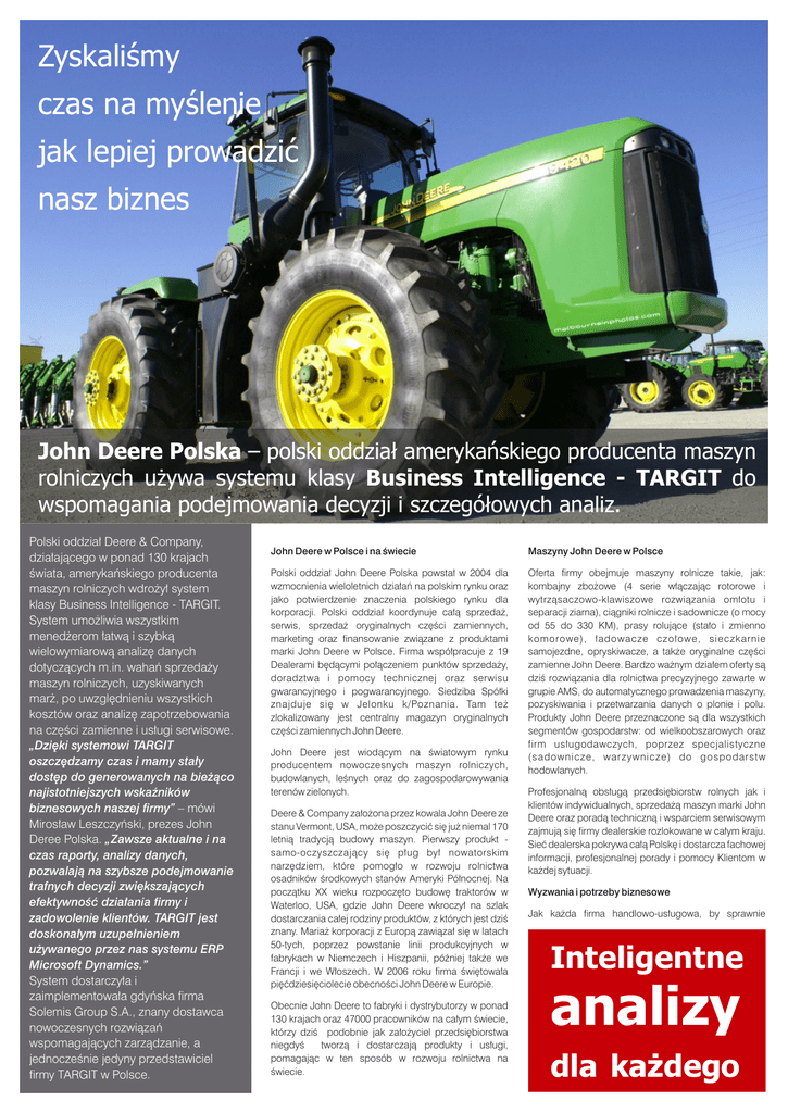 Zyskaliśmy czas na myślenie jak lepiej prowadzić nasz biznes John Deere Polska – polski oddział amerykańskiego producenta maszyn rolniczych używa systemu klasy Business Intelligence - TARGIT do wspomagania podejmowania decyzji i szczegółowych analiz. Polski oddział Deere & Company, działającego w ponad 130 krajach świata, amerykańskiego producenta maszyn rolniczych wdrożył system klasy Business Intelligence - TARGIT. System umożliwia wszystkim menedżerom łatwą i szybką wielowymiarową analizę danych dotyczących m.in. wahań sprzedaży maszyn rolniczych, uzyskiwanych marż, po uwzględnieniu wszystkich kosztów oraz analizę zapotrzebowania na części zamienne i usługi serwisowe. „Dzięki systemowi TARGIT oszczędzamy czas i mamy stały dostęp do generowanych na bieżąco najistotniejszych wskaźników biznesowych naszej firmy” – mówi Mirosław Leszczyński, prezes John Deree Polska. „Zawsze aktualne i na czas raporty, analizy danych, pozwalają na szybsze podejmowanie trafnych decyzji zwiększających efektywność działania firmy i zadowolenie klientów. TARGIT jest doskonałym uzupełnieniem używanego przez nas systemu ERP Microsoft Dynamics.” System dostarczyła i zaimplementowała gdyńska firma Solemis Group S.A., znany dostawca nowoczesnych rozwiązań wspomagających zarządzanie, a jednocześnie jedyny przedstawiciel firmy TARGIT w Polsce. John Deere w Polsce i na świecie Maszyny John Deere w Polsce Polski oddział John Deere Polska powstał w 2004 dla wzmocnienia wieloletnich działań na polskim rynku oraz jako potwierdzenie znaczenia polskiego rynku dla korporacji. Polski oddział koordynuje całą sprzedaż, serwis, sprzedaż oryginalnych części zamiennych, marketing oraz finansowanie związane z produktami marki John Deere w Polsce. Firma współpracuje z 19 Dealerami będącymi połączeniem punktów sprzedaży, doradztwa i pomocy technicznej oraz serwisu gwarancyjnego i pogwarancyjnego. Siedziba Spółki znajduje się w Jelonku k/Poznania. Tam też zlokalizowany jest centralny magazyn oryginalnych części zamiennych John Deere. Oferta firmy obejmuje maszyny rolnicze takie, jak: kombajny zbożowe (4 serie włączając rotorowe i wytrząsaczowo-klawiszowe rozwiązania omłotu i separacji ziarna), ciągniki rolnicze i sadownicze (o mocy od 55 do 330 KM), prasy rolujące (stało i zmienno komorowe), ładowacze czołowe, sieczkarnie samojezdne, opryskiwacze, a także oryginalne części zamienne John Deere. Bardzo ważnym działem oferty są dziś rozwiązania dla rolnictwa precyzyjnego zawarte w grupie AMS, do automatycznego prowadzenia maszyny, pozyskiwania i przetwarzania danych o plonie i polu. Produkty John Deere przeznaczone są dla wszystkich segmentów gospodarstw: od wielkoobszarowych oraz firm usługodawczych, poprzez specjalistyczne (sadownicze, warzywnicze) do gospodarstw hodowlanych. John Deere jest wiodącym na światowym rynku producentem nowoczesnych maszyn rolniczych, budowlanych, leśnych oraz do zagospodarowywania terenów zielonych. Deere & Company założona przez kowala John Deere ze stanu Vermont, USA, może poszczycić się już niemal 170 letnią tradycją budowy maszyn. Pierwszy produkt samo-oczyszczający się pług był nowatorskim narzędziem, które pomogło w rozwoju rolnictwa osadników środkowych stanów Ameryki Północnej. Na początku XX wieku rozpoczęto budowę traktorów w Waterloo, USA, gdzie John Deere wkroczył na szlak dostarczania całej rodziny produktów, z których jest dziś znany. Mariaż korporacji z Europą zawiązał się w latach 50-tych, poprzez powstanie linii produkcyjnych w fabrykach w Niemczech i Hiszpanii, później także we Francji i we Włoszech. W 2006 roku firma świętowała pięćdziesięciolecie obecności John Deere w Europie. Obecnie John Deere to fabryki i dystrybutorzy w ponad 130 krajach oraz 47000 pracowników na całym świecie, którzy dziś podobnie jak założyciel przedsiębiorstwa niegdyś tworzą i dostarczają produkty i usługi, pomagając w ten sposób w rozwoju rolnictwa na świecie. Profesjonalną obsługą przedsiębiorstw rolnych jak i klientów indywidualnych, sprzedażą maszyn marki John Deere oraz poradą techniczną i wsparciem serwisowym zajmują się firmy dealerskie rozlokowane w całym kraju. Sieć dealerska pokrywa całą Polskę i dostarcza fachowej informacji, profesjonalnej porady i pomocy Klientom w każdej sytuacji. Wyzwania i potrzeby biznesowe Jak każda firma handlowo-usługowa, by sprawnie Inteligentne analizy dla każdego działać na coraz bardziej konkurencyjnym rynku, John Deere potrzebuje jak najbardziej aktualnych danych o tym co dzieje się w firmie, w tym informacji od handlowców oraz o stanie magazynów. Firma ma jeden magazyn części zmiennych w siedzibie w Jelonku, ale maszyny rozlokowane są u 19 Dealerów w całej Polsce. Dziękiu temu są bliżej klienta ale pozostają pod kontrolą firmy. Dla zorientowania się w skali informacji gromadzonych w firmie można podać następujące dane: + ok. 80-90 maszyn w bieżącej ofercie dziesiątki tysięcy części zamiennych + 19 kontrahentów Dealerów sprzedających maszyny + ok. 30 partnerów odbierających części zamienne + ok. 2000 faktur VAT za maszyny rocznie i znacznie więcej za części + ok. 20 stałych raportów miesięcznie dla centrali i ok. 10 na konkretne życzenia John Deere jest firmą działającą globalnie, więc w k s i ę g o w o ś c i w y s t ę p u j e t z w. p r o b l e m wielowalutowości. Oznacza to, że zakupy i sprzedaż raportowanie są do centrali w EURO, a faktury VAT partnerom i klientom wystawiane są w złotówkach, tak też prowadzona jest księgowość w Polsce, w złotówkach też raportują handlowcy. Dodatkowo w księgowości występuje kilka okresów rozliczeniowych: na potrzeby księgowości stosowany jest kalendarzowy, na potrzeby firmy „matki” różne podziały okresów (zarówno miesięcy jak i lat) przykładowo rok rozra