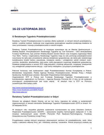 16-22 LISTOPADA 2015 O Światowym Tygodniu Przedsiębiorczości Światowy Tydzień Przedsiębiorczości to szeroka oferta wydarzeń, w ramach których przedsiębiorcy, szkoły i uczelnie wyższe, instytucje oraz organizacje pozarządowe wspólnie podejmują działania na rzecz promowania i rozwoju przedsiębiorczości w swoich krajach. Światowy Tydzień Przedsiębiorczości to inicjatywa wywodząca się ze Stanów Zjednoczonych i Wielkiej Brytanii. Pomysłodawcami Światowego Tygodnia są: Carl Schramm - CEO amerykańskiej Fundacji Kauffmanna, były premier Wielkiej Brytanii Gordon Brown oraz brytyjska organizacja Make Your Mark. Twórcy i organizatorzy Światowego Tygodnia mają na celu promocję przedsiębiorczości rozumianej nie tylko jako prowadzenie własnej działalności gospodarczej, ale także jako świadomego kształtowania ścieżki kariery zawodowej, rozwijania wiedzy i umiejętności wśród młodych ludzi– uczniów, studentów, absolwentów, start-upów, osób planujących rozpocząć działalność gospodarczą. Działania podejmowane w ramach ŚTP mają pobudzić i rozwinąć aktywność, inicjatywę, kreatywność czy umiejętność podejmowania decyzji - czyli cechy niezbędne u przyszłych przedsiębiorców. Patronat honorowy nad wydarzeniem objęli Przedstawicielstwo Komisji Europejskiej w Polsce, Ministerstwo Gospodarki, Polska Agencja Rozwoju Przedsiębiorczości, Minister Pracy i Polityki Społecznej, Konfederacja Lewiatan, Marszałek Województwa Dolnośląskiego. Organizatorem ŚTP w Polsce jest Fundacja Światowego Tygodnia Przedsiębiorczości a koordynatorem regionalnym na Pomorzu – Agencja Rozwoju Pomorza SA. Z roku na rok wydarzeń promujących przedsiębiorczość jest coraz więcej. W zeszłym roku w ŚTP na Pomorzu uczestniczyło kilka tysięcy osób. http://www.tydzienprzedsiebiorczosci.pl/ https://www.facebook.com/GEW.Poland http://www.gew.co/ Światowy Tydzień Przedsiębiorczości w Gdyni Wzorem lat ubiegłych Miasto Gdynia, już po raz ósmy, zaprasza do udziału w wydarzeniach organizowanych w ramach obchodów Światowego Tygodnia Przedsiębiorczości (ŚTP) w dniach 16– 22 listopada 2015r. W bieżącym roku wszystkie gdyńskie wydarzenia koordynowane są przez Gdyńskie Centrum Wspierania Przedsiębiorczości (GCWP) – opracowano wspólny harmonogram (załącznik nr 1) dla inicjatyw realizowanych przez GCWP, Pomorski Park Naukowo-Technologiczny, Fundację Gospodarczą oraz Powiatowy Urząd Pracy. Przygotowano szereg różnych propozycji skierowanych zarówno do przedsiębiorców, osób, które myślą o założeniu własnej firmy, jak i młodzieży szkolnej i studentów. Wśród propozycji znalazły się 1 bezpłatne szkolenia i spotkania, warsztaty, indywidualne konsultacje czy badania predyspozycji przedsiębiorczych. Zainteresowani będą mieli też okazję poznać m.in. zasady skutecznego marketingu internetowego oraz radzenia sobie z trudnościami w biznesie. Dowiedzą się jak założyć startup bez pieniędzy albo promować małą firmę. Będzie też o roli trendu w biznesie czy sposobach wykorzystania nowych technologii w komunikacji z klientami, które przedstawi Natalia Hatalska. Nie zabraknie także „tradycyjnych” tematów jak: podstawy zakładania działalności gospodarczej czy zmiany podatku VAT. ŚTP rozpocznie uroczyste spotkanie Platformy Mikroprzedsiębiorczości KLUCZ z udziałem prof. Dariusza Filara. Platforma to cykliczne spotkania biznesowe właścicieli mikro i małych firm mające na celu wymianę doświadczeń, nawiązywanie kontaktów, zdobywanie wiedzy o gospodarce, ekonomii i finansach, współpracę w różnych dziedzinach oraz rozwój osobisty. Zaplanowano także Giełdę Pracy Osób Niepełnosprawnych, która odbędzie się w Pomorskim Parku Naukowo-Technologicznym. Ciekawym wydarzeniem będzie też konferencja 2+1 Akademia Przedsiębiorczości organizowana przez 2+1 Biuro Rachunkowe pod patronatem Miasta. Skierowana jest do przedsiębiorców, którzy aktywnie prowadzą swoją firmę i nastawieni są na jej rozwój. Misją Akademii jest rozwinięcie w uczestnikach cech przedsiębiorczości oraz ukazanie jej w różnych wymiarach - jako ciągły rozwój, podążanie za trendami, innowacyjne działania i poszukiwanie nowych rozwiązań w organizacji firmy. Konferencja podzielona jest na cztery bloki tematyczne: Księgowość w praktyce, Zarządzanie firmą, Trendy w e-marketingu oraz Motywacja w biznesie – gościem specjalnym będzie Iwona Guzowska. Specjalnie dla młodzieży przygotowano lekcje i warsztaty z przedsiębiorczości połączone z projekcją filmu Startup Kids oraz Dzień Otwarty w GCWP. Wizyta w Centrum to możliwość praktycznego poznania procedury zakładania własnej firmy oraz sposobów wspierania gdyńskiej przedsiębiorczości. W ramach projektu Sukces na Szpilkach zapraszamy także na organizowane wspólnie z Agencją Rozwoju Pomorza spotkanie z kobietami, które odniosły sukces w biznesie – będzie to znakomita okazja do wymiany doświadczeń na tym polu. Projekt to możliwość zdobycia wiedzy i poszukiwania rozwiązania kobiecych dylematów pogodzenia roli żony i matki z jednej strony oraz bizneswoman z drugiej. Powiatowy Urząd Pracy w Gdyni wraz z Fundacją Gospodarczą zorganizują 19 listopada w Gdyńskim Inkubatorze Przedsiębiorczości Pomorski Dzień Przedsiębiorczości IDG. Będzie to okazja do udziału w warsztatach na temat pisania wniosków o dotację, poznania źródeł pozyskiwania środków na działalność gospodarczą, rozliczeń podatkowych w firmie oraz możliwości uzyskania różnych form wsparcia finansowego ze środków Funduszu Pracy. Dodatkowo warsztatom towarzyszyć będą konsultacje z doradcami PUP czy Polskiej Fundacji Przedsiębiorczości w zakresie badania predyspozycji przedsiębiorczych, udzielania dotacji oraz pozyskiwania środków finansowych z innych źródeł. Informacje o wydarzeniach w województwie pomorskim pojawią się wkrótce na