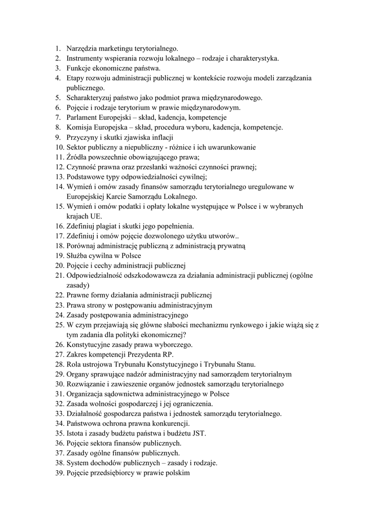 1. 2. 3. 4. Narzędzia marketingu terytorialnego. Instrumenty wspierania rozwoju lokalnego – rodzaje i charakterystyka. Funkcje ekonomiczne państwa. Etapy rozwoju administracji publicznej w kontekście rozwoju modeli zarządzania publicznego. 5. Scharakteryzuj państwo jako podmiot prawa międzynarodowego. 6. Pojęcie i rodzaje terytorium w prawie międzynarodowym. 7. Parlament Europejski – skład, kadencja, kompetencje 8. Komisja Europejska – skład, procedura wyboru, kadencja, kompetencje. 9. Przyczyny i skutki zjawiska inflacji 10. Sektor publiczny a niepubliczny - różnice i ich uwarunkowanie 11. Źródła powszechnie obowiązującego prawa; 12. Czynność prawna oraz przesłanki ważności czynności prawnej; 13. Podstawowe typy odpowiedzialności cywilnej; 14. Wymień i omów zasady finansów samorządu terytorialnego uregulowane w Europejskiej Karcie Samorządu Lokalnego. 15. Wymień i omów podatki i opłaty lokalne występujące w Polsce i w wybranych krajach UE. 16. Zdefiniuj plagiat i skutki jego popełnienia. 17. Zdefiniuj i omów pojęcie dozwolonego użytku utworów.. 18. Porównaj administrację publiczną z administracją prywatną 19. Służba cywilna w Polsce 20. Pojęcie i cechy administracji publicznej 21. Odpowiedzialność odszkodowawcza za działania administracji publicznej (ogólne zasady) 22. Prawne formy działania administracji publicznej 23. Prawa strony w postępowaniu administracyjnym 24. Zasady postępowania administracyjnego 25. W czym przejawiają się główne słabości mechanizmu rynkowego i jakie wiążą się z tym zadania dla polityki ekonomicznej? 26. Konstytucyjne zasady prawa wyborczego. 27. Zakres kompetencji Prezydenta RP. 28. Rola ustrojowa Trybunału Konstytucyjnego i Trybunału Stanu. 29. Organy sprawujące nadzór administracyjny nad samorządem terytorialnym 30. Rozwiązanie i zawieszenie organów jednostek samorządu terytorialnego 31. Organizacja sądownictwa administracyjnego w Polsce 32. Zasada wolności gospodarczej i jej ograniczenia. 33. Działalność gospodarcza państwa i jednostek samorządu terytorialnego. 34. Państwowa ochrona prawna konkurencji. 35. Istota i zasady budżetu państwa i budżetu JST. 36. Pojęcie sektora finansów publicznych. 37. Zasady ogólne finansów publicznych. 38. System dochodów publicznych – zasady i rodzaje. 39. Pojęcie przedsiębiorcy w prawie polskim 40. Zawieszenie i wznowienie działalności gospodarczej 41. Ogłaszanie aktów normatywnych i przepisów porządkowych 42. Stosunek administracyjny-pojęcie i rodzaje 43. Organ administracji publicznej- pojęcie, klasyfikacja, właściwość, zakres działania 44. Wyłączenie pracownika organu administracji publicznej 45. Zasady udzielania zamówień publicznych