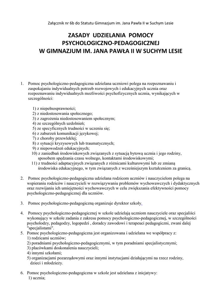 Załącznik nr 6b do Statutu Gimnazjum im. Jana Pawła II w Suchym Lesie ZASADY UDZIELANIA POMOCY PSYCHOLOGICZNO-PEDAGOGICZNEJ W GIMNAZJUM IM. JANA PAWŁA II W SUCHYM LESIE 1. Pomoc psychologiczno-pedagogiczna udzielana uczniowi polega na rozpoznawaniu i zaspokajaniu indywidualnych potrzeb rozwojowych i edukacyjnych ucznia oraz rozpoznawaniu indywidualnych możliwości psychofizycznych ucznia, wynikających w szczególności: 1) z niepełnosprawności; 2) z niedostosowania społecznego; 3) z zagrożenia niedostosowaniem społecznym; 4) ze szczególnych uzdolnień; 5) ze specyficznych trudności w uczeniu się; 6) z zaburzeń komunikacji językowej; 7) z choroby przewlekłej; 8) z sytuacji kryzysowych lub traumatycznych; 9) z niepowodzeń edukacyjnych; 10) z zaniedbań środowiskowych związanych z sytuacją bytową ucznia i jego rodziny, sposobem spędzania czasu wolnego, kontaktami środowiskowymi; 11) z trudności adaptacyjnych związanych z różnicami kulturowymi lub ze zmianą środowiska edukacyjnego, w tym związanych z wcześniejszym kształceniem za granicą. 2. Pomoc psychologiczno-pedagogiczna udzielana rodzicom uczniów i nauczycielom polega na wspieraniu rodziców i nauczycieli w rozwiązywaniu problemów wychowawczych i dydaktycznych oraz rozwijaniu ich umiejętności wychowawczych w celu zwiększania efektywności pomocy psychologiczno-pedagogicznej dla uczniów. 3. Pomoc psychologiczno-pedagogiczną organizuje dyrektor szkoły. 4. Pomocy psychologiczno-pedagogicznej w szkole udzielają uczniom nauczyciele oraz specjaliści wykonujący w szkole zadania z zakresu pomocy psychologiczno-pedagogicznej, w szczególności psycholodzy, pedagodzy, logopedzi , doradcy zawodowi i terapeuci pedagogiczni, zwani dalej "specjalistami". 5. Pomoc psychologiczno-pedagogiczna jest organizowana i udzielana we współpracy z: 1) rodzicami uczniów; 2) poradniami psychologiczno-pedagogicznymi, w tym poradniami specjalistycznymi; 3) placówkami doskonalenia nauczycieli; 4) innymi szkołami; 5) organizacjami pozarządowymi oraz innymi instytucjami działającymi na rzecz rodziny, dzieci i młodzieży. 6. Pomoc psychologiczno-pedagogiczna w szkole jest udzielana z inicjatywy: 1) ucznia; 2) rodziców ucznia; 3) dyrektora szkoły; 4) nauczyciela, wychowawcy grupy wychowawczej lub specjalisty, prowadzącego zajęcia z uczniem; 5) pielęgniarki środowiska nauczania i wychowania lub higienistki szkolnej; 6) poradni; 7) pracownika socjalnego; 8) asystenta rodziny; 9) kuratora sądowego. 7. W szkole pomoc psychologiczno-pedagogiczna jest udzielana w trakcie bieżącej pracy z uczniem oraz w formie: 1) zajęć rozwijających uzdolnienia; 2) zajęć dydaktyczno-wyrównawczych; 3) zajęć specjalistycznych: korekcyjno-kompensacyjnych, logopedycznych, socjoterapeutycznych oraz innych zajęć o charakterze terapeutycznym; 4) zajęć związanych z wyborem kierunku kształcenia i zawodu oraz planowaniem kształcenia i kariery zawodowej; 5) warsztatów; 6) porad i konsultacji. 8.W szkole pomoc psychologiczno-pedagogiczna jest udzielana rodzicom uczniów i nauczycielom w formie porad, konsultacji, warsztatów i szkoleń. 9. Zajęcia rozwijające uzdolnienia organizuje się dla uczniów szczególnie uzdolnionych oraz prowadzi się przy wykorzystaniu aktywnych metod pracy. Liczba uczestników zajęć nie może przekraczać 8. 10.Zajęcia dydaktyczno-wyrównawcze organizuje się dla uczniów mających trudności w nauce, w szczególności w spełnianiu wymagań edukacyjnych wynikających z podstawy programowej kształcenia ogólnego dla danego etapu edukacyjnego. Liczba uczestników zajęć nie może przekraczać 8. 11.Zajęcia korekcyjno-kompensacyjne organizuje się dla uczniów z zaburzeniami i odchyleniami rozwojowymi lub specyficznymi trudnościami w uczeniu się. Liczba uczestników zajęć nie może przekraczać 5. 12.Zajęcia logopedyczne organizuje się dla uczniów z zaburzeniami mowy, które powodują zaburzenia komunikacji językowej oraz utrudniają naukę. Liczba uczestników zajęć nie może przekraczać 4. 13.Zajęcia socjoterapeutyczne oraz inne zajęcia o charakterze terapeutycznym organizuje się dla uczniów z dysfunkcjami i zaburzeniami utrudniającymi funkcjonowanie społeczne. Liczba uczestników zajęć nie może przekraczać 10. 14.Zajęcia związane z wyborem kierunku kształcenia i zawodu oraz planowaniem kształcenia i kariery zawodowej organizuje się w celu wspomagania uczniów gimnazjum w podejmowaniu decyzji edukacyjnych i zawodowych, przy wykorzystaniu aktywnych metod pracy. Zajęcia prowadzą nauczyciele i specjaliści. 15.Porady i konsultacje dla uczniów oraz porady, konsultacje, warsztaty i szkolenia dla rodziców uczniów i nauczycieli prowadzą nauczyciele i specjaliści. 16.Nauczyciele oraz specjaliści w szkole prowadzą w szczególności: 1) obserwację pedagogiczną, w trakcie bieżącej pracy z uczniami, mającą na celu rozpoznawanie u uczniów: a) trudności w uczeniu się lub b) szczególnych uzdolnień; 2) doradztwo edukacyjno-zawodowe. 17.W przypadku stwierdzenia, że uczeń ze względu na potrzeby rozwojowe lub edukacyjne wymaga objęcia pomocą psychologiczno-pedagogiczną, nauczyciel lub specjalista niezwłocznie udzielają uczniowi tej pomocy w trakcie bieżącej pracy z uczniem i informują o tym wychowawcę klasy. 18.Wychowawca klasy informuje innych nauczycieli lub specjalistów o potrzebie objęcia ucznia pomocą psychologiczno-pedagogiczną w trakcie ich bieżącej pracy z uczniem - jeżeli stwierdzi taką potrzebę. 19.W przypadku stwierdzenia przez wychowawcę klasy, że konieczne jest objęcie ucznia pomocą psychologiczno-pedagogiczną w formach, o których mowa w pkt 7 ppkt 1-4, wychowawca klasy planuje i koordynuje udzielanie uczniowi pomocy psychologiczno-pedagogicznej, w tym ustala formy udzielania tej pomocy, okres ich udzielania oraz wymiar godzin, w którym poszczególne formy będą realizowane. 20. Wychowawca klasy, planując udzielanie ucznio