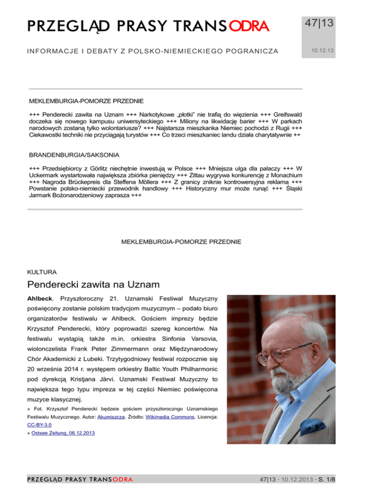 PRZEGL ĄD PRASY TRANS ODRA INFORMACJE I DEBAT Y Z POLSKO-NIEMIECKIEGO POGRANICZA 47|13 10.12.13 MEKLEMBURGIA-POMORZE PRZEDNIE +++ Penderecki zawita na Uznam +++ Narkotykowe „płotki” nie trafią do więzienia +++ Greifswald doczeka się nowego kampusu uniwersyteckiego +++ Miliony na likwidację barier +++ W parkach narodowych zostaną tylko wolontariusze? +++ Najstarsza mieszkanka Niemiec pochodzi z Rugii +++ Ciekawostki techniki nie przyciągają turystów +++ Co trzeci mieszkaniec landu działa charytatywnie ++ BRANDENBURGIA/SAKSONIA +++ Przedsiębiorcy z Görlitz niechętnie inwestują w Polsce +++ Mniejsza ulga dla palaczy +++ W Uckermark wystartowała największa zbiórka pieniędzy +++ Zittau wygrywa konkurencję z Monachium +++ Nagroda Brückepreis dla Steffena Möllera +++ Z granicy zniknie kontrowersyjna reklama +++ Powstanie polsko-niemiecki przewodnik handlowy +++ Historyczny mur może runąć +++ Śląski Jarmark Bożonarodzeniowy zaprasza +++ MEKLEMBURGIA-POMORZE PRZEDNIE KULTURA Penderecki zawita na Uznam Ahlbeck. Przyszłoroczny 21. Uznamski Festiwal Muzyczny poświęcony zostanie polskim tradycjom muzycznym – podało biuro organizatorów festiwalu w Ahlbeck. Gościem imprezy będzie Krzysztof Penderecki, który poprowadzi szereg koncertów. Na festiwalu wystąpią także m.in. orkiestra Sinfonia Varsovia, wiolonczelista Frank Peter Zimmermann oraz Międzynarodowy Chór Akademicki z Lubeki. Trzytygodniowy festiwal rozpocznie się 20 września 2014 r. występem orkiestry Baltic Youth Philharmonic pod dyrekcją Kristjana Järvi. Uznamski Festiwal Muzyczny to największa tego typu impreza w tej części Niemiec poświęcona muzyce klasycznej. » Fot. Krzysztof Penderecki będzeie gościem przyszłoroczngo Uznamskiego Festiwalu Muzycznego. Autor: Akumiszcza. Źródło: Wikimedia Commons. Licencja: CC-BY-3.0 » Ostsee Zeitung, 06.12.2013 PRZ EGL Ą D PRAS Y T RANS ODRA 47|13 · 10.12.2013 · S. 1/8 PRZEGL ĄD PRASY TRANS ODRA INFORMACJE I DEBAT Y Z POLSKO-NIEMIECKIEGO POGRANICZA 47|13 10.12.13 PRZESTĘPCZOŚĆ Narkotykowe „płotki” nie trafią do więzienia Löcknitz. Dwóch szczecinian ujętych wiosną br. w związku z uprawą plantacji konopii na terenie starego garnizonu w Löcknitz nie trafi do więzienia. Sąd w Neubrandenburgu orzekł dla nich kary dwóch lat pozbawienia wolności w zawieszeniu na dwa lata. Obu zatrzymanych uznano jedynie za „płotki”, wykonujące zlecenia narkotykowych bossów. Właścicieli plantacji i zleceniodawców nie udało się zatrzymać. Policja za swoje nieudolne postępowanie znalazła się w ogniu krytyki sądu: „Podczas śledztwa zostało spartaczone niemal wszystko, co tylko można było spartaczyć” – przyznał sędzia Klaus Kabisch. Obrońca Ulrich Knye przyznał zaś, że narkotykowi bossowie pozostają na wolności, ponieważ policja zamiast najpierw obserwować plantację, od razu nasłała na nią specjalny oddział funkcjonariuszy. Jego zdaniem, policjanci nie podjęli też wystarczająco wielu wątków w śledztwie, które się pojawiły. Krajowy Urząd Kryminalny odrzuca te zarzuty i dodaje, że obiekt, w którym uprawiano konopie nie nadaje się do obserwacji. Dlatego, we współpracy z prokuraturą, zdecydowano się na jego przeszukanie. Wartość rynkowa znalezionych w Löcknitz konopii szacowana jest na 2 mln euro. » Nordkurier, 02.12.2013 » Nordkurier, 06.12.2013 EDUKACJA Greifswald doczeka się nowego kampusu uniwersyteckiego Greifswald. 21,5 mln euro – tyle będzie kosztował nowy kampus uniwersytecki w Greifswaldzie. W ubiegłym tygodniu pod jego budowę położono kamień węgielny. Do końca 2016 r. przy ul. Loefflerstraße powstaną budynek wykładowy, biblioteka oraz stołówka. W nowym kampusie będą uczyć się studenci nauk humanistycznych i społecznych. Mimo nowej inwestycji, podczas wmurowania kamienia węgielnego, część studentów protestowała przeciwko ograniczeniu przez rząd krajowy środków na szkolnictwo wyższe. Według rektorów uczelni Meklemburgii-Pomorza Przedniego szkolnictwo wyższe znajduje się na skutek niedofinansowania w katastrofalnym stanie. Cięcia w budżecie nie pozwalają m.in. na obsadzenie wolnych stanowisk profesorskich. » Nordkurier, 02.12.2013 SPOŁECZEŃSTWO Miliony na likwidację barier Meklemburgia-Pomorze Przednie. Starzejące się społeczeństwo i niedostosowane do potrzeb osób starszych mieszkania – tak w wielu miejscowościach wygląda obecnie sytuacja na rynku nieruchomości. Land chce to zmienić i zamierza przeznaczyć w najbliższych latach na likwidację barier architektonicznych ok. 70 mln euro. Część środków będzie pochodziła z funduszy unijnych. Tylko na budowę wind ma zostać przeznaczonych w latach 2014-2015 ponad 10 mln euro. Kolejne 50 mln euro ma zostać przeznaczonych do PRZ EGL Ą D PRAS Y T RANS ODRA 47|13 · 10.12.2013 · S. 2/8 PRZEGL ĄD PRASY TRANS ODRA INFORMACJE I DEBAT Y Z POLSKO-NIEMIECKIEGO POGRANICZA 47|13 10.12.13 2020 r. na poprawę zaplecza socjalnego, m.in. na budowę domów spotkań dla osób starszych. Przedstawiciele właścicieli nieruchomości i spółdzielni mieszkaniowych uważają, że zaproponowana przez land pomoc jest jednak niewystarczająca. Domagają się, by rządowe dopłaty do inwestycji likwidujących bariery obowiązywały przynajmniej do 2021 r. » Nordkurier, 04.12.2013 EKOLOGIA W parkach narodowych zostaną tylko wolontariusze? Meklemburgia-Pomorze wydatków Przednie. przeznaczonych na Drastyczne utrzymanie cięcia parków narodowych mogą doprowadzić do tego, że placówki te nie będą w stanie sprawować swojej funkcji – ostrzegają pracownicy parków oraz rządowa opozycja. Według planów, w najbliższych latach liczba etatów zmniejszona zostanie o połowę: ze 135 do 77. Tymczasem Ministerstwo Ochrony Środowiska, które stoi za zmianami, uważa, że pracowników etatowych można w dużej mierze zastąpić wolontariuszami. To oni mieliby w przyszłości zająć się m.in. op