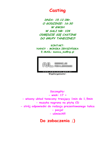 Casting DNIA: 15.12.08r. O GODZINIE: 16:30 W GWSH W SALI NR: 104 ODBĘDZIE SIĘ CASTING DO GRUPY TANECZNEJ! KONTAKT: NANCY - MONIKA ZBYSZYŃSKA E-MAIL: [email protected] Współorganizator: Szczegóły: - wiek: 17 + - własny układ taneczny trwający 1min do 1,5min - muzyka nagrana na płytę CD - strój odpowiedni do rodzaju prezentowanego tańca - pasja! - uśmiech!!! Do zobaczenia ;)