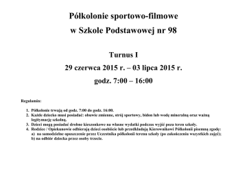 Półkolonie sportowo-filmowe w Szkole Podstawowej nr 98 Turnus I 29 czerwca 2015 r. – 03 lipca 2015 r. godz. 7:00 – 16:00 Regulamin: 1. Półkolonie trwają od godz. 7:00 do godz. 16:00. 2. Każde dziecko musi posiadać: obuwie zmienne, strój sportowy, bidon lub wodę mineralną oraz ważną legitymację szkolną. 3. Dzieci mogą posiadać drobne kieszonkowe na własne wydatki podczas wyjść poza teren szkoły. 4. Rodzice / Opiekunowie odbierają dzieci osobiście lub przedkładają Kierownikowi Półkolonii pisemną zgodę: a) na samodzielne opuszczenie przez Uczestnika półkolonii terenu szkoły (po zakończeniu wszystkich zajęć); b) na odbiór dziecka przez osoby trzecie. Rozkład dnia – PONIEDZIAŁEK, 29 czerwca 2015 r. GRUPA 1 Wych.: mgr Dorota Bącalska GRUPA 2 Wych.: mgr Beata Ragan 7:00 – 7:40 7:40 – 8:00 8:00 – 8:30 Zbiórka dzieci i zabawy zespołowe Drugie śniadanie Tworzymy Kodeks Kolonisty – BHP podczas półkolonii Zbiórka dzieci i zabawy zespołowe Drugie śniadanie Tworzymy Kodeks Kolonisty – BHP podczas półkolonii 8:30 – 9:30 9:30 – 10:45 10:45 – 11:30 11:30 – 13:00 13:00 – 15:00 15:00 – 16:00 Zumba - taniec Poznajmy się – warsztaty integracyjne na placu zabaw Obiad Wyjazd do Humanitarium, ul. Stabłowicka 147 A Warsztaty edukacyjne w Humanitarium – „Szalona piana” Powrót do szkoły Zumba - taniec Poznajmy się – warsztaty integracyjne na placu zabaw Obiad Wyjazd do Humanitarium, ul. Stabłowicka 147 A Warsztaty edukacyjne w Humanitarium – „Szalona piana” Powrót do szkoły GRUPA 3 Wych.: mgr Eryk Malepszak GRUPA 4 Wych.: mgr Magdalena Dziębor Zbiórka dzieci i zabawy zespołowe Drugie śniadanie Tworzymy Kodeks Kolonisty – BHP podczas półkolonii Piłka nożna - trening Poznajmy się – warsztaty integracyjne na placu zabaw Obiad Wyjazd do Humanitarium, ul. Stabłowicka 147 A Warsztaty edukacyjne w Humanitarium – „Szalona piana” Powrót do szkoły Zbiórka dzieci i zabawy zespołowe Drugie śniadanie Tworzymy Kodeks Kolonisty – BHP podczas półkolonii Piłka nożna - trening Poznajmy się – warsztaty integracyjne na placu zabaw Obiad Wyjazd do Humanitarium, ul. Stabłowicka 147 A Warsztaty edukacyjne w Humanitarium – „Szalona piana” Powrót do szkoły 7:00 – 7:40 7:40 – 8:00 8:00 – 8:30 8:30 – 10:00 10:00 – 11:00 11:00 – 11:30 11:30 – 13:00 13:00 – 15:00 15:00 – 16:00 Rozkład dnia – WTOREK, 30 czerwca 2015 r. GRUPA 1 Wych.: mgr Dorota Bącalska GRUPA 2 Wych.: mgr Beata Ragan 7:00 – 7:50 7:50 – 8:10 Zbiórka dzieci i zabawy integracyjne Drugie śniadanie Zbiórka dzieci i zabawy integracyjne Drugie śniadanie 8:10 – 9:00 10:00 – 11:00 11:00 – 13:00 13:00 – 14:00 14:00 – 14:30 14:30 – 14:45 14:45 – 15:45 15:45 – 16:00 Budujemy latawce Wyjazd do kina Nowe Horyzonty Kino Nowe Horyzonty – seans „Pszczółka Maja” Powrót do szkoły Obiad Latawce - zabawy zespołowe na boisku szkolnym Zumba - taniec Zabawy zespołowe Budujemy latawce Wyjazd do kina Nowe Horyzonty Kino Nowe Horyzonty – seans „Pszczółka Maja” Powrót do szkoły Obiad Latawce - zabawy zespołowe na boisku szkolnym Zumba - taniec Zabawy zespołowe GRUPA 3 Wych.: mgr Eryk Malepszak GRUPA 4 Wych.: mgr Magdalena Dziębor Zbiórka dzieci i zabawy integracyjne Drugie śniadanie Budujemy latawce Wyjazd na warsztaty w Hali Stulecia Zbiórka dzieci i zabawy integracyjne Drugie śniadanie Budujemy latawce Warsztaty zdrowego żywienia – sok owocowy. (9:30 - 7:00 – 7:50 7:50 – 8:10 8:10 – 9:30 9:30 – 10:25 10:30) 10:25 – 12:00 12:00 – 12:30 12:30 – 13:30 13:30 – 14:00 14:00 – 14:45 14:45 – 15:45 15:45 – 16:00 Warsztaty w Hali Stulecia – Fotografia 3D Spacer po Pergoli Powrót do szkoły Obiad Latawce - zabawy zespołowe na boisku szkolnym Zumba - taniec Zabawy zespołowe Wyjazd na warsztaty w Hali Stulecia (10:30 – 11:30) Spacer po Pergoli (11:30 -12:05) Warsztaty w Hali Stulecia – Fotografia 3D (12:05 – 13:35) Powrót do szkoły (13:35 -14:20) Obiad (14:20 -14:45) Zumba - taniec Zabawy zespołowe Rozkład dnia – ŚRODA, 01 lipca 2015 r. GRUPA 1 Wych.: mgr Dorota Bącalska GRUPA 2 Wych.: mgr Beata Ragan 7:00 – 8:40 8:40 – 9:00 9:00 – 10:00 10:00 – 11:20 Zbiórka dzieci i zabawy integracyjne Drugie śniadanie Dojazd do Muzeum Miejskiego w rynku Warsztaty w Muzeum Miejskim – Ratusz – Postacie zaklęte w kamiennych pajęczynach Zbiórka dzieci i zabawy integracyjne Drugie śniadanie Dojazd do Muzeum Miejskiego w rynku Warsztaty w Muzeum Miejskim – Ratusz – Postacie zaklęte w kamiennych pajęczynach 11:20 – 12:20 12:20 – 13:00 13:00 – 13:30 13:30 – 14:30 14:30 – 16:00 Dojazd do szkoły Obiad Gry planszowe Zumba - taniec Papieroplastyka – dekoracje papierowe Dojazd do szkoły Obiad Gry planszowe Zumba - taniec Papieroplastyka – dekoracje papierowe GRUPA 3 Wych.: mgr Eryk Malepszak GRUPA 4 Wych.: mgr Magdalena Dziębor Zbiórka dzieci i zabawy integracyjne Drugie śniadanie Wyjazd do kina Nowe Horyzonty Kino Nowe Horyzonty – film pt. „Pszczółka Maja” Powrót do szkoły Obiad Piłka nożna - trening Papieroplastyka – dekoracje papierowe Zbiórka dzieci i zabawy integracyjne Drugie śniadanie Wyjazd do kina Nowe Horyzonty Kino Nowe Horyzonty – film pt. „Pszczółka Maja” Powrót do szkoły Obiad Piłka nożna - trening Papieroplastyka – dekoracje papierowe 7:00 – 8:40 8:40 – 9:00 9:00 – 10:00 10:00 – 12:00 12:00 – 13:00 13:00 – 13:30 13:30 – 14:30 14:30 – 16:00 Rozkład dnia – CZWARTEK, 02 lipca 2015 r. 7:00 – 8:00 8:00 – 9:00 9:00 – 10:30 10:30 – 11:30 11:30 – 14:40 14:40 – 15:30 15:30 – 16:00 7:00 – 8:00 8:00 – 9:00 9:00 – 10:30 10:30 – 11:30 11:30 – 14:40 14:40 – 15:30 15:30 – 16:00 GRUPA 1 Wych.: mgr Dorota Bącalska GRUPA 2 Wych.: mgr Beata Ragan Zbiórka dzieci i drugie śniadanie Dojazd do Kina Nowe Horyzonty Kino Nowe Horyzonty – film pt. „Tajemniczy świat Arrie