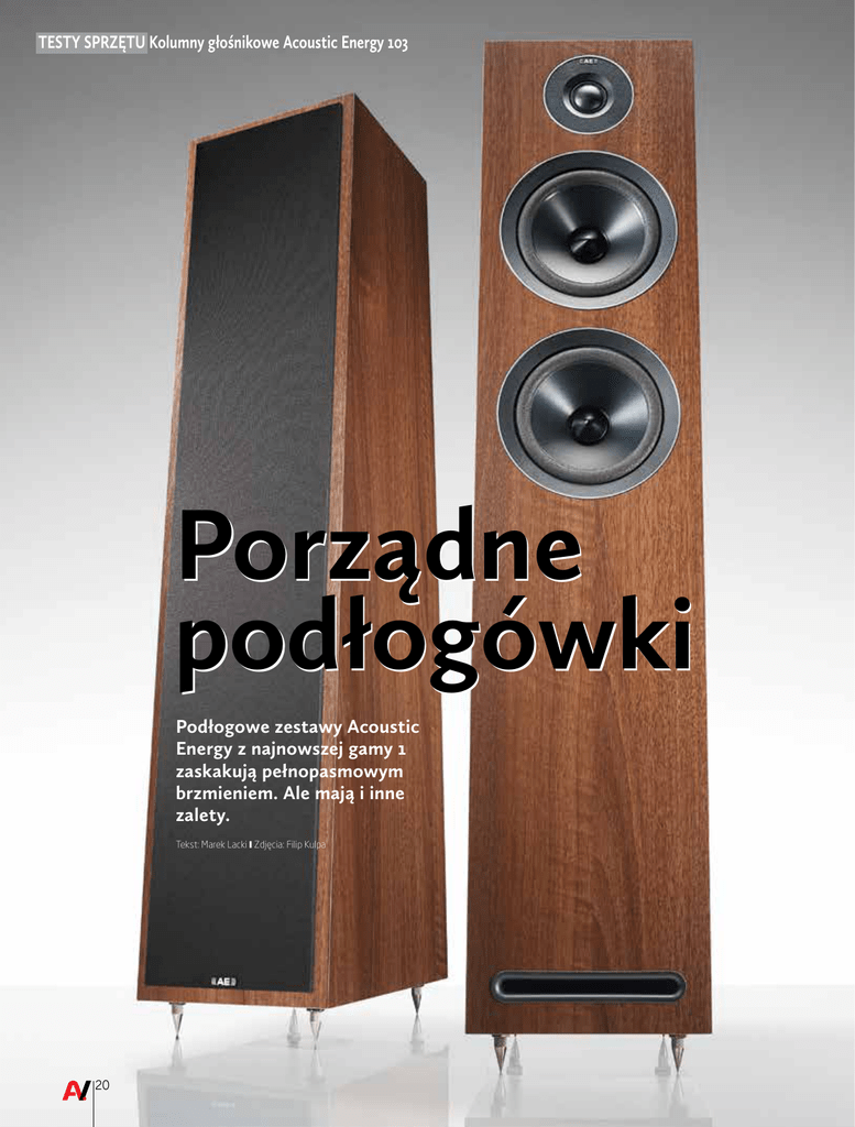 TESTY SPRZĘTU Kolumny głośnikowe Acoustic Energy 103 Porządne podłogówki Podłogowe zestawy Acoustic Energy z najnowszej gamy 1 zaskakują pełnopasmowym brzmieniem. Ale mają i inne zalety. Tekst: Marek Lacki ❙ Zdjęcia: Filip Kulpa 20 M iesiąc temu mieliśmy nie tyle okazję, co prawdziwą przyjemność recenzować nieduże monitory Acoustic Energy 301, przynależące do stosunkowo nowej serii 3 (zadebiutowała rok temu). Okazały się one na tyle udaną konstrukcją, że rozbudziły naszą ciekawość co do jeszcze nowszej, a zarazem tańszej, serii 1. Tym razem sięgnęliśmy jednak po model podłogowy. Zestawy 103 nie są o wiele droższe od „301-ek” (800 zł), a będąc jednak konstrukcją wolnostojącą, nie wymagają podstawek. Powstaje pytanie: czy to przypadkiem nie jest korzystniejszy zakup? BUDOWA „103-ki” są małymi podłogówkami o dwuipółdrożnej konstrukcji, które wyróżnia jedna cecha – niespotykana w innych kolumnach z tego przedziału cenowego – pochylona przednia ścianka. Zabieg ten ma dwojaki cel: akustyczny (wyrównanie czasowe przetworników, potencjalna redukcja rezonansów obudowy) i – nie dajmy się oszukać – także estetyczny. Dzięki temu, jak również dzięki okleinie o wysokiej jakości (winylowej, ale ładnie symulującej naturalne drewno), a także ogólnie ładnej estetyce wykonania, AE 103 po prostu cieszą oko, wyglądając dużo lepiej niż zdecydowana większość kolumn za około 3000 zł. Co więcej, wykonana z płyt MDF obudowa ma całkiem skomplikowaną konstrukcję. Komorę dla górnego woofera, którą dzieli on z tweeterem, uzyskano poprzez przepierzenie w 1/4 wysokości obudowy. Jednocześnie jest to element wzmacniający. Prócz niego zastosowano jeszcze pierścień, który poziomo, po obwodzie, spina wszystkie ścianki. Nie bez znaczenia dla sztywności jest też szczelinowy tunel BR, wentylujący dolną komorę basową od przodu, gdyż także i on stanowi integralną część obudowy. Zaskakujące jest to, że nie poprzestano na wzmocnieniach poziomych i przez całą wysokość obudowy poprowadzono wzmocnienie, które spina ścianki boczne, górną i dolną, przebijając po drodze przepierzenie. W dodatku obudowa nie jest prostopadłościenna, lecz – jak wspomnieliśmy – przednia ścianka jest pochylona. Doprawdy zadano sobie sporo trudu, by stworzyć solidną bazę dla głośników, co warto docenić, zważywszy na niewysoką cenę kolumn. Warto jeszcze dodać, że przednia ścianka nie zawiera elementów mocujących maskownice, gdyż zastosowano magnesy, a głośniki mają całkowicie zasłonięte wkręty. Mała szerokość obudów (185 mm) wymusiła zastosowanie niewielkich głośników nisko-średniotonowych – w tym przypadku o średnicy 140 mm. Membrany są aluminiowe, anodowane na czarno. W ich centralnej części doklejono sztywne nakładki przeciwpyłowe. Kosze wykonano z blachy, ale magnesy ferrytowe nie zostały pozbawione wentylacji z tyłu (brakuje jej niemal we wszystkich tańszych głośnikach), co korzystnie wpływa na odporność głośników na powstawanie kompresji termicznej. Wysokie tony odtwarza jednocalowa kopułka tekstylna o dość typowej konstrukcji. Zwrotnicę umieszczono na tylnej ściance. Zawiera ona zaledwie jeden rezystor – i jest to opornik metalizowany. Poza nim znajduje się tu jeszcze 9 kondensatorów polipropylenowych, 4 cewki rdzeniowe i 1 powietrzna. „103-ki” budowały scenę dźwiękową i w jaki sposób były tworzone znajdujące się na niej instrumenty, wokale. Wraz ze spójnym charakterem barw w poszczególnych zakresach pasma, generowało to płynną, naturalnie plastyczną całość, a równocześnie precyzja lokalizacji, jak i kontury źródeł dźwięków były zupełnie wyraźne. Sposób budowania głębi był prawidłowy, czyli zgodny z tym, do czego przyzwyczaiły mnie kolumny referencyjne. Nie było więc ani spłaszczania, ani przesuwania całości do przodu bądź do tyłu względem słuchacza. Aby wrażenia były jeszcze lepsze, czyli można było silniej odczuwać obecność muzyków OCENA BRZMIENIE Serie 1 i 3 łączy wiele podobieństw konstrukcyjnych, a skoro model 301 okazał się tak udany, to naturalne jest oczekiwanie dobrej jakości brzmienia z o 40% droższych podłogówek. Różnica w cenie wynika oczywiście z powiększonych gabarytów i bardziej złożonej obudowy oraz dodania jednego głośnika. Również zwrotnica jest droższa. Audiofilska reguła podpowiada, że „103-ki” będą zapewne mniej „szlachetne” od „301-ek”, oferując z pewnością więcej basu i lepszą dynamikę. Czy tak jest w istocie? W bezpośrednim porównaniu, biorąc pod uwagę jakość barwy dźwięku, rozdzielczość wysokich tonów, ogólną płynność i muzykalność, czy w końcu nawet dynamikę, szczególnie w skali mikro, Acoustic Energy 103 ustępują 301. Nie znaczy to jednak, że relacja jakości do ceny jest mniej atrakcyjna. „103-ka” ma bowiem to coś, czego brakuje „301-ce” – niski bas. Jak na wciąż niewielkie kolumny, bas jest zaskakująco pełnopasmowy, bez trudu schodzący do ok. 40 Hz, czego o „301-kach” powiedzieć, niestety, się nie da. Dużą zaletą basu podłogówek AE, prócz jego dobrej szybkości, równomierności i dynamiki oraz dobrego rozciągnięcia, jest czystość wynikająca choćby z braku szumu turbulencyjnego z portu BR. Po raz kolejny dobrze się sprawdza w tej roli port szczelinowy. Kolumny mają bardzo przyzwoitą równowagę brzmienia. Podłogówki są trochę jaśniejsze w górze pasma od monitorów. Ponieważ jednak „301-ki” są lekko stonowane w tym zakresie, można przyjąć, że to, co prezentują „103-ki”, jest bliższe neutralności. Mimo że „103-ki” nie mogą się pochwalić taką spójnością brzmienia jak „301-ki”, to nadal jest to cecha, która zalicza się do bardzo istotnych zalet tych pierwszych. Projektanci AE wykonują kawał dobrej roboty. Podobał mi się 