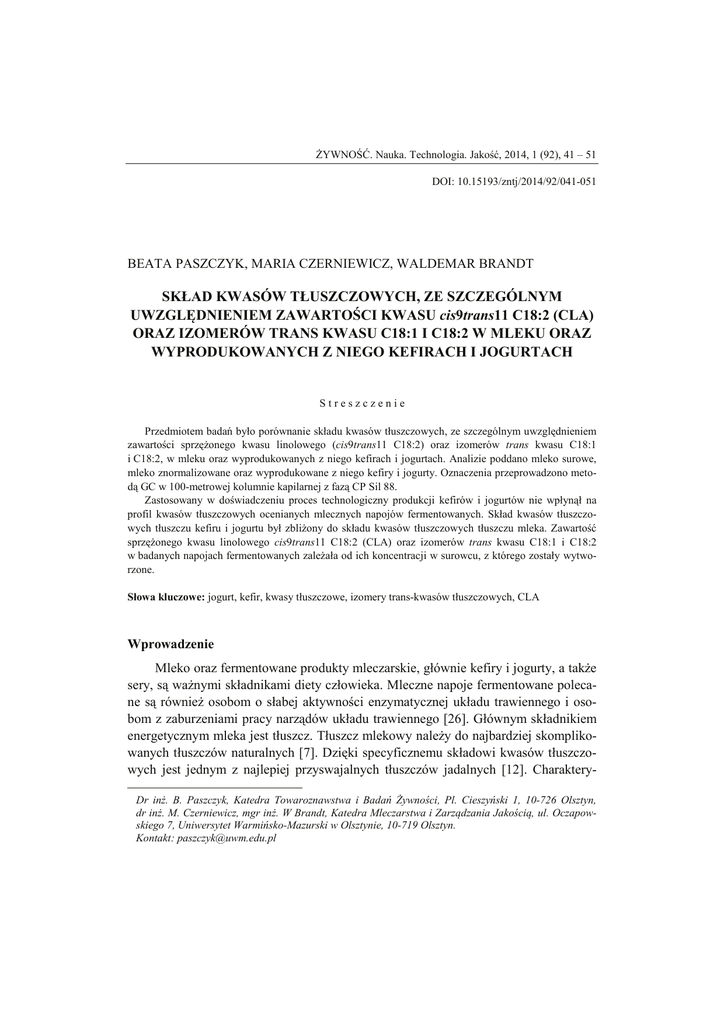ŻYWNOŚĆ. Nauka. Technologia. Jakość, 2014, 1 (92), 41 – 51 DOI: 10.15193/zntj/2014/92/041-051 BEATA PASZCZYK, MARIA CZERNIEWICZ, WALDEMAR BRANDT SKŁAD KWASÓW TŁUSZCZOWYCH, ZE SZCZEGÓLNYM UWZGLĘDNIENIEM ZAWARTOŚCI KWASU cis9trans11 C18:2 (CLA) ORAZ IZOMERÓW TRANS KWASU C18:1 I C18:2 W MLEKU ORAZ WYPRODUKOWANYCH Z NIEGO KEFIRACH I JOGURTACH Streszczenie Przedmiotem badań było porównanie składu kwasów tłuszczowych, ze szczególnym uwzględnieniem zawartości sprzężonego kwasu linolowego (cis9trans11 C18:2) oraz izomerów trans kwasu C18:1 i C18:2, w mleku oraz wyprodukowanych z niego kefirach i jogurtach. Analizie poddano mleko surowe, mleko znormalizowane oraz wyprodukowane z niego kefiry i jogurty. Oznaczenia przeprowadzono metodą GC w 100-metrowej kolumnie kapilarnej z fazą CP Sil 88. Zastosowany w doświadczeniu proces technologiczny produkcji kefirów i jogurtów nie wpłynął na profil kwasów tłuszczowych ocenianych mlecznych napojów fermentowanych. Skład kwasów tłuszczowych tłuszczu kefiru i jogurtu był zbliżony do składu kwasów tłuszczowych tłuszczu mleka. Zawartość sprzężonego kwasu linolowego cis9trans11 C18:2 (CLA) oraz izomerów trans kwasu C18:1 i C18:2 w badanych napojach fermentowanych zależała od ich koncentracji w surowcu, z którego zostały wytworzone. Słowa kluczowe: jogurt, kefir, kwasy tłuszczowe, izomery trans-kwasów tłuszczowych, CLA Wprowadzenie Mleko oraz fermentowane produkty mleczarskie, głównie kefiry i jogurty, a także sery, są ważnymi składnikami diety człowieka. Mleczne napoje fermentowane polecane są również osobom o słabej aktywności enzymatycznej układu trawiennego i osobom z zaburzeniami pracy narządów układu trawiennego [26]. Głównym składnikiem energetycznym mleka jest tłuszcz. Tłuszcz mlekowy należy do najbardziej skomplikowanych tłuszczów naturalnych [7]. Dzięki specyficznemu składowi kwasów tłuszczowych jest jednym z najlepiej przyswajalnych tłuszczów jadalnych [12]. CharakteryDr inż. B. Paszczyk, Katedra Towaroznawstwa i Badań Żywności, Pl. Cieszyński 1, 10-726 Olsztyn, dr inż. M. Czerniewicz, mgr inż. W Brandt, Katedra Mleczarstwa i Zarządzania Jakością, ul. Oczapowskiego 7, Uniwersytet Warmińsko-Mazurski w Olsztynie, 10-719 Olsztyn. Kontakt: [email protected] 42 Beata Paszczyk, Maria Czerniewicz, Waldemar Brandt styczną cechą tłuszczu mlekowego jest bardzo duże zróżnicowanie składu kwasów tłuszczowych oraz wysoka zawartość krótkołańcuchowych kwasów tłuszczowych. Tłuszcz mlekowy jest bogaty w kwasy nasycone. W skład nienasyconych kwasów tłuszczowych tłuszczu mlekowego wchodzą kwasy monoenowe i polienowe, które występują głównie w formie cis. W mniejszych ilościach spotykane są formy trans tych kwasów. W składzie kwasów tłuszczowych tłuszczu mlekowego występują kwasy, którym przypisuje się działanie biologicznie korzystne dla zdrowia człowieka, m.in. kwas masłowy, który charakteryzuje się właściwościami przeciwnowotworowymi, kwas oleinowy wykazujący właściwości przeciwmiażdżycowe, kwas wakcenowy (trans11 C18:1) o właściwościach przeciwnowotworowych i przeciwmiażdżycowych czy kwas linolowy ze sprzężonym układem podwójnych wiązań (CLA) o wielokierunkowym działaniu prozdrowotnym [3, 22, 23, 26]. W grupie sprzężnych dienów tłuszczu mlekowego najbardziej aktywny biologicznie i dominujący jest kwas cis9trans11 C18:2 – stanowi on od 83 do 93 % wszystkich izomerów CLA [2, 9, 13]. Przypisuje mu się m.in. właściwości przeciwutleniające, antykancerogenne, antyaterogenne i antymutagenne [17, 18, 19, 20, 22]. Ilościowy skład kwasów tłuszczowych tłuszczu mlekowego ulega zmianom pod wpływem różnych czynników, do których należą m.in. sposób żywienia zwierząt, rasa krów i cechy osobnicze, okres laktacji, warunki klimatyczne chowu, stan zdrowia i wiek bydła. Z wymienionych czynników najistotniejszy wpływ wywiera sposób żywienia. W sezonie żywienia krów paszą zieloną tłuszcz mlekowy zawiera znacznie więcej kwasów z grupy C18, w tym głównie kwasu C18:1 oraz znacznie mniej kwasu palmitynowego (C16:0) i mirystynowego (C14:0) niż w sezonie żywienia oborowego [8, 27]. Według Żegarskiej i wsp. [30] sumaryczna zawartość izomerów trans kwasu C18:1 w mleku pochodzącym z sezonu letniego kształtowała się w przedziale od 3,57 do 5,37 % w ogólnym składzie kwasów tłuszczowych, w mleku pozyskiwanym zimą w przedziale od 1,26 do 1,84 %. Udział kwasu cis9trans11 C18:2 (CLA) w tłuszczu mlekowym z okresu letniego kształtował się na poziomie od 1,06 do 1,76 %, przy średniej 1,40 % ogólnego składu kwasów tłuszczowych, a w tłuszczu mlekowym z okresu zimowego od 0,29 do 0,61 % (średnia 0,40 %). Mleko i jego przetwory są bogatym źródłem kwasu cis9trans11 C18:2 w diecie człowieka. Na poziom CLA w produktach mleczarskich, tj. serach czy napojach fermentowanych, poza dietą zwierzęcia, a więc koncentracją CLA w surowcu, mogą wpływać także warunki panujące podczas prowadzenia procesów technologicznych oraz aktywność dodawanych kultur bakterii fermentacji mlekowej [1, 4, 10, 11, 14, 15, 24, 25]. Celem pracy było porównanie składu kwasów tłuszczowych, ze szczególnym uwzględnieniem zawartości sprzężonego kwasu linolowego (cis9trans11 C18:2) oraz SKŁAD KWASÓW TŁUSZCZOWYCH, ZE SZCZEGÓLNYM UWZGLĘDNIENIEM ZAWARTOŚCI KWASU… 43 izomerów trans kwasu C18:1 i C18:2 w mleku oraz wyprodukowanych z niego kefirach i jogurtach. Materiał i metody badań Materiał doświadczalny stanowiło surowe mleko zbiorcze, znormalizowane mleko spasteryzowane, przygotowane do produkcji napojów fermentowanych oraz produkty finalne – kefir i jogurt. Napoje fermentowane zostały wyprodukowane w skali półtechnicznej w Centrum Edukacyjno-Badawczym Wydziału Nauki o Żywności Uniwersytetu Warmińsko-Mazurskiego w Olsztynie. Surowcem do ich produkcji było mleko zbiorcze, 