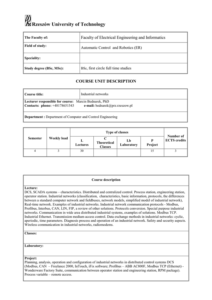 Rzeszów University of Technology Faculty of Electrical Engineering and Informatics The Faculty of: Field of study: Automatic Control and Robotics (ER) Speciality: Study degree (BSc, MSc): BSc, first circle full time studies COURSE UNIT DESCRIPTION Industrial networks Course title: Lecturer responsible for course: Marcin Bednarek, PhD Contacts: phone: +48178651543 e-mail: [email protected] Department : Department of Computer and Control Engineering Type of classes Semester Weekly load 4 3 L Lectures C Theoretical Classes Lb Laboratory 30 P Project 15 Number of ECTS credits 3 Course description Lecture: DCS, SCADA systems – characteristics. Distributed and centralized control. Process station, engineering station, operator station. Industrial networks (classification, characteristics, basic information, protocols, the differences between a standard computer network and fieldbuses, network models, simplified model of industrial network), Real-time network. Examples of industrial networks. Industrial network communication protocols - Modbus, Profibus, Interbus, CAN, LIN, FIP, a review of other solutions. Protocols conversion. Special purpose industrial networks. Communication in wide area distributed industrial systems, examples of solutions. Modbus TCP. Industrial Ethernet. Transmission medium access control. Data exchange methods in industrial networks: cyclic, aperiodic, time parameters. Diagnosis process and operation of an industrial network. Safety and security aspects. Wireless communication in industrial networks, radiomodems. Classes: Laboratory: Project: Planning, analysis, operation and configuration of industrial networks in distributed control systems DCS (Modbus, CAN – Freelance 2000, InTouch, iFix software; Profibus – ABB AC800F, Modbus TCP (Ethernet) Wonderware Factory Suite, communication between operator station and engineering station, RPM package). Process variable – remote access. Objectives of the course Knowledge about: industrial computer networks (planning and configuration of industrial networks), industrial network structure and functioning in the DCS. Examination method Lecture: written test, oral discussion Projects: written solution of design problems, oral discussion. Bibliography 1. Sacha K.: Sieci miejscowe Profibus. MIKOM, Warszawa 1998 2. Kwiecień A.: Analiza przepływu informacji w komputerowych sieciach przemysłowych, Studia Informatica, Politechnika Śląska, Gliwice 2002 3. Modicon Modbus Protocol Reference Guide PI–MBUS–300 Rev. J. MODICON, Inc., Industrial Automation Systems, North Andover, Massachusetts, June 1996 4. Modbus Application Protocol Specification V1.1a, Modbus-IDA June 4, 2004 5. Object Messaging Specification for the MODBUS/TCP Protocol Version 1.1. Modbus-IDA, November 8, 2004 6. Solnik W. ; Zajda Z.: Profibus. Technologie i aplikacje. Opis systemu. Profibus PNO, Oficyna Wydawnicza Politechniki Wrocławskiej, Wrocław 2005 7. Komputerowe sieci przemysłowe Profibus DP i MPI 8. Bednarek M.: Wizualizacja procesów. Laboratorium, Oficyna Wydawnicza Politechniki Rzeszowskiej, Rzeszów 2004 9. Bender K.: Profibus. The Fieldbus for Industrial Automation, Prentice Hall International 1993 10. Trybus L.: Regulatory wielofunkcyjne, Wydawnictwo Naukowo-Techniczne, Warszawa 1992 11. Sacha K.: Systemy czasu rzeczywistego. Oficyna Wydawnicza Politechniki Warszawskiej, Warszawa 1999 12. Legierski T. i inni: Programowanie sterowników PLC, Wydawnictwo Pracowni Komputerowej Jacka Sklamierskiego, Gliwice 1998 13. Kasprzyk J. Programowanie sterowników przemysłowych, Wydawnictwo Naukowo-Techniczne, Warszawa 2006 14. Walkowiak K.: AIgorytmy wyznaczania przepływów typu unicast i anycast w przeŜywalnych sieciach zorientowanych połączeniowo, Oficyna Wydawnicza Politechniki Wrocławskiej, Wrocław 2007 Lecturer signature Head of Department signature Dean signature