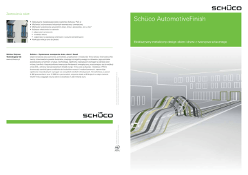 Zestawienie zalet: Schüco AutomotiveFinish • Ekskluzywne metalizowane kolory systemów Schüco z PVC-U • Możliwość zróżnicowania kolorystyki wewnętrznej i zewnętrznej • Możliwość wykończenia powierzchni okien, drzwi i akcesoriów „ton w ton“ • Najlepsze właściwości w zakresie: • odporności na ścieranie • trwałości koloru • odporności na substancje chemiczne i warunki atmosferyczne • Atrakcyjna relacja ceny do jakości Znak „Schüco” jest chronionym znakiem towarowym na terenie Niemiec oraz na innych rynkach międzynarodowych. Dalsze informacje na zapytanie Schüco – Systemowe rozwiązania okien, drzwi i fasad Dzięki światowej sieci partnerów, architektów, projektantów i inwestorów firma Schüco International KG tworzy zrównoważone powłoki budynków, skupiając szczególną uwagę na człowieku i jego potrzebie pozostawania w harmonii z naturą i technologią. Spełnieniu najwyższych wymagań w zakresie wzornictwa, komfortu i bezpieczeństwa towarzyszy efektywność energetyczna, przyczyniająca się do redukcji emisji CO2 i ochrony konwencjonalnych źródeł energii. Firma oraz jej dywizje - metalowa i PVC-U dostarczają szerokiej gamy produktów do budynków nowych i modernizowanych, zapewniając spełnienie indywidualnych wymagań we wszystkich strefach klimatycznych. Firma Schüco, z ponad 4 800 pracownikami oraz 12 000 firm partnerskich, aktywnie działa w 80 krajach na całym świecie. W 2014 roku osiągnęła roczny obrót w wysokości 1,425 miliarda euro. P 3758/02.16/Printed in Germany. Zachowujemy prawo do zmian treści i ilustracji. Schüco Polymer Technologies KG www.schueco.pl Ekskluzywny metaliczny design okien i drzwi z tworzywa sztucznego 2 Schüco AutomotiveFinish AutomotiveFinish Niezwykłe możliwości kreacji dzięki ekskluzywnym metalizowanym kolorom Schüco AutomotiveFinish to idealne połączenie nowych możliwości wyrazu z atrakcyjną ceną. Możliwość realizacji kreatywnych projektów zarówno na zewnątrz, jak i wewnątrz budynków dzięki wykończeniu powierzchni w technologii Schüco AutomotiveFinish. Całkowicie nowa metoda nanoszenia powłok barwnych na profile z tworzywa sztucznego jest efektem trzech lat badań w ramach współpracy Schüco z wiodącym producentem lakierów samochodowych. Efektem tych prac są niezwykłe metaliczne kolory i przyjazny dla środowiska, chroniący zasoby naturalne proces produkcji, objęty patronatem Niemieckiej Fundacji Federalnej do spraw Środowiska (DBU). Efekt “metallic” na profilach z PVC-U – połączenie wyjątkowo ciekawej powierzchni z zaletami obróbki tworzywa sztucznego. Schüco AutomotiveFinish otwiera nowe, niezwykłe możliwości projektowania obiektów – zarówno wewnątrz, jak i na zewnątrz. Wysokiej jakości powłoka charakteryzuje się wyjątkową trwałością kolorów oraz odpornością na wpływ czynników atmosferycznych spełniającą wysokie wymagania techniczne. Cecha szczególna: okna, drzwi i akcesoria można również powlekać metodą “ton w ton”. Asortyment obejmuje 9 kolorów do zastosowań zewnętrznych i wewnętrznych o różnym stopniu połysku i różnej teksturze. Ponadto w kolekcji Innendesign-Collection oferowane są 2 kolory opracowane specjalnie z myślą o zastosowaniu we wnętrzach. Schüco 3 Paleta kolorów do zastosowań zewnętrznych i wewnętrznych SAF-DB 703 matowy SAF-RAL 9007* SAF-RAL 9006* SAF-RAL 140-M* SAF-RAL 630-M* SAF-RAL 750-M* White Line SAF-RAL 450-M* SAF-RAL 350-M* Cream Line Copper Effect Innendesign-Collection Ze względów technicznych przedstawione na wydrukach kolory mogą odbiegać od ich rzeczywistego wyglądu. *półpołysk