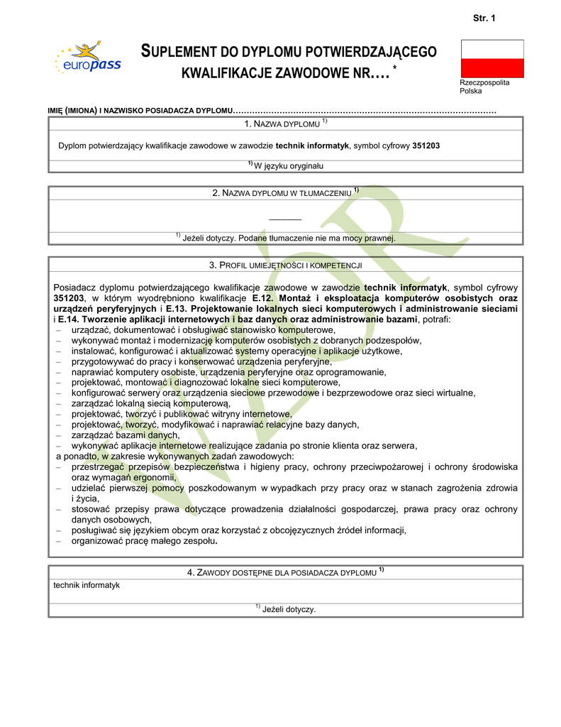 Str. 1 SUPLEMENT DO DYPLOMU POTWIERDZAJĄCEGO KWALIFIKACJE ZAWODOWE NR…. * Rzeczpospolita Polska IMIĘ (IMIONA) I NAZWISKO POSIADACZA DYPLOMU…………………………………………………………………………………… 1. NAZWA DYPLOMU 1) Dyplom potwierdzający kwalifikacje zawodowe w zawodzie technik informatyk, symbol cyfrowy 351203 1) W języku oryginału 2. NAZWA DYPLOMU W TŁUMACZENIU 1) _______ 1) Jeżeli dotyczy. Podane tłumaczenie nie ma mocy prawnej. 3. PROFIL UMIEJĘTNOŚCI I KOMPETENCJI Posiadacz dyplomu potwierdzającego kwalifikacje zawodowe w zawodzie technik informatyk, symbol cyfrowy 351203, w którym wyodrębniono kwalifikacje E.12. Montaż i eksploatacja komputerów osobistych oraz urządzeń peryferyjnych i E.13. Projektowanie lokalnych sieci komputerowych i administrowanie sieciami i E.14. Tworzenie aplikacji internetowych i baz danych oraz administrowanie bazami, potrafi: – urządzać, dokumentować i obsługiwać stanowisko komputerowe, – wykonywać montaż i modernizację komputerów osobistych z dobranych podzespołów, – instalować, konfigurować i aktualizować systemy operacyjne i aplikacje użytkowe, – przygotowywać do pracy i konserwować urządzenia peryferyjne, – naprawiać komputery osobiste, urządzenia peryferyjne oraz oprogramowanie, – projektować, montować i diagnozować lokalne sieci komputerowe, – konfigurować serwery oraz urządzenia sieciowe przewodowe i bezprzewodowe oraz sieci wirtualne, – zarządzać lokalną siecią komputerową, – projektować, tworzyć i publikować witryny internetowe, – projektować, tworzyć, modyfikować i naprawiać relacyjne bazy danych, – zarządzać bazami danych, – wykonywać aplikacje internetowe realizujące zadania po stronie klienta oraz serwera, a ponadto, w zakresie wykonywanych zadań zawodowych: – przestrzegać przepisów bezpieczeństwa i higieny pracy, ochrony przeciwpożarowej i ochrony środowiska oraz wymagań ergonomii, – udzielać pierwszej pomocy poszkodowanym w wypadkach przy pracy oraz w stanach zagrożenia zdrowia i życia, – stosować przepisy prawa dotyczące prowadzenia działalności gospodarczej, prawa pracy oraz ochrony danych osobowych, – posługiwać się językiem obcym oraz korzystać z obcojęzycznych źródeł informacji, – organizować pracę małego zespołu. 4. ZAWODY DOSTĘPNE DLA POSIADACZA DYPLOMU technik informatyk 1) Jeżeli dotyczy. 1) Str. 2 5.PODSTAWA WYDANIA DYPLOMU Nazwa podmiotu wydającego dyplom Okręgowa Komisja Egzaminacyjna w …………………………. Nazwa władz sprawujących nadzór nad podmiotem wydającym dyplom Minister Edukacji Narodowej Poziom wykształcenia (krajowy lub międzynarodowy) ISCED 4 Warunki zdania egzaminu potwierdzającego kwalifikacje w zawodzie Egzamin przeprowadzany jest z każdej kwalifikacji wyodrębnionej w zawodzie. Warunkiem zdania egzaminu zawodowego, złożonego z dwóch części, jest uzyskanie: 1) z części pisemnej - co najmniej 50% punktów możliwych do uzyskania, 2) z części praktycznej - co najmniej 75% punktów możliwych do uzyskania. Dostęp do następnego poziomu kształcenia Jeżeli posiadacz dyplomu uzyskał świadectwo dojrzałości, może kontynuować kształcenie w szkole wyższej. Umowy międzynarodowe _______ Podstawa prawna wydania dyplomu stosowne rozporządzenie 6. OFICJALNIE UZNANE SPOSOBY UZYSKANIA DYPLOMU Posiadacz dyplomu uzyskał wykształcenie średnie oraz zdał egzaminy potwierdzające kwalifikacje E.12. Montaż i eksploatacja komputerów osobistych oraz urządzeń peryferyjnych i E.13. Projektowanie lokalnych sieci komputerowych i administrowanie sieciami i E.14. Tworzenie aplikacji internetowych i baz danych oraz administrowanie bazami w zawodzie technik informatyk. Kwalifikacje wyodrębnione w tym zawodzie są możliwe do uzyskania w ramach poniższych sposobów nabywania kwalifikacji: Możliwe sposoby nabywania kwalifikacji w zawodzie technik informatyk Udział kształcenia teoretycznego/praktycznego (%) Kształcenie w szkole (4-letnie technikum lub 2-letnia szkoła policealna) Kształcenie ustawiczne w formach pozaszkolnych (minimalna liczba godzin kształcenia określona w podstawie programowej kształcenia w zawodach) Potwierdzanie kwalifikacji w trybie egzaminów eksternistycznych dla osób, które ukończyły gimnazjum albo 8-letnią szkołę podstawową oraz: a) co najmniej 2 lata kształciły się w zawodzie lub b) co najmniej 2 lata pracowały w zawodzie 50/50 50/50 50/50 0/100 Informacje dodatkowe: Okręgowa Komisja Egzaminacyjna w ………………………, e-mail: Więcej informacji (w tym opis krajowego systemu kwalifikacji) można znaleźć w Internecie pod adresem: www.men.gov.pl, www.koweziu.edu.pl Krajowy punkt informacyjny: www.europass.org.pl *Nota objaśniająca Niniejszy dokument ma na celu dostarczenie dodatkowych informacji na temat dyplomu potwierdzającego kwalifikacje zawodowe i sam w sobie nie ma mocy prawnej. Podstawą opisu są następujące teksty: Rezolucja Rady nr 93/C 49/01 z dnia 3 grudnia 1992 r. dotycząca przejrzystości kwalifikacji, Rezolucja Rady nr 96/C 224/04 z dnia 15 lipca 1996 r. dotycząca przejrzystości dyplomów szkolenia zawodowego, Zalecenie Parlamentu Europejskiego oraz Rady nr 2001/613/EC z dnia 10 lipca 2001 r. w sprawie mobilności w ramach Wspólnoty studentów, osób przechodzących szkolenia, wolontariuszy, nauczycieli i instruktorów. Więcej informacji można uzyskać pod adresem: http://europass.cedefop.eu.int © European Communities 2002
