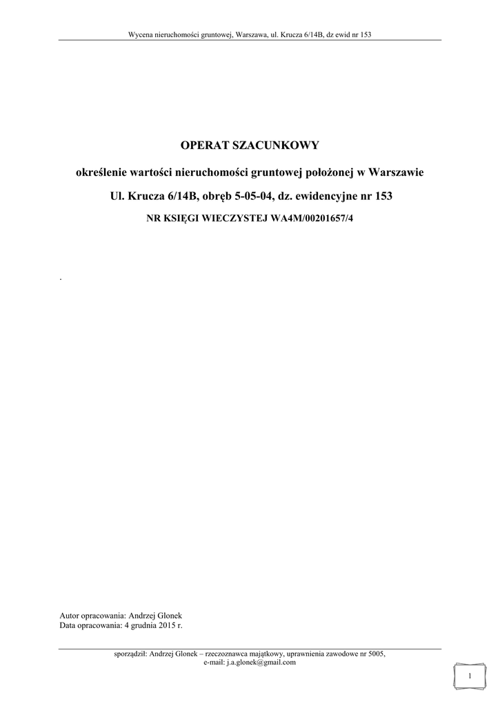 Wycena nieruchomości gruntowej, Warszawa, ul. Krucza 6/14B, dz ewid nr 153 OPERAT SZACUNKOWY określenie wartości nieruchomości gruntowej położonej w Warszawie Ul. Krucza 6/14B, obręb 5-05-04, dz. ewidencyjne nr 153 NR KSIĘGI WIECZYSTEJ WA4M/00201657/4 . Autor opracowania: Andrzej Glonek Data opracowania: 4 grudnia 2015 r. sporządził: Andrzej Glonek – rzeczoznawca majątkowy, uprawnienia zawodowe nr 5005, e-mail: [email protected] 1 Wycena nieruchomości gruntowej, Warszawa, ul. Krucza 6/14B, dz ewid nr 153 WYCIĄG Z OPERATU SZACUNKOWEGO Opis nieruchomości Cel wyceny Metoda wyceny Właściciel praw do nieruchomości Adres: Ul. Krucza 6/14B Dzielnica: Śródmieście Działki: nr 153 Obręb: 5-05-04 Powierzchnia nieruchomości: 372 m2 Kw: WA4M/00201657/4 Określenie wartości prawa własności gruntu oddanego w użytkowanie wieczyste w celu aktualizacji opłaty z tytułu użytkowania wieczystego Podejście porównawcze, metoda porównywania parami Właściciel: Miasto Stołeczne Warszawa Użytkownik wieczysty: Osoba prawna Wartość rynkowa prawa własności nieruchomości gruntowej 2 022 404 zł Słownie Dwa miliony dwadzieścia dwa tysiące czterysta cztery złote Wartość rynkowa 1 m2 prawa własności 5 436,57 zł Daty istotne dla operatu Autor operatu szacunkowego Data sporządzenia wyceny: 4 grudnia 2015 r. Data, na którą określono wartość przedmiotu wyceny: 1 grudnia 2015 r. Data, na którą określono i uwzględniono w wycenie stan przedmiotu wyceny: 1 grudnia 2015 r. Data oględzin: 1 grudnia 2015 r. Andrzej Glonek Uprawnienia nr 5005 Pieczęć i podpis rzeczoznawcy majątkowego sporządził: Andrzej Glonek – rzeczoznawca majątkowy, uprawnienia zawodowe nr 5005, e-mail: [email protected] 2 Wycena nieruchomości gruntowej, Warszawa, ul. Krucza 6/14B, dz ewid nr 153 SPIS TREŚCI 1. PRZEDMIOT I ZAKRES WYCENY .................................................................................................................................................. 4 1.1. 1.2. PRZEDMIOT I ZAKRES WYCENY ................................................................................................................................................ 4 ZAKRES WYCENY .................................................................................................................................................................... 4 2. CEL WYCENY ................................................................................................................................................................................... 4 3. PODSTAWY OPRACOWANIA OPERATU SZACUNKOWEGO ................................................................................................... 4 3.1. 3.2. 3.3. 3.4. PODSTAWA FORMALNA WYCENY ............................................................................................................................................. 4 PODSTAWY PRAWNE WYCENY ................................................................................................................................................. 4 PODSTAWY METODOLOGICZNE................................................................................................................................................ 4 ŹRÓDŁA DANYCH MERYTORYCZNYCH ..................................................................................................................................... 5 4. DATY ISTOTNE DLA OPERATU SZACUNKOWEGO .................................................................................................................. 5 5. OPIS I OKREŚLENIE STANU NIERUCHOMOŚCI ......................................................................................................................... 5 5.1. 5.2. 5.3. 5.4. STAN PRAWNY ........................................................................................................................................................................ 5 STAN TECHNICZNO-UŻYTKOWY .............................................................................................................................................. 6 STAN OTOCZENIA.................................................................................................................................................................... 7 OTOCZENIE SZCZEGÓŁOWE ..................................................................................................................................................... 8 6. PRZEZNACZENIE NIERUCHOMOŚCI W PLANIE MIEJSCOWYM ............................................................................................ 8 7. OKREŚLENIE SPOSOBU WYCENY ................................................................................................................................................ 9 7.1. 7.2. WSKAZANIE RODZAJU OKREŚLANEJ WARTOŚCI........................................................................................................................ 9 WYBÓR PODEJŚCIA, METODY I TECHNIKI WYCENY ................................................................................................................... 9 8. ANALIZA I CHARAKTERYSTYKA RYNKU NIERUCHOMOŚCI ............................................................................................. 10 8.1. 8.2. SPECYFIKACJA BADANEGO RYNKU LOKALNEGO .................................................................................................................... 10 ANALIZA, CHARAKTERYSTYKA I UWARUNKOWANIA BADANEGO RYNKU ................................................................................ 11 9. OKREŚLENIE CECH RYNKOWYCH DLA WYCENIANEJ NIERUCHOMOŚCI ....................................................................... 13 10. WYZNACZENIE WAG POSZCZEGÓLNYCH CECH I OKREŚLENIE CECH DLA NIERUCHOMOŚCI BĘDĄCEJ PRZEDMIOTEM WYCENY................................................................................................................................................................... 15 11.