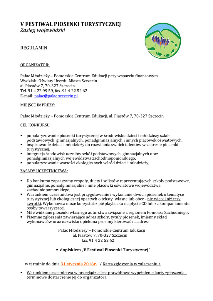 V FESTIWAL PIOSENKI TURYSTYCZNEJ Zasięg wojewódzki REGULAMIN ORGANIZATOR: Pałac Młodzieży – Pomorskie Centrum Edukacji przy wsparciu finansowym Wydziału Oświaty Urzędu Miasta Szczecin al. Piastów 7, 70-327 Szczecin Tel. 91 4 22 99 59, fax. 91 4 22 52 62 E-mail: [email protected] MIEJSCE IMPREZY: Pałac Młodzieży – Pomorskie Centrum Edukacji, al. Piastów 7, 70-327 Szczecin CEL KONKURSU: popularyzowanie piosenki turystycznej w środowisku dzieci i młodzieży szkół podstawowych, gimnazjalnych, ponadgimnazjalnych i innych placówek oświatowych, inspirowanie dzieci i młodzieży do rozwijania swoich talentów w zakresie piosenki turystycznej, integracja środowisk uczniów szkół podstawowych, gimnazjalnych oraz ponadgimnazjalnych województwa zachodniopomorskiego, popularyzowanie wartości ekologicznych wśród dzieci i młodzieży, ZASADY UCZESTNICTWA: Do konkursu zapraszamy zespoły, duety i solistów reprezentujących szkoły podstawowe, gimnazjalne, ponadgimnazjalne i inne placówki oświatowe województwa zachodniopomorskiego, Warunkiem uczestnictwa jest przygotowanie i wykonanie dwóch piosenek o tematyce turystycznej lub ekologicznej opartych o teksty własne lub obce - nie więcej niż trzy zwrotki. Wykonawca może korzystać z półplaybacku na płycie CD lub z akompaniamentu osoby towarzyszącej, Mile widziane piosenki własnego autorstwa związane z regionem Pomorza Zachodniego, Pisemne zgłoszenia zawierające adres szkoły, tytuły piosenek, imienny skład wykonawców oraz nazwisko opiekuna prosimy kierować na adres: Pałac Młodzieży – Pomorskie Centrum Edukacji al. Piastów 7, 70-327 Szczecin fax. 91 4 22 52 62 z dopiskiem „V Festiwal Piosenki Turystycznej” w terminie do dnia 31 stycznia 2016r. / Karta zgłoszenia w załączeniu / Warunkiem uczestnictwa w przeglądzie jest prawidłowe wypełnienie karty zgłoszenia i terminowe dostarczenie jej do organizatora. KATEGORIE WIEKOWE: Soliści: Duety i zespoły (do 8 uczestników): - szkoły podstawowe kl. I-III, IV-VI - gimnazja - szkoły ponadgimnazjalne - szkoły podstawowe kl. I-III, IV-VI - gimnazja - szkoły ponadgimnazjalne OCENA: dobór tekstów intonacja, emisja i dykcja ogólny wyraz artystyczny NAGRODY: Najlepsi wykonawcy w każdej grupie i kategorii wiekowej otrzymają nagrody, a wszyscy uczestnicy otrzymają dyplomy uczestnictwa. TERMINY I MIEJSCE: Festiwal rozpocznie się w Pałacu Młodzieży 27 lutego 2016r. Zgłoszenia przyjmujemy do 31 stycznia 2016 r. Harmonogram przesłuchań zostanie ogłoszony po wpłynięciu zgłoszeń. Informacja o laureatach pojawi się na stronie internetowej Pałacu Młodzieży – PCE w dniu 01.03.2016r. Laureaci wystąpią podczas Gali Ogólnopolskiego Młodzieżowego Turnieju TurystycznoKrajoznawczego, która odbędzie się 7 kwietnia 2016r. w Pałacu Młodzieży – PCE w Szczecinie. UWAGI KOŃCOWE: Zgłoszenia przyjmuje i informacji udziela: Pracownia Turystyczno – Ekologiczna Pałacu Młodzieży - pok. 202 al. Piastów 7, 70-327 Szczecin Elżbieta Wielgoszewska Czwartek: 16.00 - 17.30 Piątek: 15.00 - 16.30 tel. 91 422 52 61 wew. 41 Magdalena Włodkowska Czwartek: 17.00 – 18.30 Piątek: 14.45 – 16.15 tel. 91 422 52 61 wew. 41 e-mail: [email protected] e-mail: [email protected] Organizatorzy zastrzegają sobie prawo wyłączności w interpretacji niniejszego regulaminu. Prosimy o zwrócenie uwagi na swoje rzeczy osobiste (w szczególności przedmioty wartościowe). Za rzeczy pozostawione bez nadzoru Pałac Młodzieży nie odpowiada. Zgodnie z art. 23 ust. 1 pkt. 1 ustawy z 29.08.1997 r. o ochronie danych osobowych (Dz. U. Nr 133, poz. 883 z późn. zm.) dane osobowe zawarte w karcie zgłoszenia wykorzystywane będą jedynie do celów statutowych Pałacu Młodzieży – PCE w Szczecinie. Zgłoszenie dziecka na konkurs, jest jednoznaczne z wyrażeniem zgody na publikację zdjęć na stronie internetowej oraz w publikacjach i folderach Pałacu Młodzieży. Niniejsza zgoda dotyczy wyłącznie publikacji w celach niekomercyjnych.