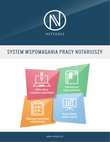 SY S T E M W S P OMAGANIA P RAC Y N O TAR I U S ZY Elektroniczne księgi notarialne Edytor aktów i czynności notarialnych Integracja z systemami eAdministracji Sprawozdania, analizy i raporty www.notaris.pl PAKIE T N O TAR I S - P R O G R AM D L A NOTARIUS ZA PAK I E T N OTA RIS = (NO TARIS O F F ICE + NOTARIS EDYTOR) chmura e Admi ni stracj a ePodatki GIIF Rejestry notarialne eKW NKW KRS PESEL notariusze z programem NOTARIS klienci Oprogramowanie Notaris to system kompleksowej obsługi kancelarii notarialnych. Notarisa sprzedajemy w formie rocznej opłaty licencyjnej - w formie licencji na użytkowanie połączonej z serwisem aplikacji oraz gwarantowanymi aktualizacjami. Zaletą takiej formy licencji jest stosunkowo niska cena zakupu pierwszej licencji jak również fakt, iż przyznawana jest ona w jednej cenie dla całej kancelarii - to znaczy, że koszt oprogramowania jest zawsze jeden bez znaczenia na jakiej ilości komputerów zostanie ono zainstalowane. Oprogramowanie jest dostosowane do obowiązku raportowania przez notariusza transakcji do GIIF - Generalnego Inspektora Informacji Finansowej, zgodnie z Ustawą z dnia 16 listopada 2000 r. (z późniejszymi zm.) o przeciwdziałaniu wprowadzaniu do obrotu finansowego wartości majątkowych pochodzących z nielegalnych lub nieujawnionych źródeł. Z ALETY PROGRAMU jedna licencja „na kancelarię” – program można zainstalować na dowolnej liczbie komputerów pracujących w danej kancelarii automatyczne przenoszenie danych z dokumentów do ksiąg, rejestrów i zestawień notarialnych automatyczna archiwizacja czynności i narzędzia do szybkiego przeszukiwania archiwum dokumentacja i filmy szkoleniowe możliwość łatwego filtrowania i wyszukiwania informacji optymalizacja czasu pracy pracowników kancelarii przejrzysta, łatwa i intuicyjna obsługa bezkonfliktowe korzystanie z zasobów bazy danych przez wielu użytkowników jednocześnie unikalny, specialistyczny program Notaris Edytor służący do przygotowywania dokumentów integracja z elektronicznymi systemami eAdministracji państwa GIIF, eKW, ePodatki szybkie, bezproblemowe wdrożenie z możliwością bezpłatnej asysty zdalna pomoc, pomoc telefoniczna i pomoc poprzez e-mail bezpłatne aktualizacje w cenie oprogramowania niewielkie wymagania sprzętowe praca w sieci komputerowej F U N KCJ O N AL NO ŚCI NO TAR IS O FFICE A,P Edytor aktów i czynności notarialnych Księgi notarialne Skorowidz nazwisk osób i czynności notarialnych Sprawozdania i eDeklaracje Elektroniczne wnioski eKW i raporty do sądów Sprawozdania do ministerstwa sprawiedliwości Kalkulator notariusza Bazy danych (pkd, kodów pocztowych, sądów, …) Faktury Kasa Przelewy Rejestr GIIF Archiwizator czynności w tym aktów notarialnych Notaris www - strona kancelarii notarialnej ePoświadczenia - odpisy, wyciągi, kopie Zaawansowany podpis elektroniczny Przedstawione funkcjonalności pokazują jedynie zarys możliwości aplikacji. Oprogramowanie Notaris to zaawansowane narzędzia wspierające pracę każdej nowoczesnej firmy. Umożliwiają sprawne i bezpiecznego prowadzenie ksiąg notarialnych, porządkują obieg spraw i dokumentów przyczyniają się do zwiększenia efektywności pracy notariusza i jego pracowników. Notaris to połączenie wieloletniej tradycji i doświadczenia pracy naszej firmy z notariuszami z innowacyjnym i nowoczesnym podejściem do informatyzacji firmy - notariatu. O FE R TA NOTARIS OF F ICE RODZAJ LICENCJI PRODUKTY Pakiet Pakiet złoty platynowy 800 zł /rok 1500 zł / rok Notaris Office (Repertorium, Skorowidz, Archiwum, Klienci, Faktury, Kasa, GIIF, Zestawienia i raporty, e-Deklaracje, eKW, Kalkulator opłat, Notaris Edytor dodatek do MS Word) Nowość! Notaris Edytor Plus (dodatek do MS Word umożliwiający składanie wniosków eKW oraz ePoświadczeń - elektronicznego poświadczenia zgodności odpisu, wyciągu lub kopii z okazanym dokumentem) Notaris Edytor Plus może współpracować z innymi systemami wspierania pracy notariusza Dostęp do infolinii telefonicznej - wsparcie techniczne w godz. 8.00 - 16.00 Dostęp do infolinii telefonicznej - wsparcie merytoryczne w godz. 8.00 - 20.00 Ilość stanowisk komputerowych do 2 powyżej 2 P R OM OCJA D LA NO WYCH NO TARIUSZY - 499 ZŁ Jeśli jesteś nowym notariuszem możesz skorzystać z promocji, w ramach której za pierwszy rok zapłacisz 499 zł a za kolejne odpowiednio do wybranej licencji 800 lub 1500 zł. Umowa promocyjna zawierana jest na 3 lata. F U N KCJ O N AL NO ŚCI NO TAR IS E DY TOR Edycja wszystkich dostępnych formatów danych Szybkie formatowanie schematu dokumentu Edycja i wymiana aktów Szybkie generowanie, ze środowiskiem edytowanie i wysyłanie zewnętrznym wniosku do eSądu Edytor wniosków wieczystoksięgowych Podpisywanie każdego dokumentu - ePoświadczenie Weryfikacja zaawansowanego podpisu elektronicznego Zgodność schematu dokumentu ze strukturą danych wniosków eKW Dostarczana przez nas dokumentacja, materiały szkoleniowe oraz wsparcie serwisowe i merytoryczne ułatwiają proces szybkiego uruchomienia i wdrożenia programu. O FER TA N O TAR IS E DYT O R PRODUKTY Licencja 499 zł / rok Nowość! Notaris Edytor Plus (dodatek do MS Word umożliwiający składanie wniosków eKW oraz ePoświadczeń - elektronicznego poświadczenia zgodności odpisu, wyciągu lub kopii z okazanym dokumentem) Notaris Edytor Plus może współpracować z innymi systemami wspierania pracy notariusza Dostęp do infolinii - wsparcie techniczne w godz. 8.00 - 16.00 Ilość stanowisk komputerowych 1 O NAS Działamy od 1991 roku. Wiemy że każdego dnia jako przedsiębiorca podejmujesz nowe wyzwania, dlatego zamierzamy znacząco przyśpieszyć i ułatwić realizację twoich założeń. Kwestionując obecne na rynku status quo, korzystając z najnowszej, dostępnej dla Ciebie technologii, opracowaliśmy narzędzia wspierające obsługę Twojej firmy i twoich Klientów w Internecie. Połączyliśmy swoją wiedzę i doświadcz