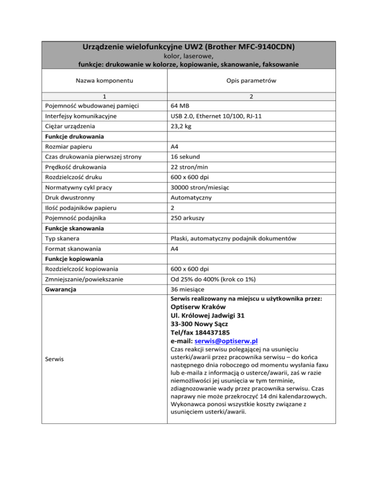 Urządzenie wielofunkcyjne UW2 (Brother MFC-9140CDN) kolor, laserowe, funkcje: drukowanie w kolorze, kopiowanie, skanowanie, faksowanie Nazwa komponentu Opis parametrów 1 Pojemność wbudowanej pamięci 2 64 MB Interfejsy komunikacyjne USB 2.0, Ethernet 10/100, RJ-11 Ciężar urządzenia 23,2 kg Funkcje drukowania Rozmiar papieru A4 Czas drukowania pierwszej strony 16 sekund Prędkość drukowania 22 stron/min Rozdzielczość druku 600 x 600 dpi Normatywny cykl pracy 30000 stron/miesiąc Druk dwustronny Automatyczny Ilość podajników papieru 2 Pojemność podajnika 250 arkuszy Funkcje skanowania Typ skanera Płaski, automatyczny podajnik dokumentów Format skanowania A4 Funkcje kopiowania Rozdzielczość kopiowania 600 x 600 dpi Zmniejszanie/powiekszanie Od 25% do 400% (krok co 1%) Gwarancja 36 miesiące Serwis realizowany na miejscu u użytkownika przez: Optiserw Kraków Ul. Królowej Jadwigi 31 33-300 Nowy Sącz Tel/fax 184437185 e-mail: [email protected] Serwis Czas reakcji serwisu polegającej na usunięciu usterki/awarii przez pracownika serwisu – do końca następnego dnia roboczego od momentu wysłania faxu lub e-maila z informacją o usterce/awarii, zaś w razie niemożliwości jej usunięcia w tym terminie, zdiagnozowanie wady przez pracownika serwisu. Czas naprawy nie może przekroczyć 14 dni kalendarzowych. Wykonawca ponosi wszystkie koszty związane z usunięciem usterki/awarii.