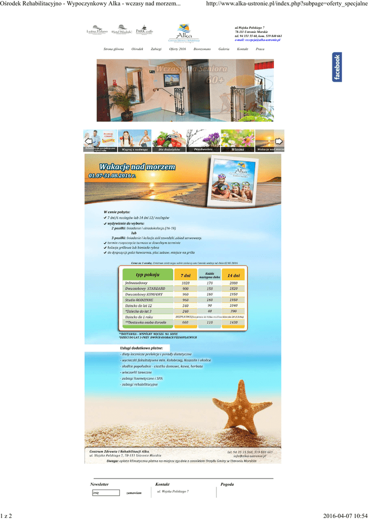 Ośrodek Rehabilitacyjno - Wypoczynkowy Alka - wczasy nad morzem... http://www.alka-ustronie.pl/index.php?subpage=oferty_specjalne ul.Wojska Polskiego 7 78-111 Ustronie Morskie tel. 94 351 55 60, kom. 519 840 661 e-mail: [email protected] Strona główna Ośrodek Newsletter imię 1z2 Zabiegi Oferty 2016 Kontakt zamawiam Biorezonans Galeria Kontakt Praca Pogoda ul. Wojska Polskiego 7 2016-04-07 10:54 Ośrodek Rehabilitacyjno - Wypoczynkowy Alka - wczasy nad morzem... 2z2 e-mail rezygnuję 78-111 Ustronie Morskie tel. 94 351 55 60 kom. 519 840 661 email: [email protected] http://www.alka-ustronie.pl/index.php?subpage=oferty_specjalne temperatura: °C wiatr: 0 km/h ciśnienie: 0 HPa 2016-04-07 10:54