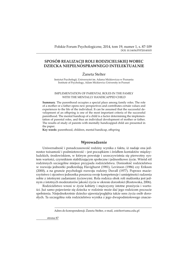 Polskie Forum Psychologiczne, 2014, tom 19, numer 1, s. 87-109 DOI: 10.14656/PFP20140105 Xȱȱȱȱȱ ȱRȱ ȱ Instytut Psychologii, Uniwersytet im. Adama Mickiewicza w Poznaniu ȱȱ¢¢ǰȱȱ £ȱ¢ȱȱ£Ú IMPLEMENTATION OF PARENTAL ROLES IN THE FAMILY WITH THE MENTALLY HANDICAPPED CHILD ¢. The parenthood occupies a special place among family roles. The role of a mother or a father opens new perspectives and contributes certain values and experiences to the life of the individual. It can be assumed that the successful deȱȱȱěȱȱȱȱȱȱȱȱȱȱȱ parenthood. The mental handicap of a child is a factor determining the implementation of parental roles, and thus an individual development of mother or father. The results of study of parents with mentally handicapped child are presented in the paper. ¢ȱ DZȱǰȱǰȱȱǰȱě £ ï°ȱȱ£ ï°ȱ£¢ȱ ¢ȱ£ȱǰȱČȱȱȱȱČï°ȱȱ ï°ȱȮȱȱ£ȱȱĊàÙȱà ȱ¿£¢£ǰȱ ï ǰȱ ȱ à¢ȱ ȱ ȱ ££¢ ȱ ¿ȱ ¢ȱ ¢ȱ ïǰȱ£¢ȱ£¢ȱÙ£ȱȱ ȱČ¢ǯȱïàȱàȱ £¢ȱ ££àȱ ȱ £¢ȱ £ ǯȱ Ùï°ȱ £ ȱ ȱ £ ȱ ȱ ïȱ ȱ ǻŗşŞŗǼǰȱ ȱ ǻŗşŞŜǼȱ £¢ȱ ȱ (2000), a na gruncie psychologii rozwoju rodziny Duvall (1977). Poprzez macie£¢Ú ȱȱ ȱȱ££ȱ ȱȱȱ¿ïȱ£ȱ ȱ£ȱ¢ȱ£ȱČ¢ ¢ǯȱȱ£ȱȱȱÙČȱȱ¢ȱ£ȱ¢ȱà ȱïȱČ¢ȱ ȱȱÙïȱǻ ǰȱŘŖŖŜǼǯȱ £ ȱ ȱ ȱ Č¢ȱ ¢ȱ ȱ ¿Č£¢£¢ȱ ȱ £Č¢ȱ ȱ ïǯȱČȱȱ ȱ¿ȱ£ȱ ȱ£ȱČȱ°ȱȱ£ȱ£ȱ Ùǯȱȱ£ȱ ȦÙ¿ȱČȱȱČ¢ȱàȱÙ¢ǯȱȱ££àȱȱ£ ȱ ¢ȱ£ȱȱ ȱ££- ȱȱDZȱ aneta Stelter, e-mail, [email protected] strona 87 ǯȱȱ £ȱàȱÙȱàȱ£ǰȱȱȱ£ȱȱȱ ¢ ǰȱ££ȱ Ù¢ ȱȱ£ àȱ ǯȱȱȱ ȱ££cy czynnik zmian rozwojowych rodziców (Bakiera, 2009). ȱȱ¿°ǰȱ Čȱ ȱ ȱ ¢ȱ £ȱ ȱ ȱ ¢ïȱ £ ȱ Ù¢ȱ ȱ £ ȱ ȱ £¢ǰȱ ȱ Úȱ £Č ȱ ȱ £ ȱ ïȱ ¿ȱ ȱȱȱÙ¿ȱ£Č ȱȱ ¢ ȱȱ£Č¢ȱȱ£ȱ czynników. ȱ £¿ȱȱ ȱ ¢ ï°ȱ£ȱ£ ȱȱȱ£ȱ¢ǯȱ£ ȱȱȱȱȱ¢ ȱ¿ȱȱȱ£ǯȱȱ ȱÙȱà ¢ ¢ȱȱȱȱ£¢ȱï £ȱǰȱ£ȱ ȱ¢ȱàȱ£ȱȱ£ £¢ǯȱ££ȱǰȱČȱ¢ ï°ȱ£à ȱȱ¿ȱȱ £ǰȱ£ȱ ȱïȱ¢ ïȱǻȱȱǼȱȱ£ȱȱȱ ȱ£ȱ ¢ȱ¢ȱ£ȱȱČ ïȱǻǰȱŗşşŞǼǯȱ £ ȱČȱČȱ¢°ȱ£ ȱ ȱàČ¢ȱàǯȱȬȱǻŘŖŖşǼȱ ¢àČȱ ¿ȱ¢ȱǮ¢°ȱ£ȱǻȦǼȄȱ£ȱ ¿ȱǮ°ȱ£Ȅǯȱ ȱ¢ȱǮ°Ȅȱȱ ȱ£ȱ£ ȱȱ£ȱ¢£¢ȱ ȱȱ£ȱ£ȱȱǯȱ£ ȱę ȱ ȱǮ¢°Ȅȱ£ ȱȱ ȱ¢ȱï ȱ£ ȱ ǰȱČ ȱ£¿ȱ£¢¢ ȱÙȱ£ ȱ£à ȱ£ǰȱȱȱ£ǰȱ ȱČ ïȱ à£ȱ¢ ïǰȱ ǰȱï ¿ȱ ȱ£Č¢ ǯȱ¢ȱ£ȱȱ£Č ¢ȱ ȱ ȱ£ ǰȱ¢ ȱ ȱ£Č¢ ǰȱęȱ ȱàȱĚ¢¢ȱ£°ȱȱ£ǰȱȱČ ïȱ£ ȱ ȱ °ȱ ¿ȱ ȱ ǰȱ ȱ ¢£¢ȱ ȱ Č ¢ȱ ȱ £¢ȱ £ȱ ǻĴǰȱŘŖŖśǼǯȱ ȱ £ȱ £ȱ ïȱ ȱ £ȱ £ȱ £Ùȱ ȱȱ Ù¢ ȱ¢ȱǰȱǰȱȱÙ£ȱǻ£ǰȱ £ǰȱïǼǰȱ£ȱ£¢ȱ£ȱ Ù¢ȱ£ȱȱ£ Úǯȱȱȱ££¢ȱ Ù¢ ȱȱàȱ£ ȱȱ£ǰȱȱȱ £ȱDZȱǮǻǯǯǯǼȱ ¢ȱ à ǰȱ Ùï ȱ ¢£ ȱ £ ȱ à£ǰȱ £¢ȱȱ ȱȱȱ£ȱȱ ȱȱ°ȱ£ȱ£ȄȱǻŘŖŖŖǰȱǯȱŗŘǼǯ £ȱȱȱȱȱ£ȱÙ ȱ ÙȱïȱȱÙ£ǰȱï¢ȱ£ £ȱȱï¢ȱ£ Úǯȱ££ȱ£ ȱ£ȱ£ȱȱ££ȱ ȱ ï°ǰȱȱ£¢ȱ ȱȱ£ȱ ¢ ȱ ȱÙ£ǯȱÙȱȱ ȱ£ȱȱ ȱČ ïǰȱȱČȱ ȱ£ǯȱȱÙ£ȱ ȱï¢ȱ ȱȱ£ȱ£àȱ£ Úȱ ¢ȱȱȱ£ȱïȱ£¢¿ȱ ȱ£ȱÙ£ǯȱ¢ȱęȱ¿ǰȱïȱ £ ȱ ȱ ȱ ££ȱ ȱ ȱ ȱ ȱ ¢ȱ ¢Ù¿ȱ ȱ ¢ ȱ ¢ȱ ££Úǯȱ àȱ £ ȱ ȱ ȱ £ȱ ȱǮ ¢ȱȄȱǻ£ ȱÙ£ȱ ȱȱȱǼȱ£ȱ Ǯȱ Ȅȱ ǻȱ £ȱ ¢ȱ £ Úȱ ££ȱ ¿Ǽȱ ǻǰȱ Manenti, 2002). strona 88 £ ȱ£à ȱȱČȱȱ¢°ȱȱ£ȱ £¿ȱȱȱȱÙǯȱȱ£ ¿£¢ȱǻ¢Ǽȱ£ȱȱ ¿£¢ȱǻǰȱï £ǰȱ ïǰȱ£ Ǽȱ £ȱ ǰȱ ȱà¢ȱȱÙ£ȱ££Ùȱ¿ȱ£ȱàȱȱ ȱ¢ȱ £àȱ£Ùȱ ȱ¢ȱ ǯȱȱČȱČ¢ȱà °ȱȱ¢ȱȱȱ£¢ ȱàȱǻȱ ǼǰȱȱČȱȱȱ £ȱàȱǻȱǼǰȱ£¢ȱȱ¢ę ȱ ȱ ¢ȱȱ£ȱ¢ǯȱ¿ȱǮ £ȱȄȱȱȱÙ£¢ȱ £Ùȱ ȱŗşŜŘȱȱȱǻ£DZȱ£ȬǰȱŘŖŖŜDzȱǯȱRïǰȱŘŖŖŘDzȱǰȱŘŖŖŜǼǯȱ Ùȱ ȱ ȱ Č¢ȱ Ù£¢ȱ £ȱ £ȱ ȱ ȱ ¢ęȱ ȱǯȱȱȱȱ£¢ǰȱ¢ȱ£ȱà¢ȱïȱ£ǯȱ Č¢ȱ à °ȱ ȱ Ǯ£¢£Ȅǰȱ Ǯ ¢£Ȅȱ £¢ȱ ǮȄȱ àǰȱ ȱ ȱ¢°ȱà Čȱ ȱ ȱȱȱ£ȱȱǯȱ¿ȱȱÙ£ȱ£ȱ¢ ¢ȱ¢£ȱ£ȱ££ǰȱČȱàȱȱÙȱ £ ȱ¢ ȱ¿ȱȱ ȱȱ ȱǯȱÙȱ Rïȱ ǻŘŖŖŘǼȱ ȱ ȱ £ȱ ȱ Č¢ȱ ¢àȰȱ £à ȱ £ ȱï £ȱȱ£¢ ȱ¿ȱȱǰȱȱȱ£ ȱ £ȱȱȱ £¢ ǯȱ£¢ ȱ ¢Čȱ¿ȱȱȱȱï £¢ȱȱ£ïȱ £à ȱǯȱČȱ ¢Č°ȱ¿ȱ££DZȱ¢ę¿ȱ£ȱǰȱ ȱǰȱ ȱ ȱ¿ȱȱ¢£¢£¿ȱǯȱȱ£ Úȱ£¢ £¢ȱȱ ££¢ÙȱDZȱ¿ȱǰȱ¿ȱȱ£ȱ¿ȱǯ ȱȱČ¢ȱČ¢ȱ£Ù ȱÙȱ ȱàǰȱȱ¢ ï°ȱ£ £ȱ£ȱȱ£ȱ ȱȱȱ£ ȱ¢ ¢ǯȱȱàȱȱ £¢ȱ ȱàȱ ¢ȱ ǻǯȱ ȱ ¿ȱ £Ǽǰȱ ȱ ȱ ¢ȱ £ ȱ £¢ȱ ȱ £ȱ ¢ȱ ǻǯȱ ȱ Ȧǰȱ Ȧ£Ǽȱ Ċȱ ¿ ȱ £ ȱ ¢ ȱǯȱïàȱàȱ£Ù ȱÙȱïȱ¿ȱȱ£ȱȱǰȱàȱ ȱĊàÙȱ Č¢ȱï £Úȱȱ ȱàȱ¢ȱ Ù¢ ȱȱȱ£ àȱ¢£¢ȱǻ ȬÙǰȱŘŖŖřǼǯȱȱȱ£¢ȱ ȱȱ£ȱÙ¢ȱ ¢ȱï ȱ ¢ǰȱȱ ȱ£¢ȱ£à ȱ £ȱÙ ¢ȱȱï ¢ȱ ¢àȱ¢Ùȱ£ £¢ȱ£ȱ¿ȱ ȱ£ ǰȱȱȱÙ ȱ ǯȱ¿ȱ£ȱ£ȱ ï£ȱ¢Ù ȱȱȱ£ȱ££ȱ£¢°ȱ£ȱ ȱ£ ÚȱÙ£¢ǯȱ £¢ïȱȱï ȱ£ȱ£ȱ£ȱ ïȱ¢Ù ȱȱȱȱČ¢ȱȱ££ȱ¿ǰȱȱ££ȱǯȱȱ¢ȱ£¢ȱȱ £ȱ ȱ¿ȱ£ȱȱ£ȱ¢ǰȱÙà ȱ£ȱ ȱ£Čïȱ¿£¢ȱ oczekiwaniami rodzicielskimi a stanem zdrowia i rozwoju dziecka (Kramarczyk, ŗşŞşDzȱǰȱǰȱ ǰȱŘŖŖŘǼǯȱ£ȱ£ȱ°ȱ Ùï ¢ȱ £¢ȱ£ǰȱ ȱà¢ȱ£ȱ¿ȱ£ǰȱĵ ǯȱ¢ ¢ȱ¢£¢ȱ ¢¢ȱ £ȱ£¢ȱ¢ȱČ¢ȱ£ȱ£ȱ£ °ȱǰȱČȱ£ȱȱÙ ǰȱȱȱ£ Úǰȱȱ£ȱ££ȱȮȱ£ǯȱ ȱ¿ȱtywne emocje, a rozpacz po „zdrowym dziecku” utrudnia realizowanie rodzicielstwa wobec dziecka z ograniczonym rozwojem (por. Solnit, Stark, 1961; Ellis, 1989). ȱ ȱ £¿ȱ ¢ȱ ¢ȱ ¿ȱ ȱ £ȱ ȱ ȱ ȱ ȱ £ȱ Ù ȱǯȱ strona 89 ¿ Ȭ ȱǻŘŖŖřǰȱŘŖŖŝǼȱ£¢ę Ùȱ ¢ȱ££ȱRïȱǻŘŖŖŘǼȱ ȱ£¢ ȱ¿ȱȱȱÙ£ȱ ȱȱȱ£à ȱ£ȱÙ ¢ȱ ǰȱ £¿ȱ ȱ ȱ ȱ ȱ ȱǯȱȱ ȱà