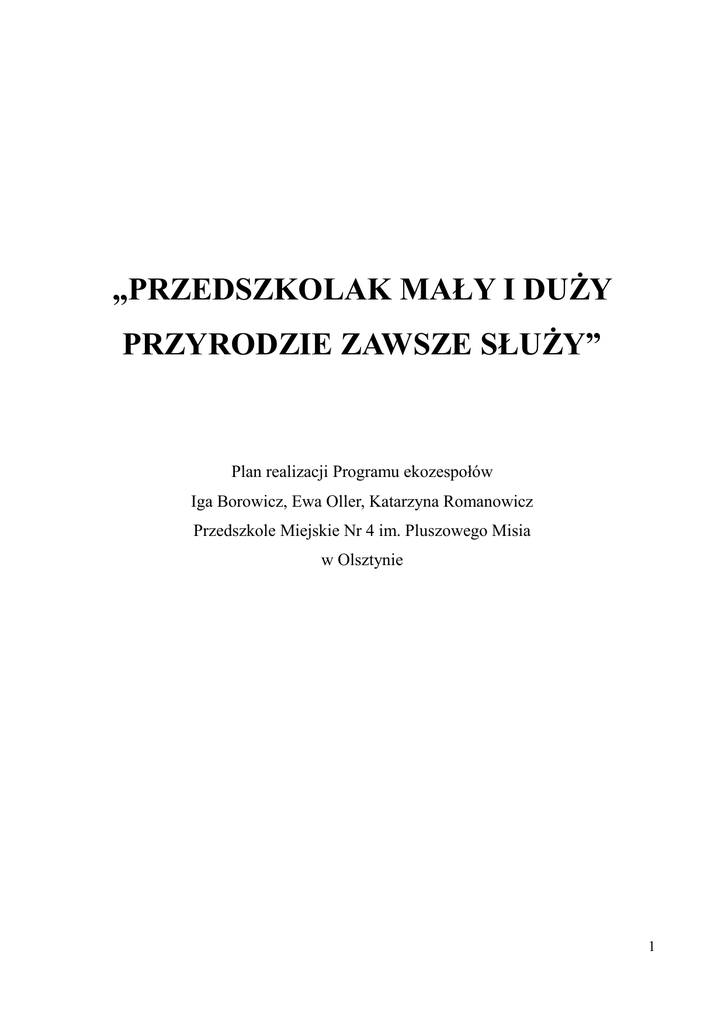 „PRZEDSZKOLAK MAŁY I DUŻY PRZYRODZIE ZAWSZE SŁUŻY” Plan realizacji Programu ekozespołów Iga Borowicz, Ewa Oller, Katarzyna Romanowicz Przedszkole Miejskie Nr 4 im. Pluszowego Misia w Olsztynie 1 „Jeżeli każdy z nas dołoży jakąś cząstkę, to po troszeczku możemy dokonać wielkich zmian na lepsze, na których skorzysta całe społeczeństwo.” Prof. Barbara Szacka Wstęp Niezmiernie ważnym zadaniem stojącym przed dzisiejszą edukacją jest działalność ekologiczna zapoczątkowana już w przedszkolu. Jest to wiek, który charakteryzuje się dużym skokiem intelektualnym w rozwoju dziecka. Działania nauczycieli już w przedszkolu są więc niepowtarzalną szansą kształtowania nowych, przyjaznych naturze postaw. Znaczącą rolę odgrywa tu podnoszenie świadomości i wrażliwości ekologicznej, a także budzenie radości i zaciekawienia z jednoczesnym kształtowaniem właściwych postaw ekologicznych. Troska o środowisko i troska o dzieci są ze sobą blisko związane. Dlatego pragniemy tym programem przyczynić się do umożliwienia dzieciom od najmłodszych lat odkrywania środowiska i doświadczania jego cennych zasobów. Wiemy, że wraz z doświadczeniem przyjdzie odpowiedzialność za jego ochronę oraz zrozumienie związków i wpływu, jakie środowisko ma na nasze życie. Cele ogólne: kształtowanie postaw i świadomości ekologicznej dzieci w wieku przedszkolnym; tworzenie trwałych nawyków i zachowań ekologicznego stylu życia w domu, przedszkolu i najbliższym otoczeniu; kształtowanie postawy opiekuńczej wobec przyrody i budzenie odpowiedzialności za jej stan Sprzymierzeńcy: rodzice, pracownicy przedszkola, dyrektor, leśniczy, Olsztyńskie Centrum Edukacji Ekologicznej, Muzeum Przyrody w Olsztynie, Zakład Gospodarki odpadami Komunalnymi w Olsztynie, Wydział Ochrony Środowiska przy UWM- ie w Kortowie Prezentacja działań: obchody Dnia Ochrony Przyrody, wystawa prac plastycznych dzieci, inscenizacja, zajęcia warsztatowe z rodzicami, spotkanie z przedszkolakami z innej placówki o tematyce ekologicznej, dokumentacja zdjęciowa, Katalog Miłośników Przyrody, tablica informacyjna 2 Harmonogram działań: I. NASZE PRZEDSZKOLE DZIAŁA W EKOZESPOLE Cele: uświadomienie dzieciom potrzeby ochrony środowiska wskazanie sposobów do działań na rzecz przyrody zaangażowanie rodziców w realizację niektórych zadań wykonywanych w ramach Programu ekozespołów Zadania i sposób realizacji 1. CO TO JEST EKOLOGIA? burza mózgów wspólne zredagowanie ZASAD MIŁOŚNIKA PRZYRODY – kodeksu ekologicznego Osoby odpowiedzialne Nauczyciel 2. TWORZYMY EKOZESPÓŁ Nauczyciel Dzieci co to jest ekozespół? (rozmowa, wybór nazwy ) projektowanie logo zespołu ( prace dzieci ) 3. DZIEŃ OCHRONY PRZYRODY quizy i zagadki uroczyste złożenie ślubowania ekologicznego sprzątanie świata Nauczyciel Dzieci 4. MAMA, TATA I JA spotkanie z rodzicami prezentacja przedstawienia ekologicznego poinformowanie rodziców o Programie ekozespołów Czy twój dom jest ekologiczny?wypełnienie ankiety ekologicznej przez rodziców Nauczyciel Rodzice Dzieci Termin wrzesień Październik listopad II. DLACZEGO KAŻDA KROPLA WODY JEST CENNA? Cele: poznanie źródeł zanieczyszczeń wód kształtowanie umiejętności racjonalnego wykorzystania zasobów wody uświadomienie wpływu czystej wody na stan naszego zdrowia oraz życie roślin i zwierząt Zadania i sposób realizacji 1. CZYSTA WODA ZDROWIA DODA wycieczka do oczyszczalni przy UWM- ie Osoby odpowiedzialne Nauczyciel Termin Wrzesień październik 3 w Kortowie 2. GDZIE MIESZKA WODA wycieczka nad rzekę, jezioro pobranie próbek wody założenie w sali laboratorium do badań i obserwacji i eksperymentów Nauczyciel Wrzesień październik 3. OBIEG WODY W PRZYRODZIE zabawy badawcze poznawanie właściwości wody i jej roli w życiu organizmów żywych zapoznanie z obiegiem wody w przyrodzie Nauczyciel Wrzesień październik 4. DBAMY O WODĘ Nauczyciel Dzieci historyjka obrazkowa, quiz omówienie sposobów oszczędzania wody w domu, przedszkolu wykonanie piktogramów do łazienek w całym przedszkolu Wrzesień październik III.CZYM ŻYJE LAS ? Cele: rozwijanie aktywnych form wypoczynku na łonie natury rozbudzanie wrażliwości na otaczające nas środowisko kształcenie aktywnego, twórczego stosunku dziecka do otaczającego je świata poprzez aranżowanie sytuacji zachęcających do jego poznawania Zadania i sposób realizacji 1. LAS ZAPRASZA SERDECZNIE DZIECI I PROSI... wycieczka do lasu, spotkanie z leśnikiem. Osoby odpowiedzialne Pan leśniczy Nauczyciel 2. ZWIERZĘTA WARMII I MAZUR Nauczyciel wycieczka do muzeum Przyrody Warmii i Mazur w Olsztynie. Zajęcia warsztatowe zapoznanie ze zwierzętami Warmii i Mazur Termin Październik listopad Październik listopad 3. Czym żyje las? warstwy lasu czyje domy są w lesie dbamy o ptaki zwierzęta zimą Nauczyciel Październik listopad 4. MALUJEMY PRZYRODĘ prace plastyczne dzieci Nauczyciel Październik listopad 4 odzwierciedlenie wrażliwości i szacunku do przyrody w formie plastycznego wyrazu IV. ODPADY SEGREGUJĘ, DOBRZE SIĘ Z TYM CZUJĘ!!! Cele: kształtowanie właściwych postaw konsumenckich oraz wdrażanie do konkretnych działań: segregowanie makulatury, opakowań szklanych i plastikowych Zadania i sposób realizacji Osoby odpowiedzialne Termin 1. SEGREGUJEMY ODPADY W Nauczyciel PRZEDSZKOLU I W DOMU Pracownik ZGOK -u wycieczka do sortowni śmieci przy ZGOKu. działalność plastyczno- konstrukcyjna dzieci z wykorzystaniem materiałów odpadowych marzec 2. Czarodziejskie słowo RECYKLING Nauczyciel Pracownik ZGOK -u zajęcia prowadzone przez pracownika ZGOK- u wyjaśnienie znaczenia słowa RECYKLING ukazanie sposobów ponownego wykorzystania segregowanych odpadów Styczeń luty 3. EKOLOGICZNE ZAKUPY Nauczyciel Rodzice zajęcia warsztatowe z rodzicami wykonanie papierowej torby wielokrotnego Dzieci użytku Styczeń luty 4. PRZYRODA SŁOWEM OGŁASZANA przygotowanie spektaklu te