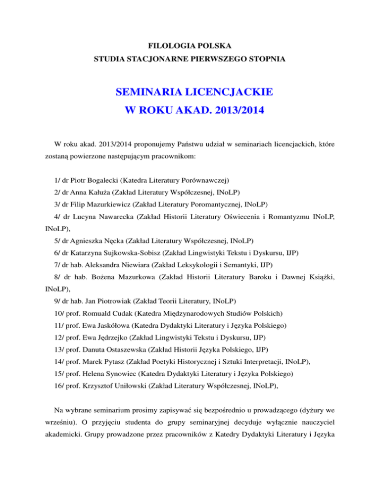 SEMINARIA LICENCJACKIE W ROKU AKAD. 2013/2014