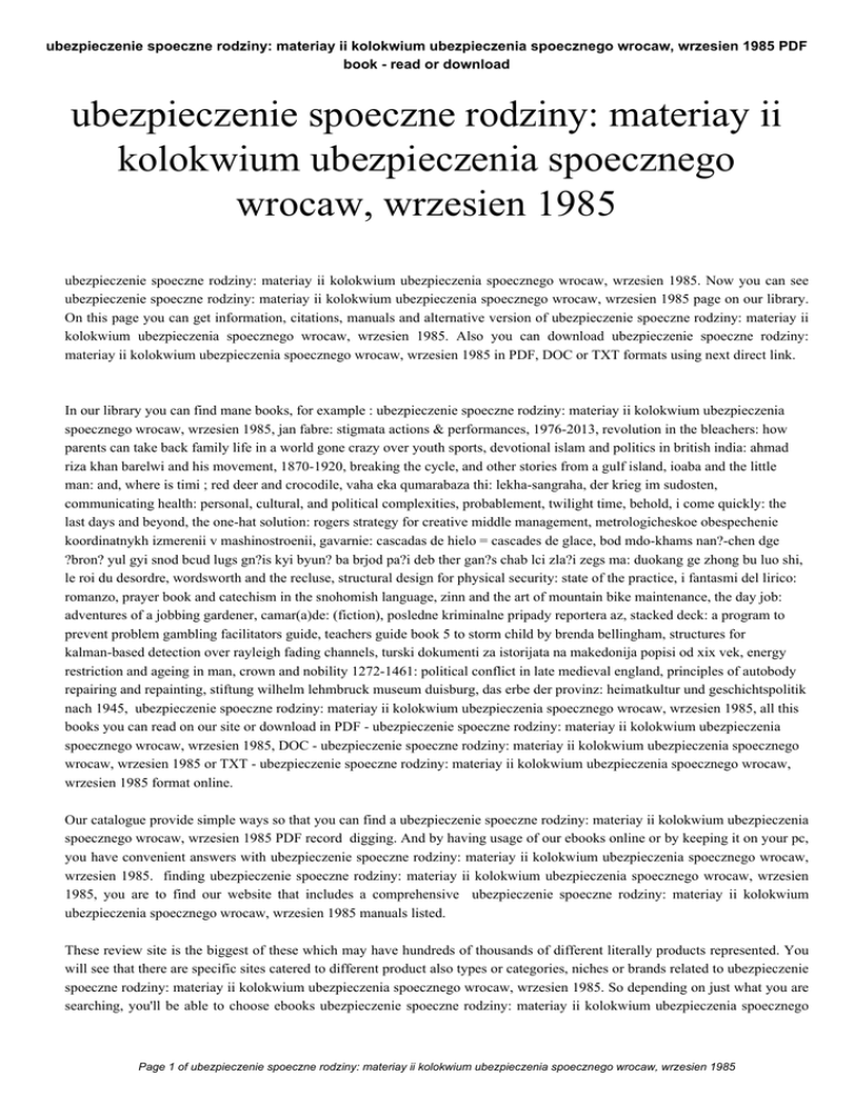ubezpieczenie spoeczne rodziny: materiay ii kolokwium ubezpieczenia spoecznego wrocaw, wrzesien 1985 PDF book - read or download ubezpieczenie spoeczne rodziny: materiay ii kolokwium ubezpieczenia spoecznego wrocaw, wrzesien 1985 ubezpieczenie spoeczne rodziny: materiay ii kolokwium ubezpieczenia spoecznego wrocaw, wrzesien 1985. Now you can see ubezpieczenie spoeczne rodziny: materiay ii kolokwium ubezpieczenia spoecznego wrocaw, wrzesien 1985 page on our library. On this page you can get information, citations, manuals and alternative version of ubezpieczenie spoeczne rodziny: materiay ii kolokwium ubezpieczenia spoecznego wrocaw, wrzesien 1985. Also you can download ubezpieczenie spoeczne rodziny: materiay ii kolokwium ubezpieczenia spoecznego wrocaw, wrzesien 1985 in PDF, DOC or TXT formats using next direct link. In our library you can find mane books, for example : ubezpieczenie spoeczne rodziny: materiay ii kolokwium ubezpieczenia spoecznego wrocaw, wrzesien 1985, jan fabre: stigmata actions & performances, 1976-2013, revolution in the bleachers: how parents can take back family life in a world gone crazy over youth sports, devotional islam and politics in british india: ahmad riza khan barelwi and his movement, 1870-1920, breaking the cycle, and other stories from a gulf island, ioaba and the little man: and, where is timi ; red deer and crocodile, vaha eka qumarabaza thi: lekha-sangraha, der krieg im sudosten, communicating health: personal, cultural, and political complexities, probablement, twilight time, behold, i come quickly: the last days and beyond, the one-hat solution: rogers strategy for creative middle management, metrologicheskoe obespechenie koordinatnykh izmerenii v mashinostroenii, gavarnie: cascadas de hielo = cascades de glace, bod mdo-khams nan?-chen dge ?bron? yul gyi snod bcud lugs gn?is kyi byun? ba brjod pa?i deb ther gan?s chab lci zla?i zegs ma: duokang ge zhong bu luo shi, le roi du desordre, wordsworth and the recluse, structural design for physical security: state of the practice, i fantasmi del lirico: romanzo, prayer book and catechism in the snohomish language, zinn and the art of mountain bike maintenance, the day job: adventures of a jobbing gardener, camar(a)de: (fiction), posledne kriminalne pripady reportera az, stacked deck: a program to prevent problem gambling facilitators guide, teachers guide book 5 to storm child by brenda bellingham, structures for kalman-based detection over rayleigh fading channels, turski dokumenti za istorijata na makedonija popisi od xix vek, energy restriction and ageing in man, crown and nobility 1272-1461: political conflict in late medieval england, principles of autobody repairing and repainting, stiftung wilhelm lehmbruck museum duisburg, das erbe der provinz: heimatkultur und geschichtspolitik nach 1945, ubezpieczenie spoeczne rodziny: materiay ii kolokwium ubezpieczenia spoecznego wrocaw, wrzesien 1985, all this books you can read on our site or download in PDF - ubezpieczenie spoeczne rodziny: materiay ii kolokwium ubezpieczenia spoecznego wrocaw, wrzesien 1985, DOC - ubezpieczenie spoeczne rodziny: materiay ii kolokwium ubezpieczenia spoecznego wrocaw, wrzesien 1985 or TXT - ubezpieczenie spoeczne rodziny: materiay ii kolokwium ubezpieczenia spoecznego wrocaw, wrzesien 1985 format online. Our catalogue provide simple ways so that you can find a ubezpieczenie spoeczne rodziny: materiay ii kolokwium ubezpieczenia spoecznego wrocaw, wrzesien 1985 PDF record digging. And by having usage of our ebooks online or by keeping it on your pc, you have convenient answers with ubezpieczenie spoeczne rodziny: materiay ii kolokwium ubezpieczenia spoecznego wrocaw, wrzesien 1985. finding ubezpieczenie spoeczne rodziny: materiay ii kolokwium ubezpieczenia spoecznego wrocaw, wrzesien 1985, you are to find our website that includes a comprehensive ubezpieczenie spoeczne rodziny: materiay ii kolokwium ubezpieczenia spoecznego wrocaw, wrzesien 1985 manuals listed. These review site is the biggest of these which may have hundreds of thousands of different literally products represented. You will see that there are specific sites catered to different product also types or categories, niches or brands related to ubezpieczenie spoeczne rodziny: materiay ii kolokwium ubezpieczenia spoecznego wrocaw, wrzesien 1985. So depending on just what you are searching, you'll be able to choose ebooks ubezpieczenie spoeczne rodziny: materiay ii kolokwium ubezpieczenia spoecznego Page 1 of ubezpieczenie spoeczne rodziny: materiay ii kolokwium ubezpieczenia spoecznego wrocaw, wrzesien 1985 ubezpieczenie spoeczne rodziny: materiay ii kolokwium ubezpieczenia spoecznego wrocaw, wrzesien 1985 PDF book - read or download wrocaw, wrzesien 1985 to fit your own needs, ubezpieczenie spoeczne rodziny: materiay ii kolokwium ubezpieczenia spoecznego wrocaw, wrzesien 1985. Page 2 of ubezpieczenie spoeczne rodziny: materiay ii kolokwium ubezpieczenia spoecznego wrocaw, wrzesien 1985