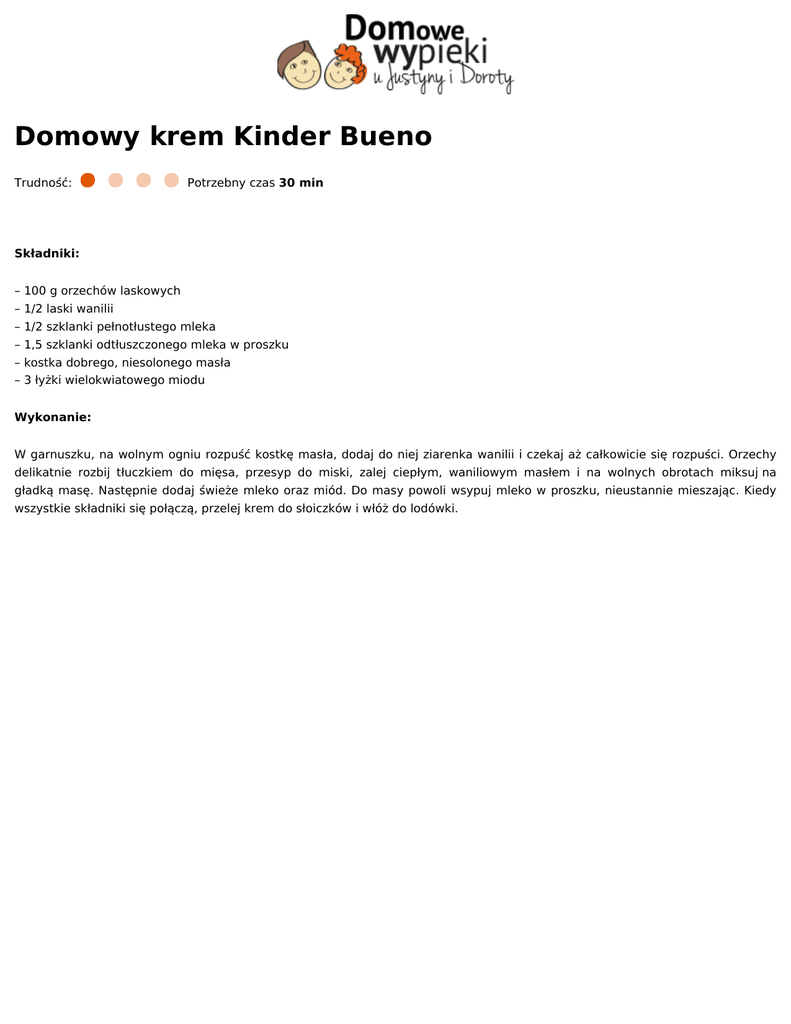 Domowy krem Kinder Bueno Trudność: Potrzebny czas 30 min Składniki: – 100 g orzechów laskowych – 1/2 laski wanilii – 1/2 szklanki pełnotłustego mleka – 1,5 szklanki odtłuszczonego mleka w proszku – kostka dobrego, niesolonego masła – 3 łyżki wielokwiatowego miodu Wykonanie: W garnuszku, na wolnym ogniu rozpuść kostkę masła, dodaj do niej ziarenka wanilii i czekaj aż całkowicie się rozpuści. Orzechy delikatnie rozbij tłuczkiem do mięsa, przesyp do miski, zalej ciepłym, waniliowym masłem i na wolnych obrotach miksuj na gładką masę. Następnie dodaj świeże mleko oraz miód. Do masy powoli wsypuj mleko w proszku, nieustannie mieszając. Kiedy wszystkie składniki się połączą, przelej krem do słoiczków i włóż do lodówki.