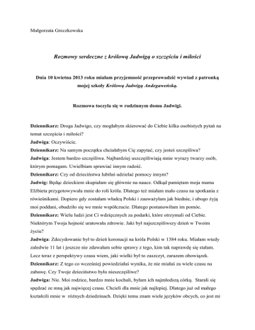Małgorzata Greczkowska Rozmowy serdeczne z królową Jadwigą o szczęściu i miłości Dnia 10 kwietna 2013 roku miałam przyjemność przeprowadzić wywiad z patronką mojej szkoły Królową Jadwigą Andegaweńską. Rozmowa toczyła się w rodzinnym domu Jadwigi. Dziennikarz: Droga Jadwigo, czy mogłabym skierować do Ciebie kilka osobistych pytań na temat szczęścia i miłości? Jadwiga: Oczywiście. Dziennikarz: Na samym początku chciałabym Cię zapytać, czy jesteś szczęśliwa? Jadwiga: Jestem bardzo szczęśliwa. Najbardziej uszczęśliwiają mnie wyrazy twarzy osób, którym pomagam. Uwielbiam sprawiać innym radość. Dziennikarz: Czy od dzieciństwa lubiłaś udzielać pomocy innym? Jadwig: Będąc dzieckiem skupiałam się głównie na nauce. Odkąd pamiętam moja mama Elżbieta przygotowywała mnie do roli króla. Dlatego też miałam mało czasu na spotkania z rówieśnikami. Dopiero gdy zostałam władcą Polski i zauważyłam jak biednie, i ubogo żyją moi poddani, obudziło się we mnie współczucie. Dlatego postanowiłam im pomóc. Dziennikarz: Wielu ludzi jest Ci wdzięcznych za podarki, które otrzymali od Ciebie. Niektórym Twoja hojność uratowała zdrowie. Jaki był najszczęśliwszy dzień w Twoim życiu? Jadwiga: Zdecydowanie był to dzień koronacji na króla Polski w 1384 roku. Miałam wtedy zaledwie 11 lat i jeszcze nie zdawałam sobie sprawy z tego, kim tak naprawdę się stałam. Lecz teraz z perspektywy czasu wiem, jaki wielki był to zaszczyt, zarazem obowiązek. Dziennikarz: Z tego co wcześniej powiedziałaś wynika, że nie miałaś za wiele czasu na zabawę. Czy Twoje dzieciństwo było nieszczęśliwe? Jadwiga: Nie. Moi rodzice, bardzo mnie kochali, byłam ich najmłodszą córką. Starali się spędzać ze mną jak najwięcej czasu. Chcieli dla mnie jak najlepiej. Dlatego już od małego kształcili mnie w różnych dziedzinach. Dzięki temu znam wiele języków obcych, co jest mi bardzo przydatne. W przerwach między nauką spędzałam dużo czasu z moim rodzeństwem. Czasy dzieciństwa wspominam bardzo dobrze. Dziennikarz: Następne pytanie dotyczy miłości. Kto był Twoją pierwszą miłością? Jadwiga: Byłam zakochana w Wilhelmie Habsburgu. Mając pięć lat przyjęłam jego zaręczyny. On miał wówczas lat osiem. Niestety nie mogliśmy się pobrać. Dziennikarz: Co się stało potem? Dlaczego wasz związek nie przetrwał? Jadwiga: W 1385 roku chciałam dopełnić ceremonii małżeńskiej. Ale panowie krakowscy mieli względem mnie inne plany. Polską koronę ofiarowali Jagielle- litewskiemu księciu, który miał przyjąć chrzest wraz ze swoim państwem. Kasztelan krakowski wypędził mojego ukochanego. Byłam zrozpaczona. Nie wiedziałam co mam zrobić. Byłam wtedy taka młoda. Próbowałam uciec przez bramę wawelską, lecz zatrzymał mnie Dimitr. Miałam mu to za złe. Jeszce długo po tym wydarzeniu rozpaczałam, gdyż moja pierwsza miłość została wygnana, a ja musiałam poślubić mężczyznę, którego nie kochałam. Dziennikarz: To straszne co Ci się przydarzyło. Jak sobie z tym poradziłaś? Jadwiga: Próbowałam sobie tłumaczyć, że tylko i wyłącznie zostanę żoną Jagiełły, aby chronić moje państwo. Chociaż nigdy nie pokochałam litewskiego księcia, to starał się, aż tak tego nie okazywać. Dlatego odwołałam swoje zaręczyny z Wilhelmem i postanowiłam wyjść za mąż za Władysława. Dziennikarz: Kiedy doszło do ceremonii zaślubin? Jadwiga: 18 lutego 1386 roku poślubiłam Jagiełłę, w katedrze na Wawelu. Dziennikarz: Czy na koniec możesz opowiedzieć jedną historię, w której pomogłaś komuś? Jadwiga: Pamiętam niedawno pomogłam mężczyźnie, który miał chore dziecko. Kiedy przechodziłam drogą zauważyłam go, gdy ciężko pracował przy zamku. Wyglądał na zmęczonego, więc postanowiłam z nim porozmawiać. Opowiedział mi o sobie. Zapytany dlaczego nie jest teraz przy swojej rodzinie, odpowiedział, że musi tu pracować by utrzymać dom. Postanowiłam mu pomóc ofiarowując swoją klamrę od buta. Na początku nie chciał jej przyjąć, lecz po moich naleganiach pozwolił sobie na przyjęcie tego skromnego podarku. Dziennikarz: Dziękuję za pouczający wywiad. Jadwiga: Ja również dziękuję.