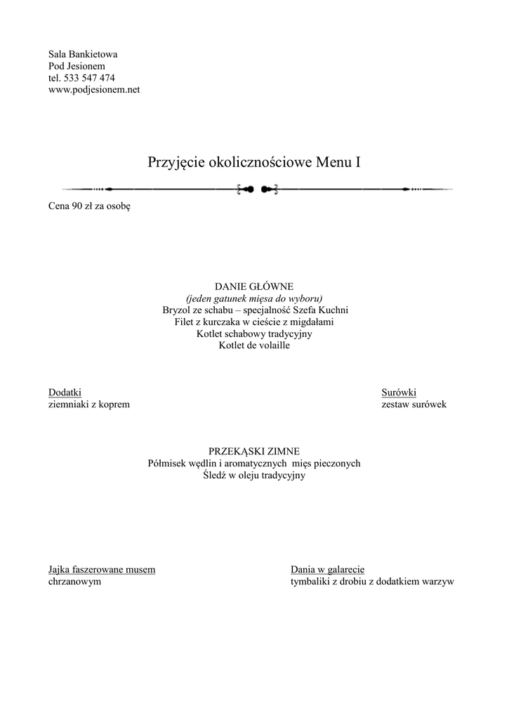 Sala Bankietowa Pod Jesionem tel. 533 547 474 www.podjesionem.net Przyjęcie okolicznościowe Menu I Cena 90 zł za osobę DANIE GŁÓWNE (jeden gatunek mięsa do wyboru) Bryzol ze schabu – specjalność Szefa Kuchni Filet z kurczaka w cieście z migdałami Kotlet schabowy tradycyjny Kotlet de volaille Dodatki ziemniaki z koprem Surówki zestaw surówek PRZEKĄSKI ZIMNE Półmisek wędlin i aromatycznych mięs pieczonych Śledź w oleju tradycyjny Jajka faszerowane musem chrzanowym Dania w galarecie tymbaliki z drobiu z dodatkiem warzyw Sałatki (dwie do wyboru) z kurczakiem, ananasem, porem grecka z serem feta i oliwkami ryżowa z szynką i kukurydzą z makaronem i warzywami z szynką, porem i jajkiem Sosy do przekąsek (jeden do wyboru) żurawinowy chrzanowy tatarski Dodatki pieczywo mieszane masło KOLACJA (jedna do wyboru) Żurek staropolski z jajkiem lub Barszcz czerwony z pasztecikiem NAPOJE Kawa, herbata, woda mineralna Alkohole Pod Jesionem W czasie trwania imprezy czynny jest bar, w którym dostępne są alkohole, drinki, soki, napoje oraz lód. Powyższa oferta ma charakter informacyjny i nie stanowi oferty handlowej w rozumieniu art. 66 §1 kodeksu cywilnego oraz innych właściwych przepisów prawnych. Sala Bankietowa Pod Jesionem tel. 533 547 474 www.podjesionem.net Przyjęcie okolicznościowe Menu II Cena 120 zł za osobę ZUPA (jedna do wyboru) Rosół królewski z makaronem i lubczykiem Krem z brokułów z grzankami czosnkowymi Krem pieczarkowy z groszkiem ptysiowym DANIE GŁÓWNE (wybieramy jeden gatunek mięsa) Sznycel szwajcarski ze schabu z szynką i serem Filet z kurczaka w cieście z migdałami Bryzol – specjalność Szefa Kuchni Kotlet schabowy tradycyjny Kotlet de volaille Rolada śląska Dodatki (jeden do wyboru) kluski śląskie z sosem pieczeniowym ziemniaki z koprem ziemniaki puree ryż Surówki (dwie surówki do wyboru) marchewka z ananasem seler z rodzynkami modra kapusta buraki DESER Pucharek lodowy z bitą śmietaną PRZEKĄSKI ZIMNE Półmisek wędlin i aromatycznych mięs pieczonych przez Szefa Kuchni w towarzystwie pasztetu (karczek, boczek rolowany) Śledź w zalewie ziołowej Śledź w oleju tradycyjny Jajka faszerowane musem (jedno do wyboru) ziołowo - szczypiorkowym pieczarkowym chrzanowym Dania w galarecie (jedno do wyboru) schab w galarecie roladka szynkowa z pastą chrzanową tymbaliki z drobiu z dodatkiem warzyw Sałatki (dwie do wyboru) z kurczakiem, ananasem, porem grecka z serem feta i oliwkami ryżowa z szynką i kukurydzą z makaronem i warzywami z szynką, porem i jajkiem Sosy do przekąsek (jeden do wyboru) żurawinowy chrzanowy tatarski Dodatki pieczywo mieszane masło KOLACJA (jedna do wyboru) Boeuf Strogonow Bogracz na wieprzowinie Żurek staropolski z jajkiem Barszcz czerwony z pasztecikiem Kurczak orientalny z bukietem warzyw NAPOJE Kawa, herbata, woda mineralna, sok owocowy Alkohole Pod Jesionem W czasie trwania imprezy czynny jest bar, w którym dostępne są alkohole, drinki, soki, napoje oraz lód. Powyższa oferta ma charakter informacyjny i nie stanowi oferty handlowej w rozumieniu art. 66 §1 kodeksu cywilnego oraz innych właściwych przepisów prawnych.