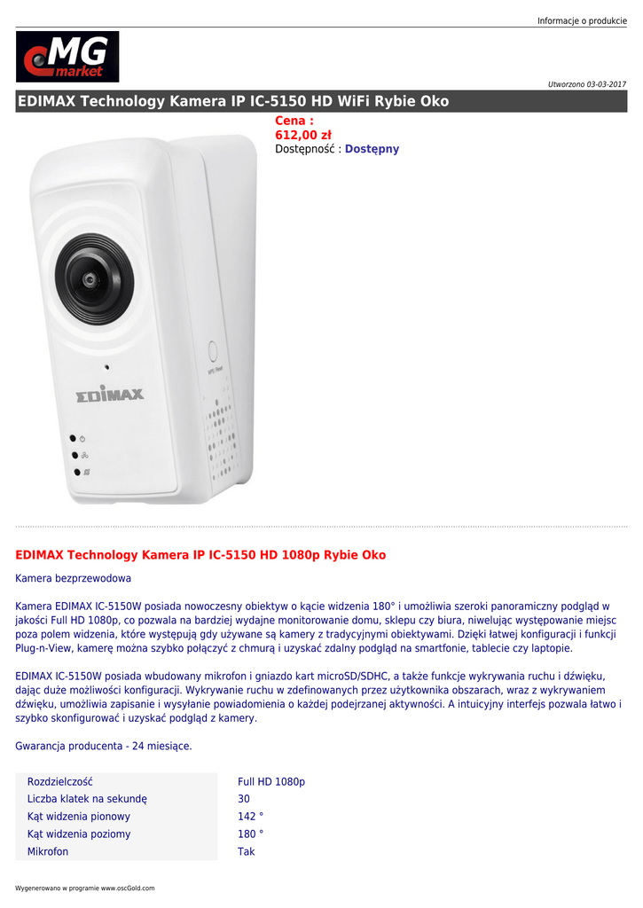 Informacje o produkcie Utworzono 03-03-2017 EDIMAX Technology Kamera IP IC-5150 HD WiFi Rybie Oko Cena : 612,00 zł Dostępność : Dostępny EDIMAX Technology Kamera IP IC-5150 HD 1080p Rybie Oko Kamera bezprzewodowa Kamera EDIMAX IC-5150W posiada nowoczesny obiektyw o kącie widzenia 180° i umożliwia szeroki panoramiczny podgląd w jakości Full HD 1080p, co pozwala na bardziej wydajne monitorowanie domu, sklepu czy biura, niwelując występowanie miejsc poza polem widzenia, które występują gdy używane są kamery z tradycyjnymi obiektywami. Dzięki łatwej konfiguracji i funkcji Plug-n-View, kamerę można szybko połączyć z chmurą i uzyskać zdalny podgląd na smartfonie, tablecie czy laptopie. EDIMAX IC-5150W posiada wbudowany mikrofon i gniazdo kart microSD/SDHC, a także funkcje wykrywania ruchu i dźwięku, dając duże możliwości konfiguracji. Wykrywanie ruchu w zdefinowanych przez użytkownika obszarach, wraz z wykrywaniem dźwięku, umożliwia zapisanie i wysyłanie powiadomienia o każdej podejrzanej aktywności. A intuicyjny interfejs pozwala łatwo i szybko skonfigurować i uzyskać podgląd z kamery. Gwarancja producenta - 24 miesiące. Rozdzielczość Full HD 1080p Liczba klatek na sekundę 30 Kąt widzenia pionowy 142 ° Kąt widzenia poziomy 180 ° Mikrofon Tak Wygenerowano w programie www.oscGold.com Wbudowane głośniki Tak Detekcja ruchu Tak Zarządzanie, monitorowanie, konfiguracja EDIMAX IC-5150 - EdiView Finder (Windows, MAC) - 16-kanałowe oprogramowanie do podglądu - Zarządzanie przez HTTP - Aktualizacja Firmware - EdiLife dla iPhone, iPad - EdiLife dla Android Protokoły sieciowe IPv4, HTTP, TCP, ICMP, RTSP, RTP, UDP, RTCP, SMTP, SNTP, FTP, DHCP, ARP, DNS, PPPoE Czytnik kart pamięci Tak Standard pamięci SD / CF • SD • SDHC Komunikacja bezprzewodowa WiFi Złącza • RJ-45 • 1 x USB 2.0 Zasilanie DC 12V, 1A Akcesoria w zestawie ADIMAX IC-5150 - Kamera sieciowa - Skrócona instrukcja obsługi - Płyta CD (instrukcja / oprogramowanie) - Zasilacz - Przewód Ethernet - Płaski zestaw montażowy - Ukośny zestaw montażowy Kolor Biały Wymiary 95 x 40 x 30mm Waga 75 g