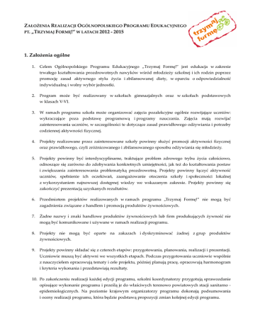 ZAŁOŻENIA REALIZACJI OGÓLNOPOLSKIEGO PROGRAMU EDUKACYJNEGO PT. „TRZYMAJ FORMĘ!” W LATACH 2012 - 2015 1. Założenia ogólne 1. Celem Ogólnopolskiego Programu Edukacyjnego „Trzymaj Formę!” jest edukacja w zakresie trwałego kształtowania prozdrowotnych nawyków wśród młodzieży szkolnej i ich rodzin poprzez promocję zasad aktywnego stylu życia i zbilansowanej diety, w oparciu o odpowiedzialność indywidualną i wolny wybór jednostki. 2. Program może być realizowany w szkołach gimnazjalnych oraz w szkołach podstawowych w klasach V-VI. 3. W ramach programu szkoła może organizować zajęcia pozalekcyjne ogólnie rozwijające uczniów: wykraczające poza podstawę programową i programy nauczania. Zajęcia mają rozwijać zainteresowania uczniów, w szczególności te dotyczące zasad prawidłowego odżywiania i potrzeby codziennej aktywności fizycznej. 4. Projekty realizowane przez zainteresowane szkoły powinny służyć promocji aktywności fizycznej oraz prawidłowego, czyli zróżnicowanego i zbilansowanego sposobu odżywiania się młodzieży. 5. Projekty powinny być interdyscyplinarne, traktujące problem zdrowego trybu życia całościowo, odnoszące się zarówno do zdobywania konkretnych umiejętności, jak też do kształtowania postaw i zwiększania zainteresowania problematyką prozdrowotną. Projekty powinny łączyć aktywność uczniów, spełnienie ich oczekiwań, zaangażowanie otoczenia szkoły i społeczności lokalnej z wykorzystaniem najnowszej dostępnej wiedzy we wskazanym zakresie. Projekty powinny się zakończyć prezentacją uzyskanych rezultatów. 6. Przedmiotem projektów realizowanych w ramach programu „Trzymaj Formę!” nie mogą być zagadnienia związane z handlem i promocją produktów żywnościowych. 7. Żadne nazwy i znaki handlowe produktów żywnościowych lub firm produkujących żywność nie mogą być komunikowane i używane w ramach realizacji programu. 8. Projekty nie mogą być oparte na zakazach i dyskryminować żadnej z grup produktów żywnościowych. 9. Projekty powinny składać się z czterech etapów: przygotowania, planowania, realizacji i prezentacji. Uczniowie muszą być aktywni we wszystkich etapach. Podczas przygotowania uczniowie wspólnie z nauczycielem opracowują tematy i cele projektu, później planują pracę, opracowują harmonogram i kryteria wykonania i przedstawiają rezultaty. 10. Po zakończeniu realizacji każdej edycji programu, szkolni koordynatorzy przygotują sprawozdanie opisujące wykonanie programu i prześlą je do właściwych terenowo powiatowych stacji sanitarno epidemiologicznych. Na poziomie krajowym organizatorzy programu dokonają podsumowania i oceny realizacji programu, która będzie podstawą propozycji zmian kolejnej edycji programu. 2. Założenia szczegółowe I. CEL GŁÓWNY: Zwiększenie świadomości uczestników Programu dotyczącej wpływu żywienia i aktywności fizycznej na zdrowie. II. CELE SZCZEGÓŁOWE: • Pogłębienie wiedzy o znaczeniu zbilansowanej diety i aktywności fizycznej dla organizmu człowieka. • Kształtowanie postaw i zachowań związanych z prawidłowym żywieniem, odpowiednią jakością zdrowotną żywności i aktywnością fizyczną. • Dostarczenie wiedzy o informacjach zamieszczonych na opakowaniach produktów spożywczych i umiejętności korzystania z nich. III. ADRESACI PROGRAMU: Uczniowie klas I-III gimnazjów, klas V-VI szkół podstawowych i ich rodzice. IV. UCZESTNICY PROGRAMU: • dyrekcje szkół, nauczyciele, społeczność szkolna, • pielęgniarki środowiska szkolnego, • władze wojewódzkie i lokalne oraz inni wg możliwości i potrzeb środowiskowych. V. CZAS TRWANIA PROGRAMU: • VII edycja – rok szkolny 2012/13, • VIII edycja – rok szkolny 2013/2014, • IX edycja – rok szkolny 2014/2015. VI. ORGANIZATORZY PROGRAMU: • Główny Inspektorat Sanitarny, • Polska Federacja Producentów Żywności Związek Pracodawców. VII. KOORDYNATORZY PROGRAMU: • poziom wojewódzki - Wojewódzkie Stacje Sanitarno - Epidemiologiczne, • poziom powiatowy - Powiatowe Stacje Sanitarno - Epidemiologiczne, • poziom szkolny - dyrekcje szkół. VIII. PARTNERZY I PATRONI PROGRAMU: Partnerzy: • Agencja Rynku Rolnego, • Instytut Medycyny Wsi. Patroni: • Ministerstwo Edukacji Narodowej, • Ministerstwo Zdrowia, • Ministerstwo Sportu i Turystyki, • Federacja Konsumentów, • Instytut Żywności i Żywienia, • Polskie Towarzystwo Badań nad Otyłością, IX. MATERIAŁY I POMOCE PROGRAMOWE: • poradnik dla szkolnych koordynatorów programu, • broszura dla młodzieży dotycząca zbilansowanej diety i znaczenia aktywności fizycznej, • plakat „Talerz Zdrowia”, • ulotka dla rodziców, • internetowa interaktywna strona edukacyjna (treści programowe, informowanie o znakowaniu żywności), X. TREŚCI PROGRAMOWE: Żywienie młodzieży – zbilansowana dieta Prawidłowo zbilansowana dieta: • Talerz zdrowia – grupy produktów i ich rola w codziennej diecie; • Rola podstawowych składników odżywczych; • Rozkład posiłków w ciągu dnia; • Wartość energetyczna podstawowych składników odżywczych: - Dzienne zalecenia żywieniowe dla młodzieży; - Zasady zdrowego żywienia dzieci i młodzieży w wieku szkolnym; - Alternatywne sposoby żywienia na przykładzie diety wegetariańskiej; - Zaburzenia stanu zdrowia i rozwoju związane z nieprawidłowym odżywianiem: • nadwaga i otyłość, • niedobór masy ciała, • anoreksja, bulimia (pomoc specjalisty). Aktywność fizyczna • Znaczenie aktywności fizycznej dla zdrowia: - pożądana aktywność fizyczna dla dzieci i młodzieży, - test wydolności fizycznej (ćwiczenia), - test sprawności fizycznej (ćwiczenia). • Przykłady z omówieniem metodycznym: - ćwiczenia mięśni brzucha, - ćwiczenia mięśni bioder, - ćwiczenia mięśni grzbietu, - ćwiczenia mięśni klatki piersiowej, - ćwiczenia oddechowe, - ćwiczenia utrzymywania popraw